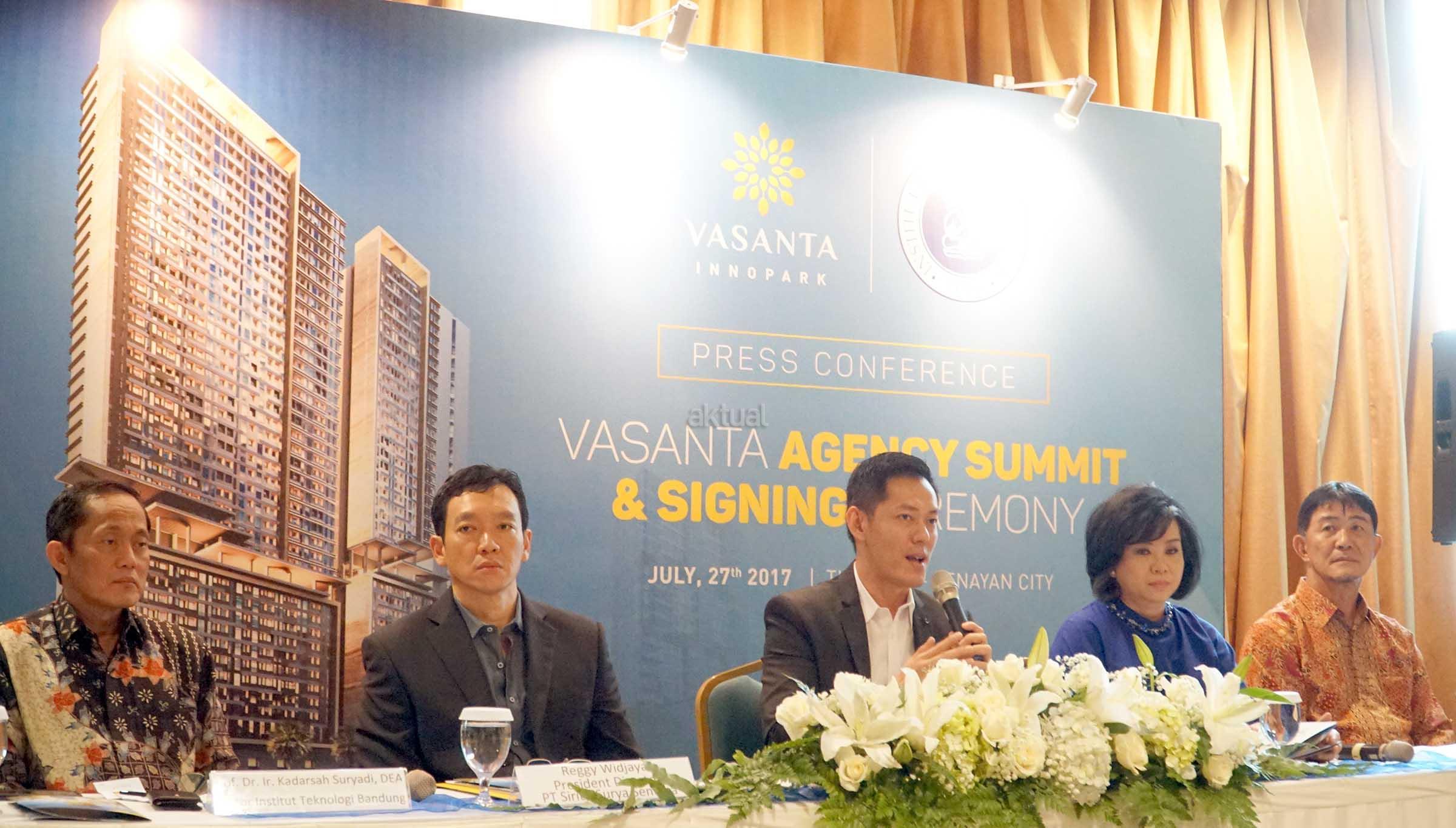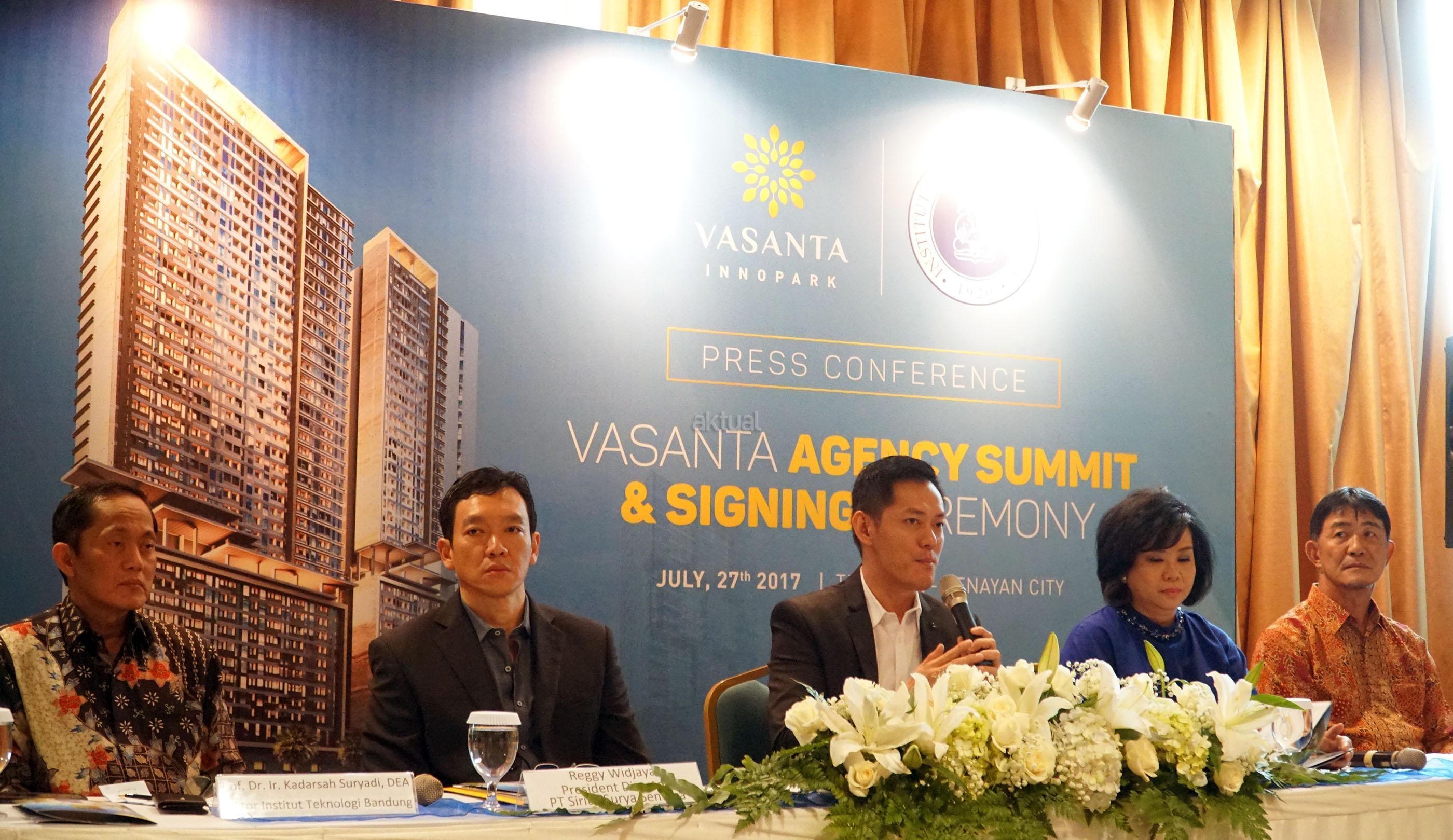 (dari kiri ke kanan) Rektor Institut Teknologi Bandung, Prof Dr Ir Kadarsyah Suryadi,Presiden Direktur PT Sirius Surya Sentosa (SSS) , Reggy Widjaja, Marketing Director PT Sirius Surya Sentosa, Ming Liang, Project Director SSS,Kimilia Wiharja, serta Komisaris PT Bekasi Fajar Industrial Tbk (pengelola kawasan Industri MM 2100), Yoshiro Kobi memberikan penjelasan kepada para media saat jumpa pers dan penandatangan kerjasama di Jakarta, Kamis (27/7). ITB akan memiliki kampus baru dan pusat penelitian di dalam Kawasan Vasanta Innopark,yakni sebuah superblok dengan konsep Integrated City Within a City yang kental dengan nuansa Jepang dan kemudahan akses di dalamnya. Vasanta Innopark yang terintegrasi dengan kawasan industri MM2100 berada sebuah CBD yang akan dibangun mulai awal tahun 2018 diatas lahan keseluruhan mencapai 100 ha. Tahap awal sebanyak 17 tower terdiri dari Apartemen,Serviced Apartemen, Condomunium,Mall,Shop Houses,Office Tower dan 4 Star Premier Hotel menyusul fasilitas lainnya yang telah terbangun seperti, rumah sakit Grha MM2100, Hotel enso. Selain Multilayer Park, Poyek Vasanta Innopark yang terletak di Cibitung,Bekasi akan dilengkapi fasilitas yang tergabung dalam 28 In 1 Integrated Facilities dan Amenities. Vasanta Innopark juga nantinya akan didukung infrastruktur yang memadai diantaranya akses Tol Jakarta-Cikampek II (elevated), Toll JORR 2 serta transportasi massal LRT rute Cawang- Bekasi, MRT rute Tangerang- Bekasi dan kereta cepat Jakarta- Bandung, secara keseluruhannya akan memberikan nilai investasi properti di Cibitung,Bekasi akan terus meningkat. AKTUAL/Eko S Hilman