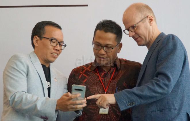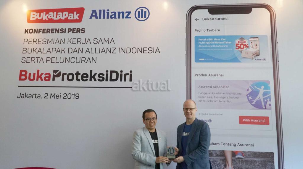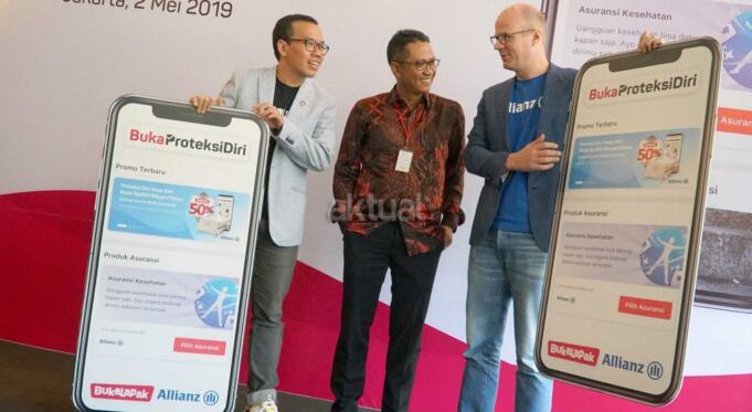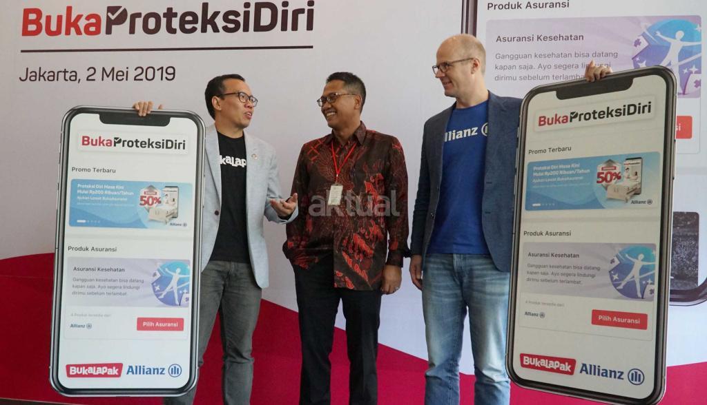Co Founder and President Bukalapak Fajrin Rasyid (dari kiri), berbincang dengan Deputi Direktur Pengawasan Asuransi Otoritas Jasa Keuangan I Wayan Wijana, Country Manager dan Direktur Utama Allianz Life Indonesia, Joos Louwerier saat peluncuran produk asuransi BukaProteksi Diri di Jakarta, Kamis (2/5). AKTUAL/STR-Eko S Hilman