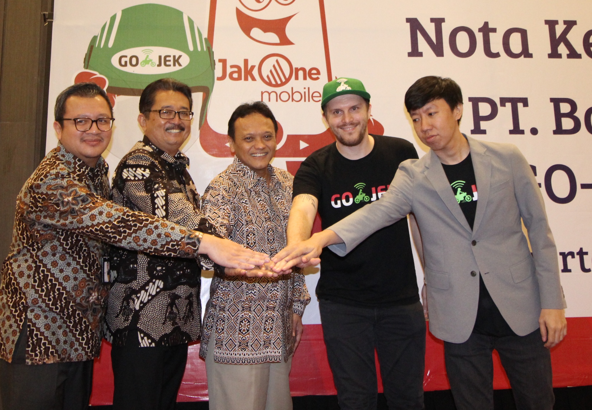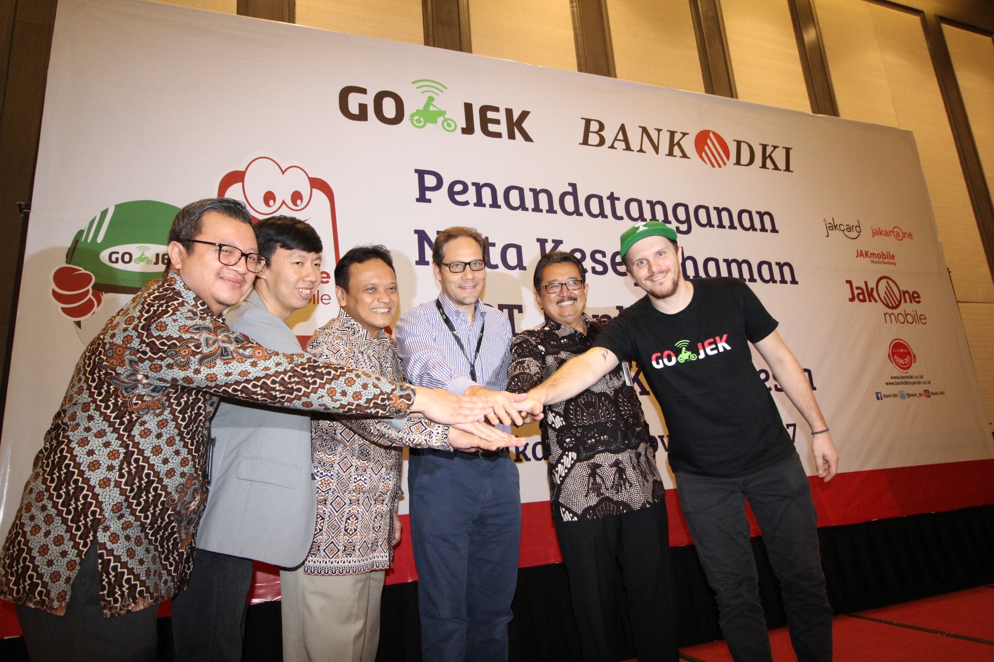 Bank DKI dan Gojek menjalin kerjasama sistem pembayaran non tunai di Jakarta, Selasa (7/11). Kerjasama tersebut mencakup interoperabilitas uang elektronik, interkoneksi ekosistem pembayaran dan perluasan channel pembayaran pajak dan retribusi. Ki-ka : VP Grup Pengembangan Dana & Jasa Bank DKI, Diki Jatnika, Direktur Bisnis Bank DKI, Antonius Widodo Mulyono, Direktur Teknologi & Operasional Bank DKI, Priagung Suprapto, Chief Marketing Officer Gojek Indonesia, Piotr Jakubowski dan GoPay Strategic Partnership Head, Vincent (bertumpuk tangan). AKTUAL/Eko S Hilman