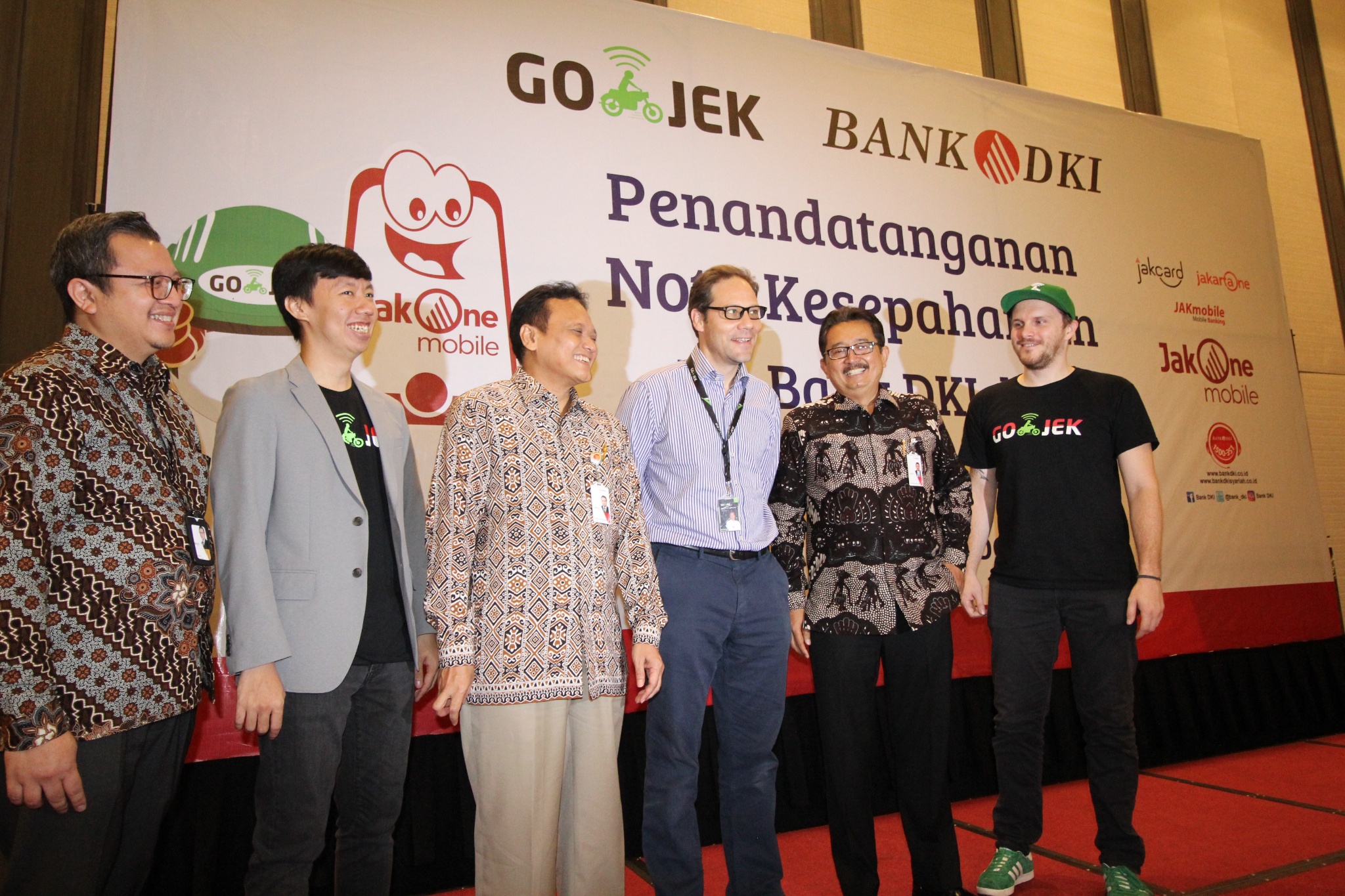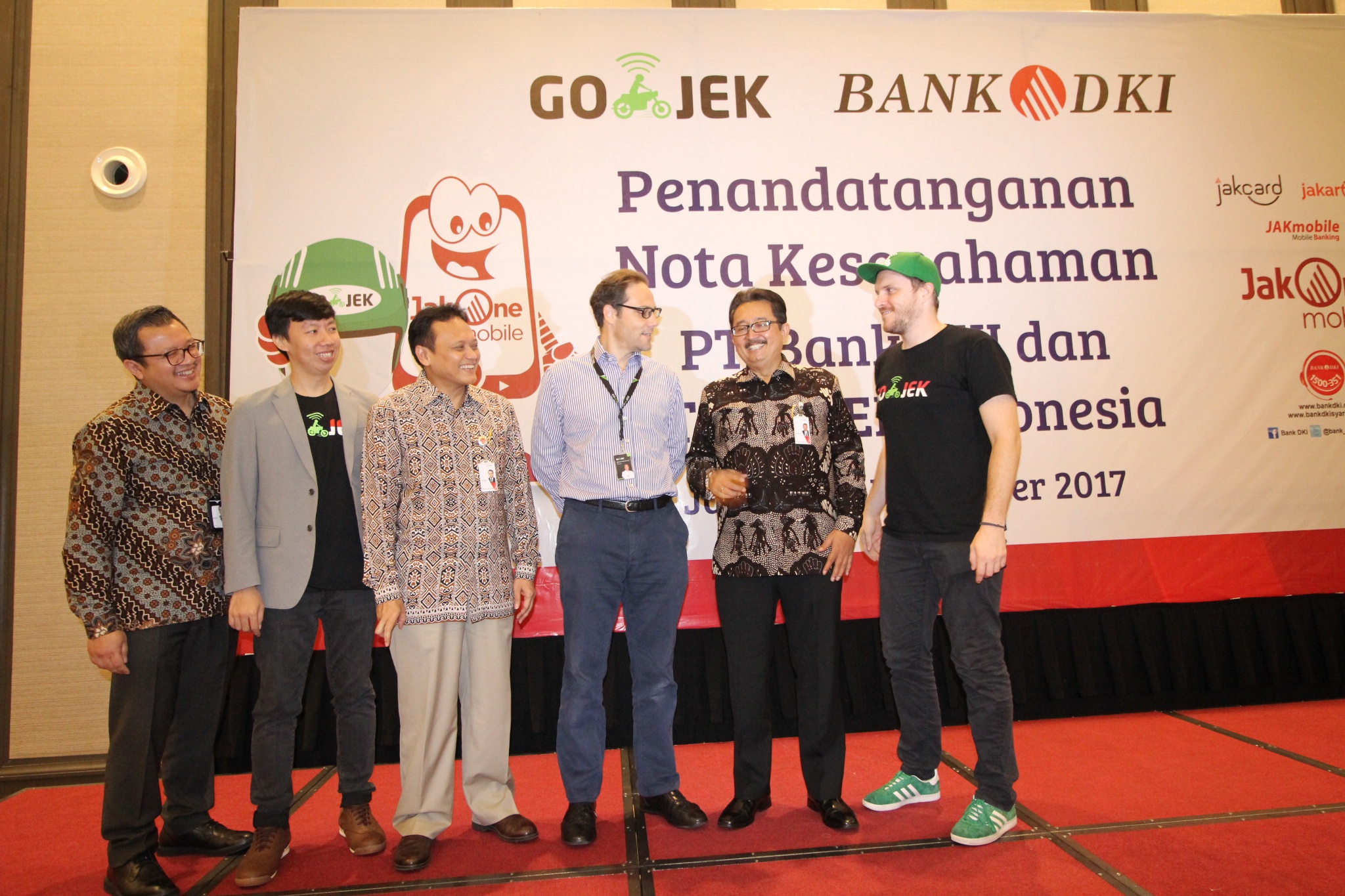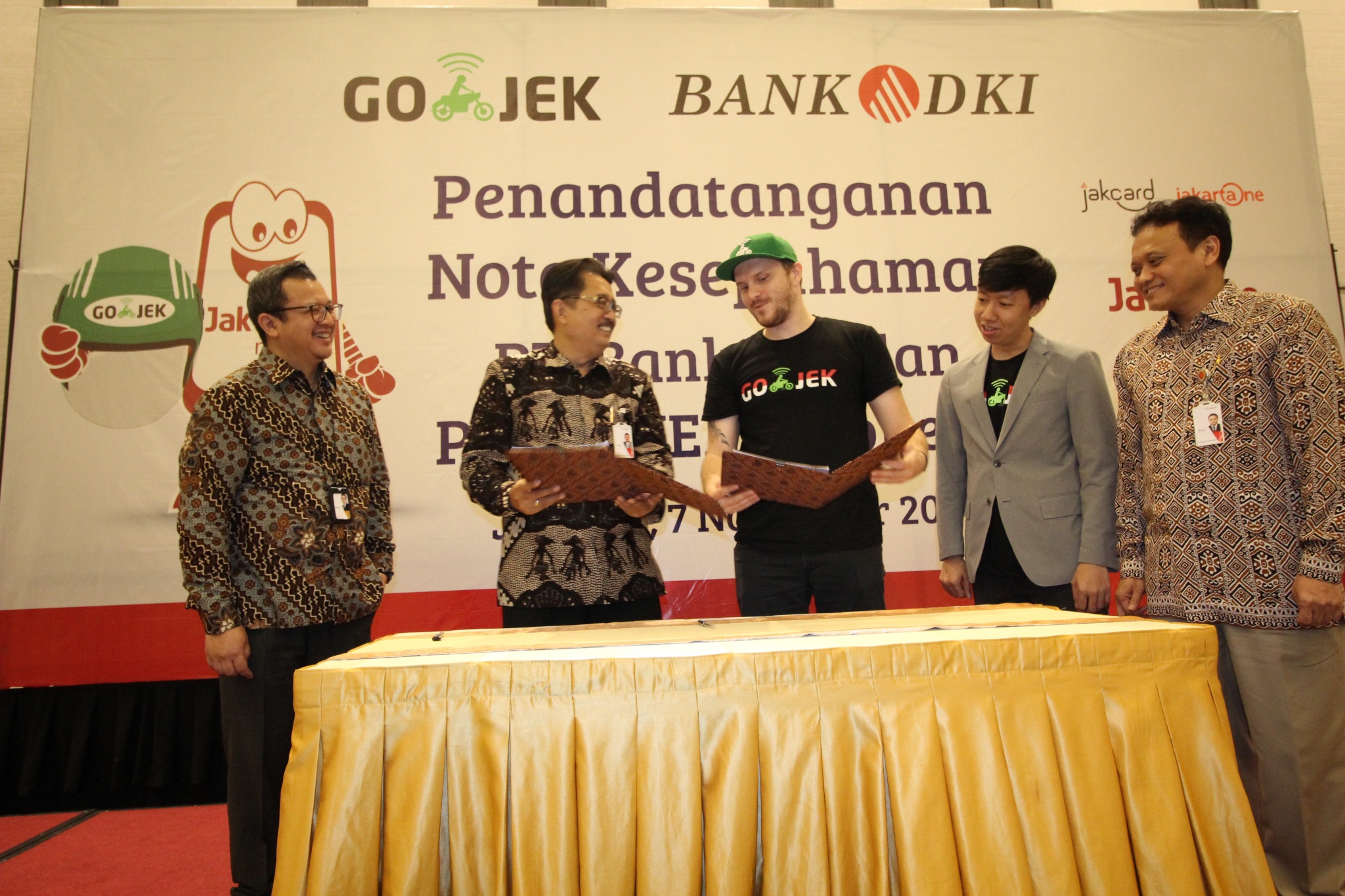 Bank DKI dan Gojek menjalin kerjasama sistem pembayaran non tunai di Jakarta, Selasa (7/11). Kerjasama tersebut mencakup interoperabilitas uang elektronik, interkoneksi ekosistem pembayaran dan perluasan channel pembayaran pajak dan retribusi. Ki-ka : VP Grup Pengembangan Dana & Jasa Bank DKI, Diki Jatnika, GoPay Strategic Partnership Head, Vincent, Direktur Teknologi & Operasional Bank DKI, Priagung Suprapto, Chief Commercial Gojek Indonesia, Antoine de Carbonnel, Direktur Bisnis Bank DKI, Antonius Widodo Mulyono, dan Chief Marketing Officer Gojek Indonesia, Piotr Jakubowski. AKTUAL/Eko S Hilman