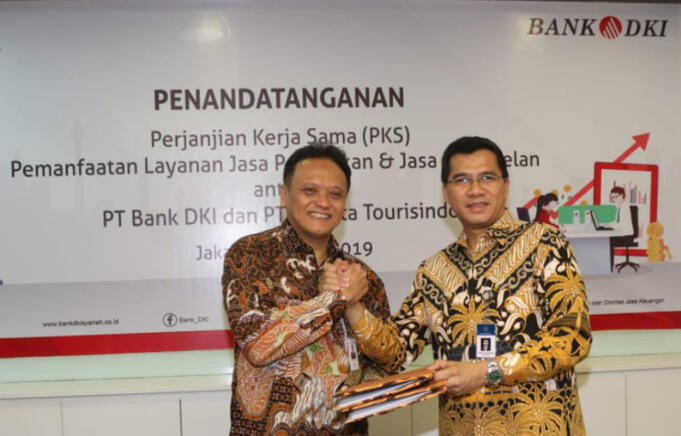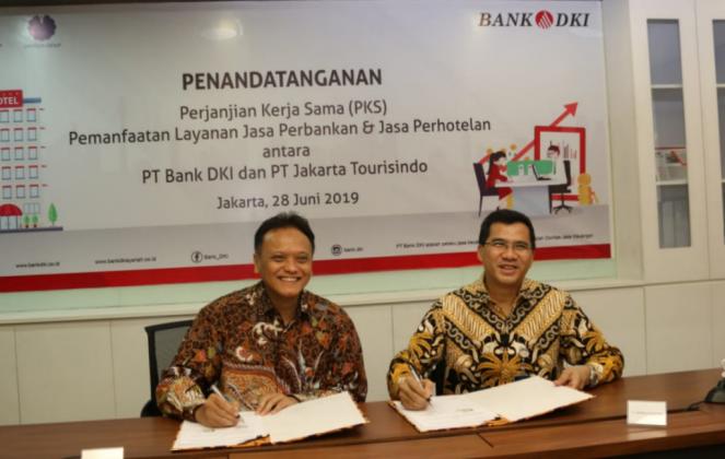 Direktur Teknologi & Operasional PT Bank DKI Priagung Suprapto (kiri) dan Direktur Utama PT Jakarta Tourisindo Geraard Jeffrey Z Rantung saat melakukan penandatanganan perjanjian kerjasama tentang Pemanfaatan Layanan Jasa perbankan & Jasa Perhotelan, di Jakarta, Jumat (28/6/2019). AKTUAL/Dok Bank DKI