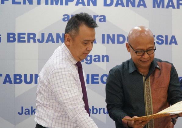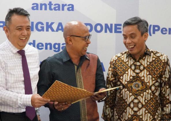 Dari kiri ke kanan, Direktur PT Bank Tabungan Negara (Persero) Tbk Oni Febriarto Rahardjo, Direktur Utama PT Kliring Berjangka Indonesia Fajar Wibihiyadi, Direktur BTN, Nixon Napitupulu berbincang seusai penandandatangan bersama di Jakarta, Rabu (27/2). AKTUAL/STR-Eko S Hilman