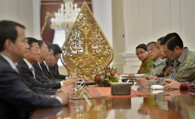 Presiden Joko Widodo (kedua kanan) berdialog dengan Wakil Perdana Menteri Tiongkok Yang Jiechi (ketiga kiri) didampingi Menlu Retno Marsudi (keempat kanan), Menko Perekonomian Darmin Nasution (ketiga kanan), serta Menko Polhukam Luhut Pandjaitan (kanan) membahas peningkatan kerja sama bilateral sektor ekonomi, di Istana Merdeka, Jakarta, Senin (9/5). Tiongkok menargetkan peningkatan investasi ekonomi di Indonesia sebesar 400 persen dari tahun 2015, dengan data perdagangan sebesar 44,4 miliar dolar AS. ANTARA FOTO/Yudhi Mahatma/pd/16