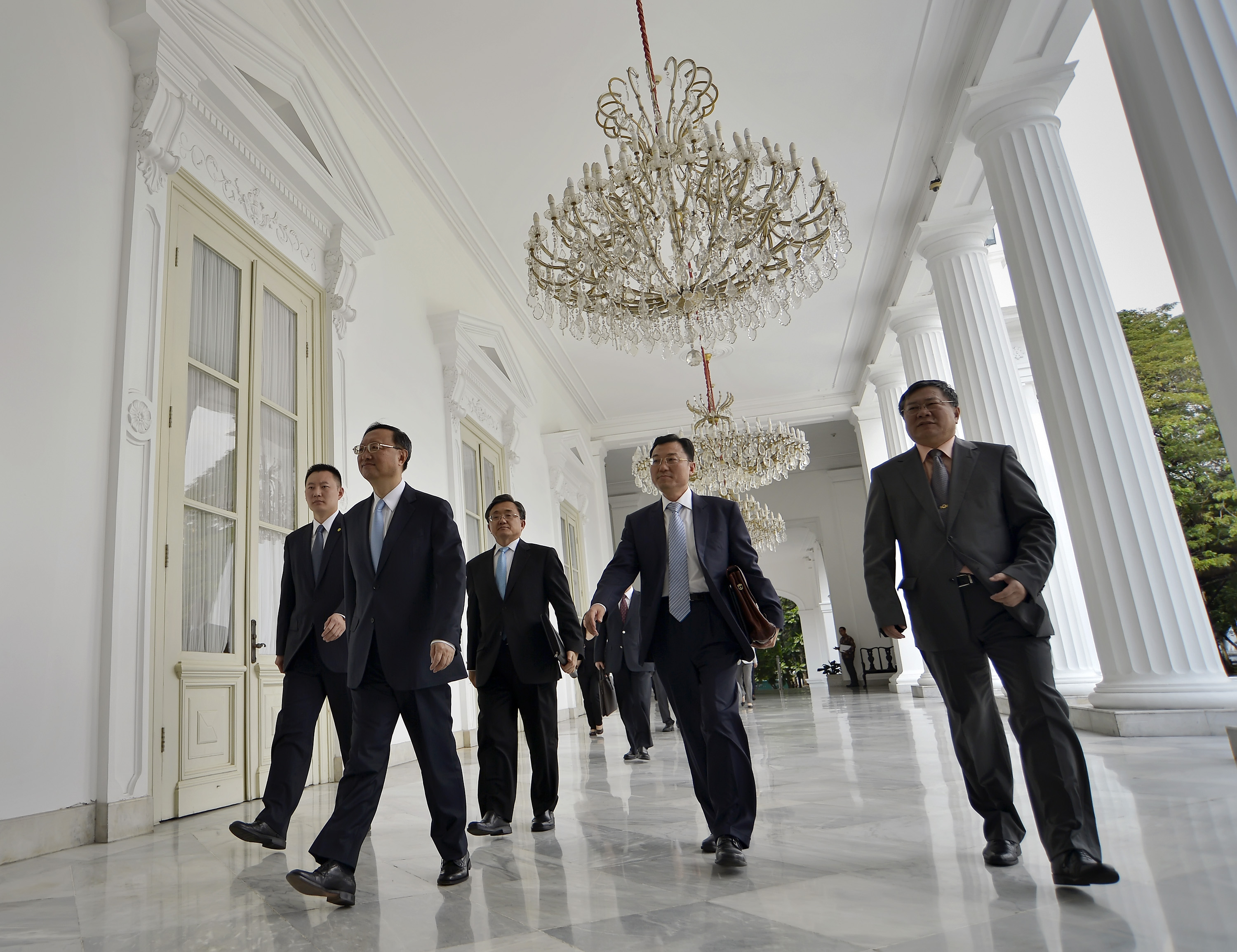 Wakil Perdana Menteri Tiongkok Yang Jiechi (kedua kiri) didampingi delegasi ekonomi Tiongkok bersiap menemui Presiden Joko Widodo membahas peningkatan kerja sama bilateral sektor ekonomi, di Istana Merdeka, Jakarta, Senin (9/5). Tiongkok menargetkan peningkatan investasi ekonomi di Indonesia sebesar 400 persen dari tahun 2015, dengan data perdagangan sebesar 44,4 miliar dolar AS. ANTARA FOTO/Yudhi Mahatma/pd/16