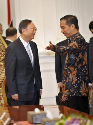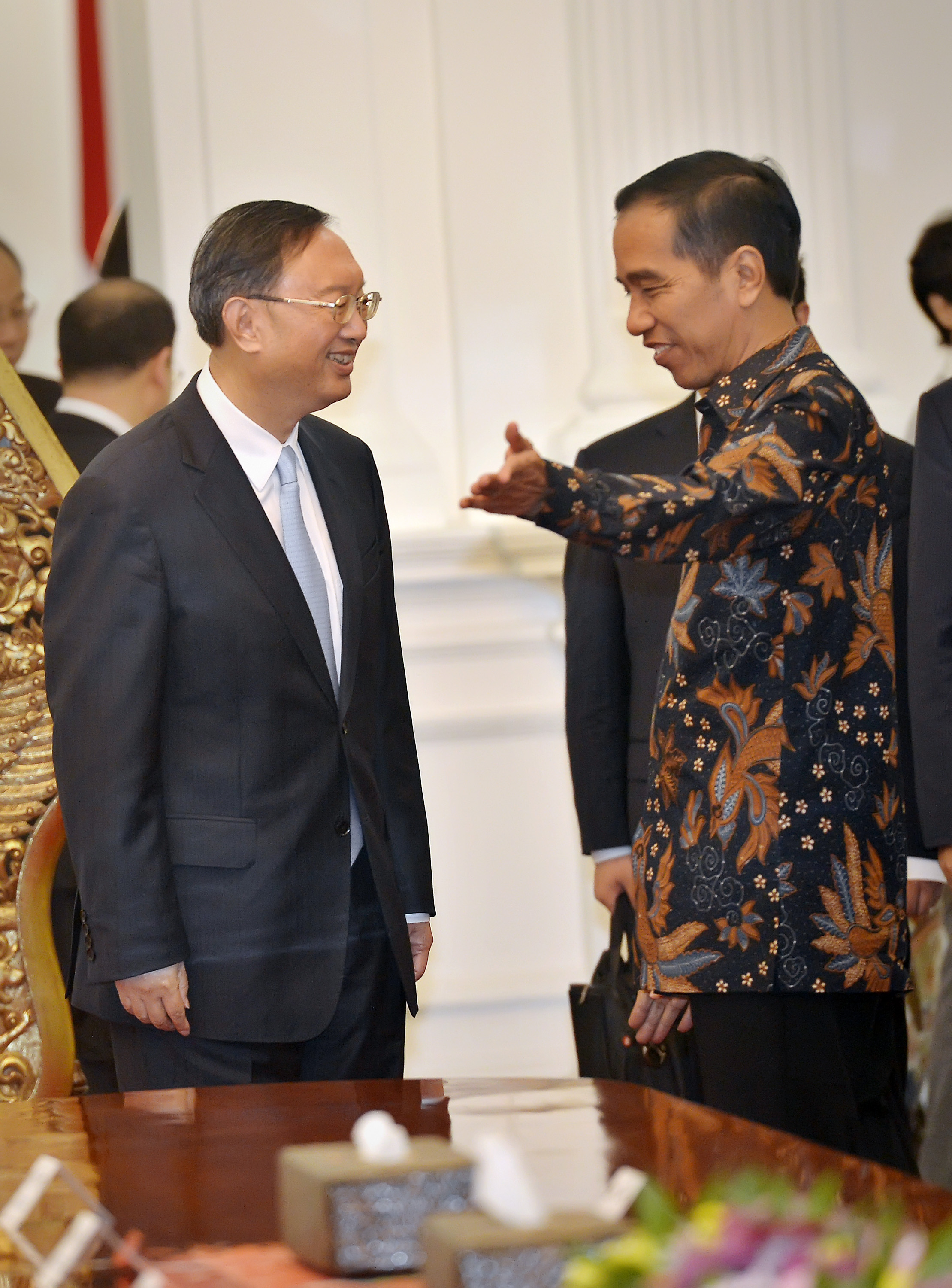 Presiden Joko Widodo (kanan) berdialog dengan Wakil Perdana Menteri Tiongkok Yang Jiechi (kiri) saat kunjungan kerja membahas peningkatan kerja sama bilateral sektor ekonomi, di Istana Merdeka, Jakarta, Senin (9/5). Tiongkok menargetkan peningkatan investasi ekonomi di Indonesia sebesar 400 persen dari tahun 2015, dengan data perdagangan sebesar 44,4 miliar dolar AS. ANTARA FOTO/Yudhi Mahatma/pd/16