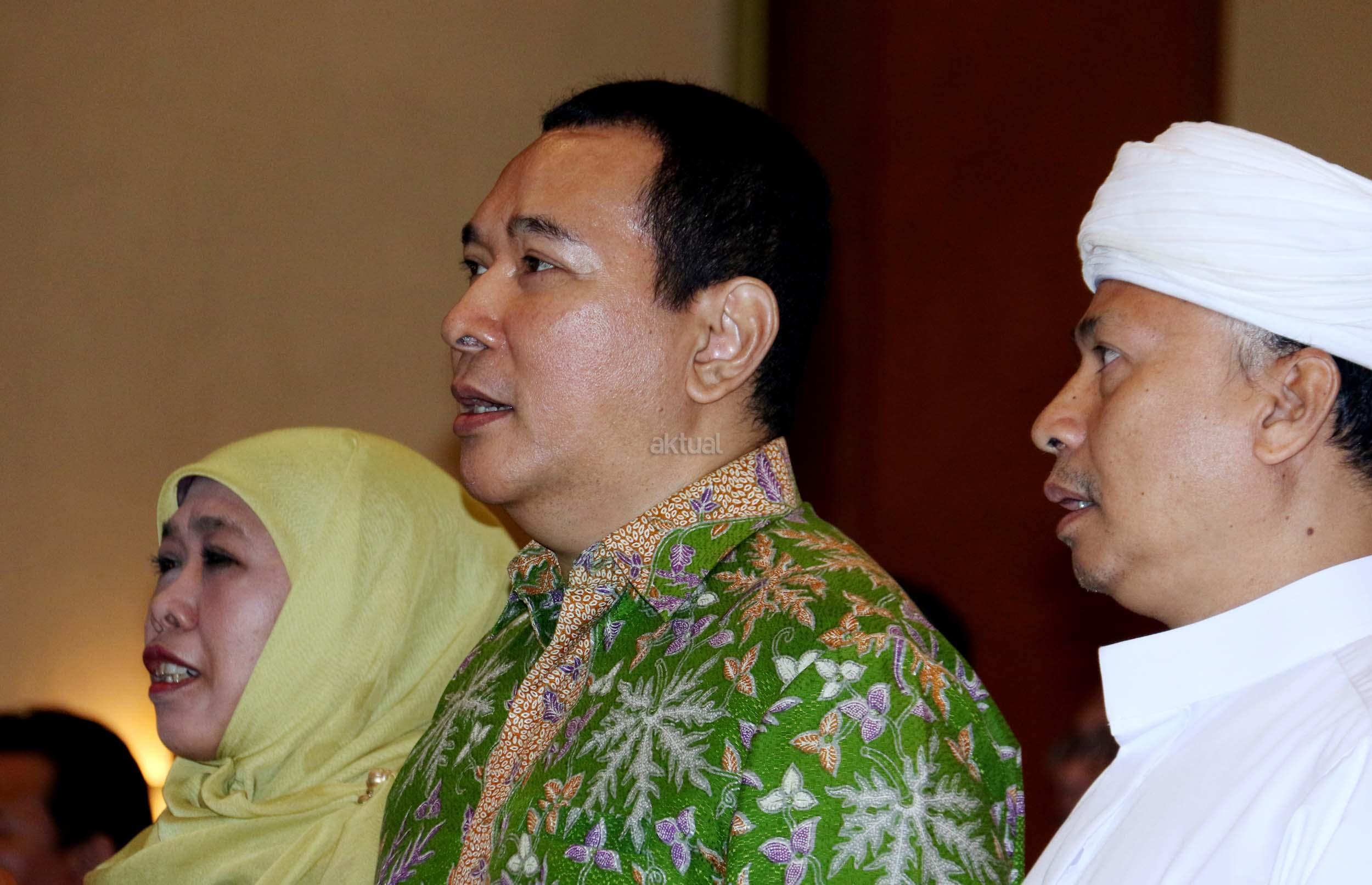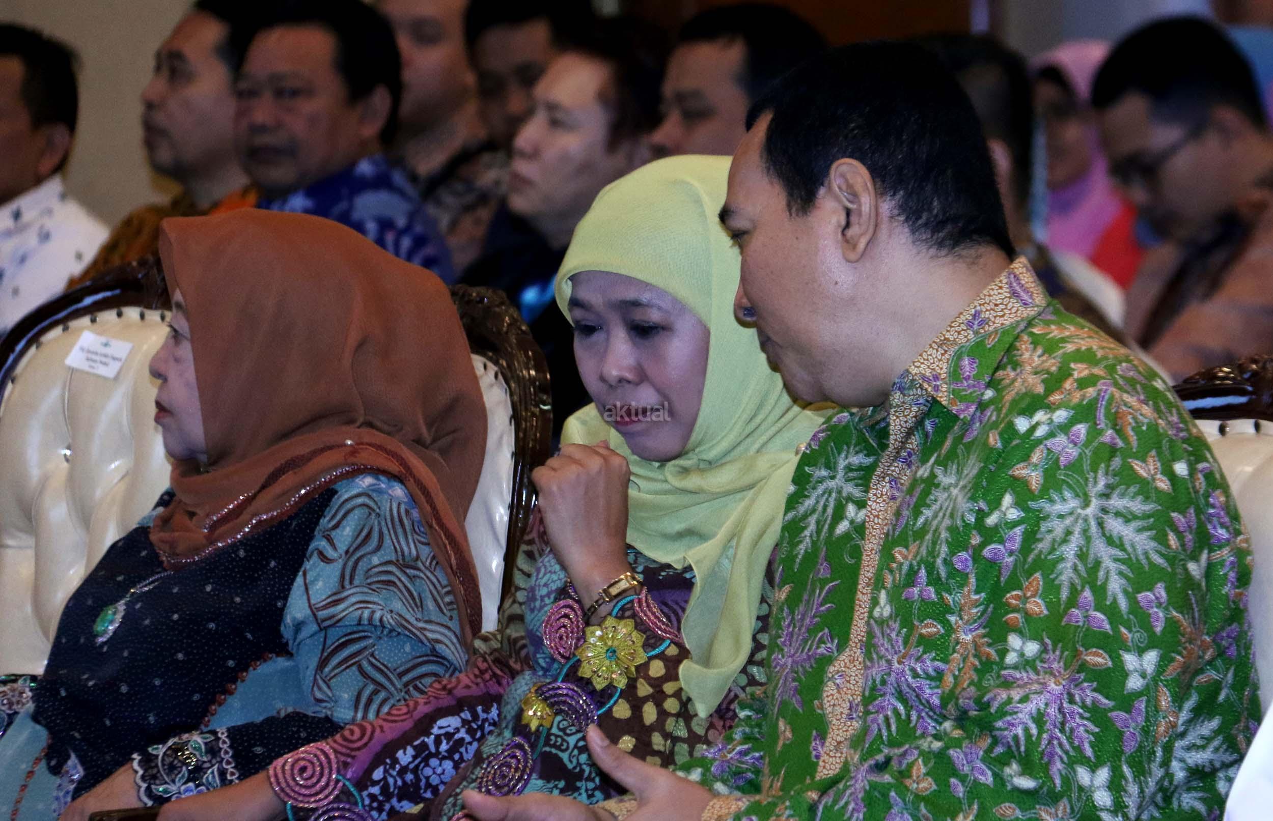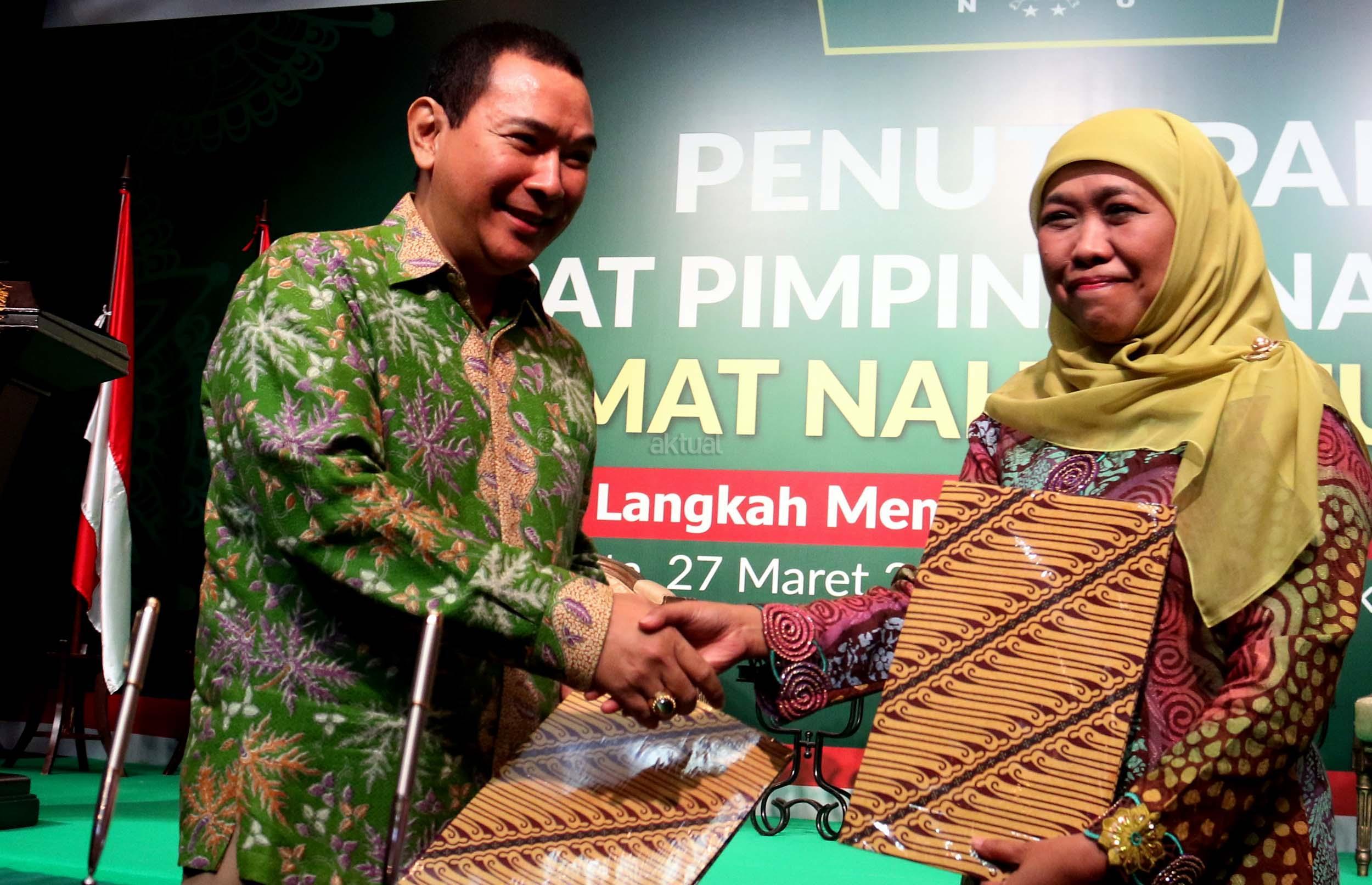 Ketua Umum DPP Muslimat NU Khofifah Indar Parawansa (kiri) dan Presiden Komisaris PT Humpuss Group Hutomo Mandala Putra (kanan) menghadiri acara penandatanganan nota kesepahaman antara Humpuss Group dengan Muslimat NU disela-sela acara Penutupan Rapimnas PP Muslimat NU di Jakarta, Senin (27/3/2017). Bentuk kerja sama yang dilakukan salah satunya dengan membangun kemitraan UMKM antara anggota muslimat NU dan PT Putri Satu Tujuh, salah satu perusahaan produsen gula yang dimiliki oleh Tommy Soeharto. AKTUAL/Munzir