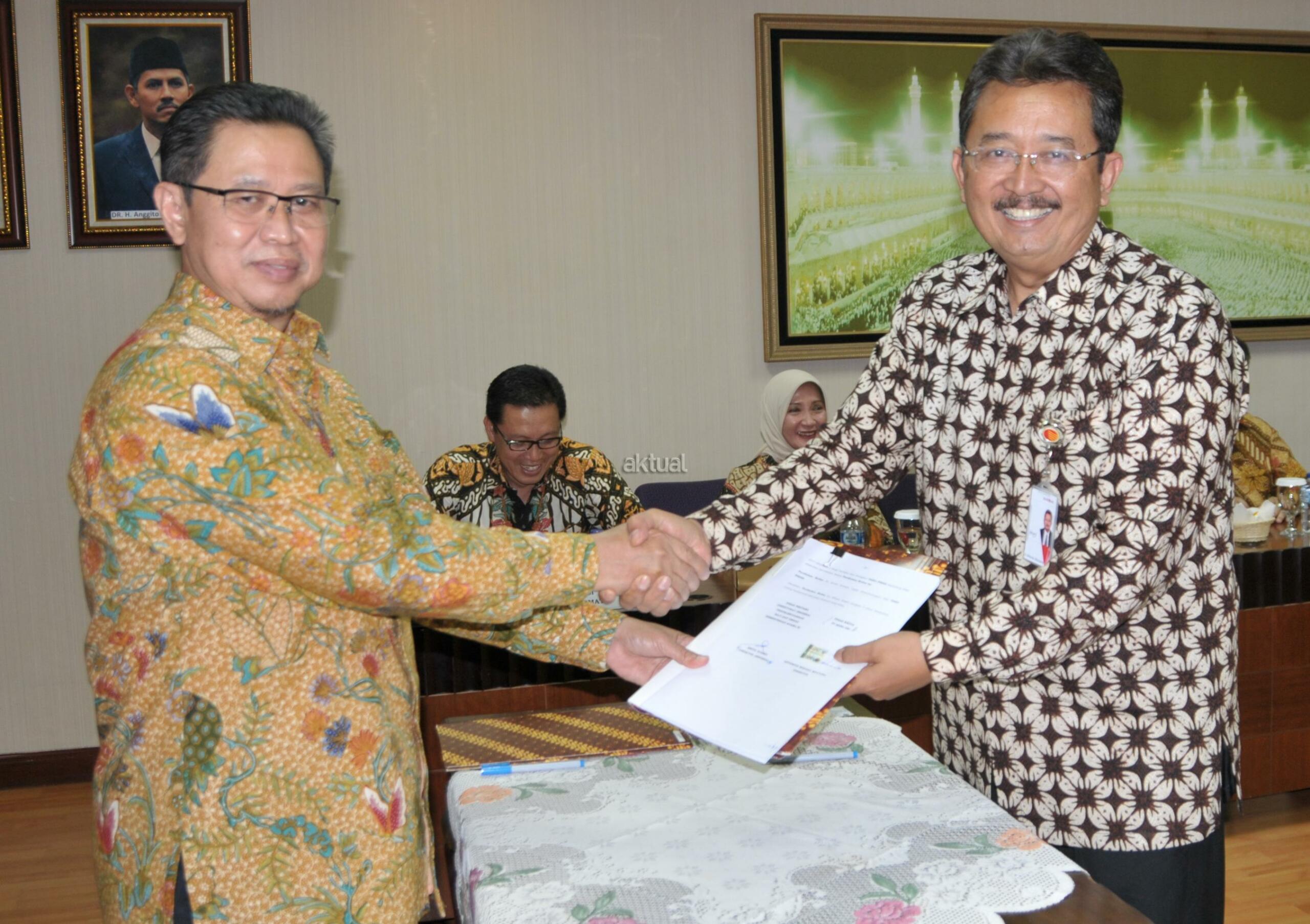 Direktur Bisnis Bank DKI, Antonius Widodo (kanan) menjabat tangan Direktur Jenderal Penyelenggara Haji dan Umrah Kementerian Agama RI, Abdul Djamil (kiri) usai penandatanganan perjanjian kerjasama Bank DKI dengan Kementerian Agama RI tentang penerimaan dan pembayaran biaya ibadah haji di Jakarta, Rabu (30/03). Bank DKI merupakan salah satu bank yang dipercaya untuk melayani pembayaran biaya ibadah haji di Indonesia. Aktual/Eko S Hilman