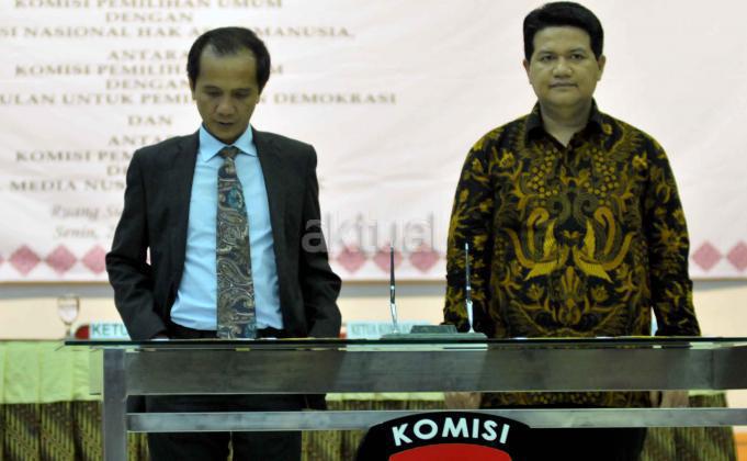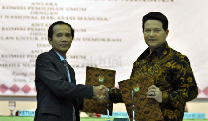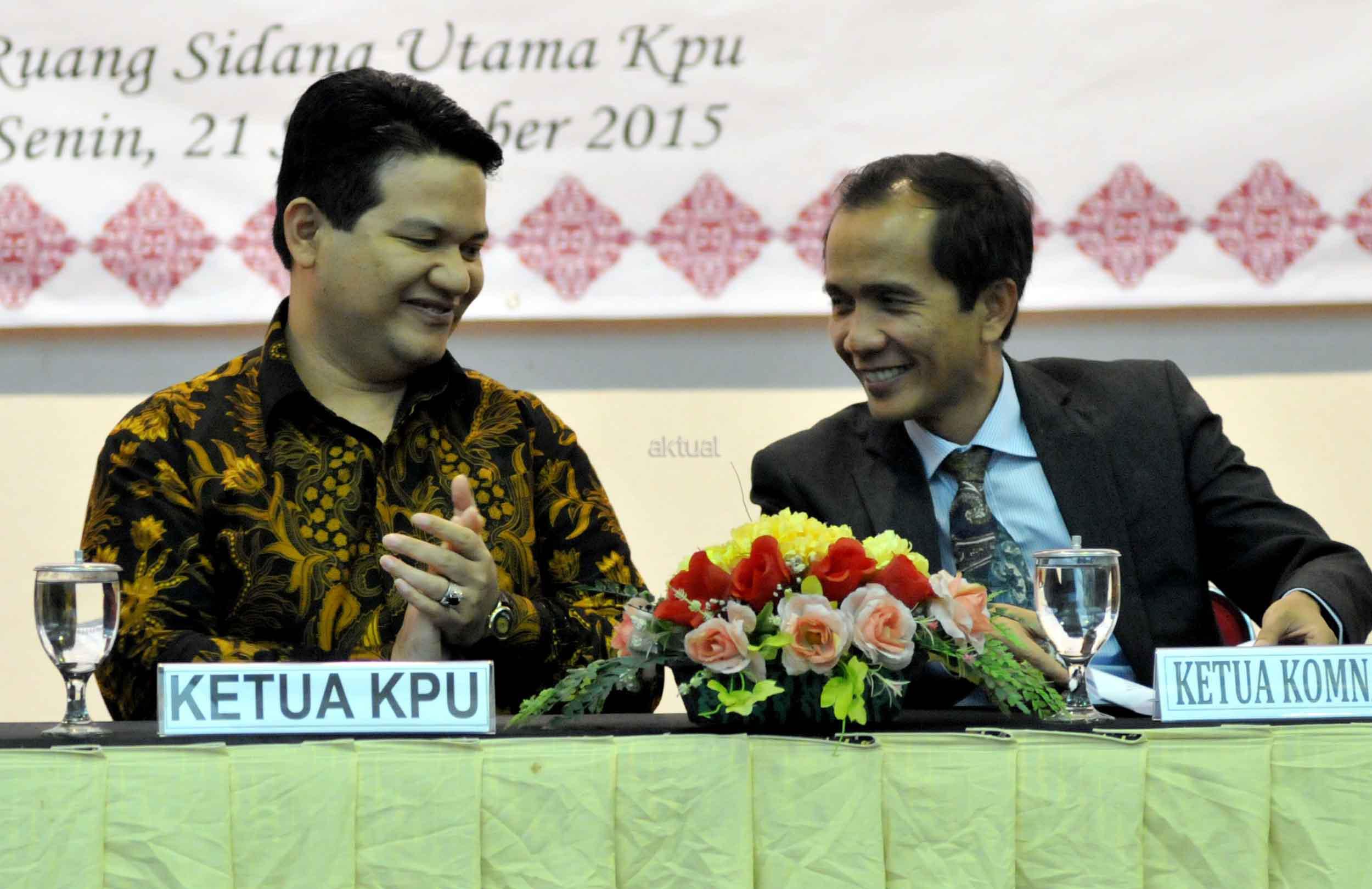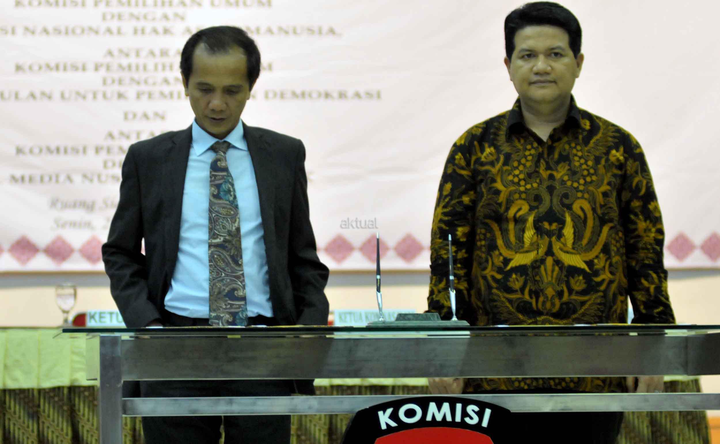 Ketua Komisi Pemilihan Umum (KPU) Husni Kamil Manik (kiri) berjabat tangan dengan Ketua Komisi Nasional Hak Asasi Manusia Nur Kholis (kanan) usai penandatanganan Nota Kesepahaman (MoU) di Ruang Sidang Utama KPU RI, Jakarta, Senin (21/9/2015). MoU dengan Komnas HAM ini dimaksudkan untuk meningkatkan kualitas perlidungan dan pemenuhan HAM dalam penyelnggaraan pemilu dan pilkada.