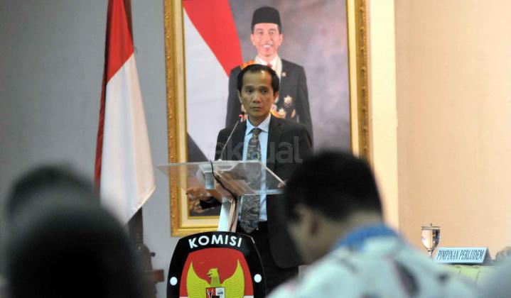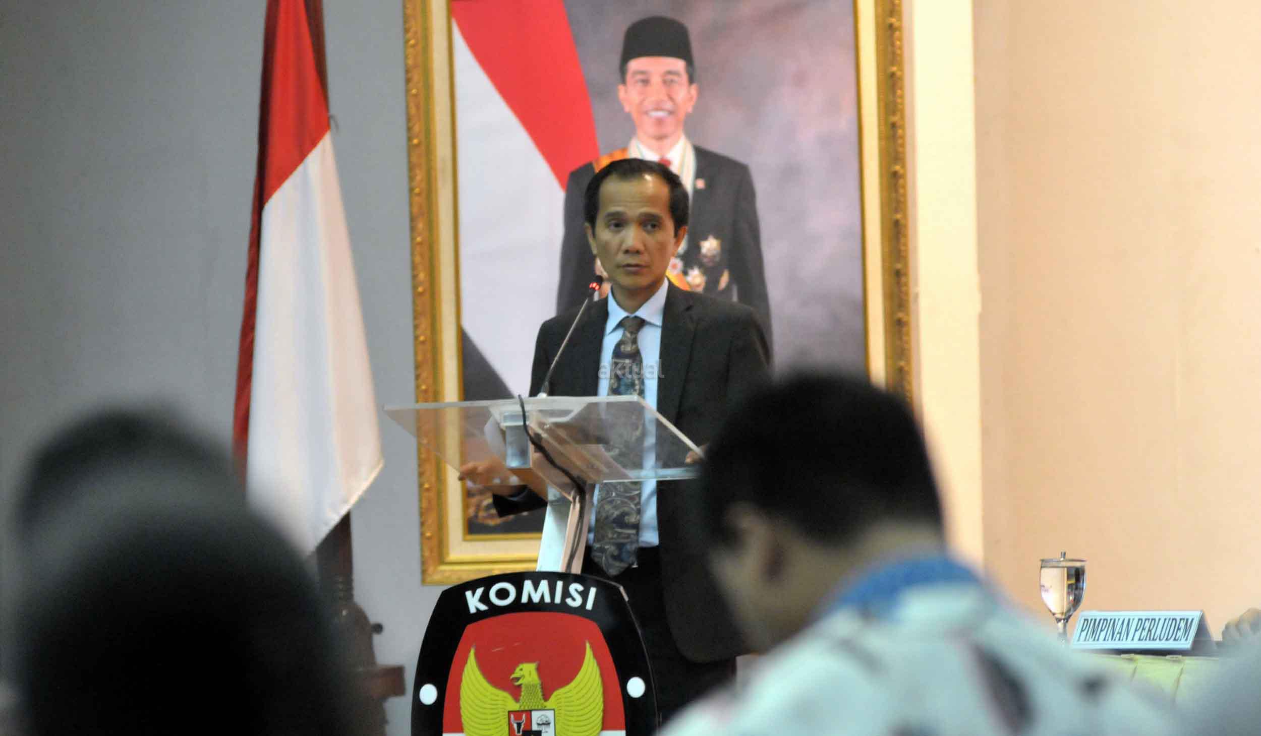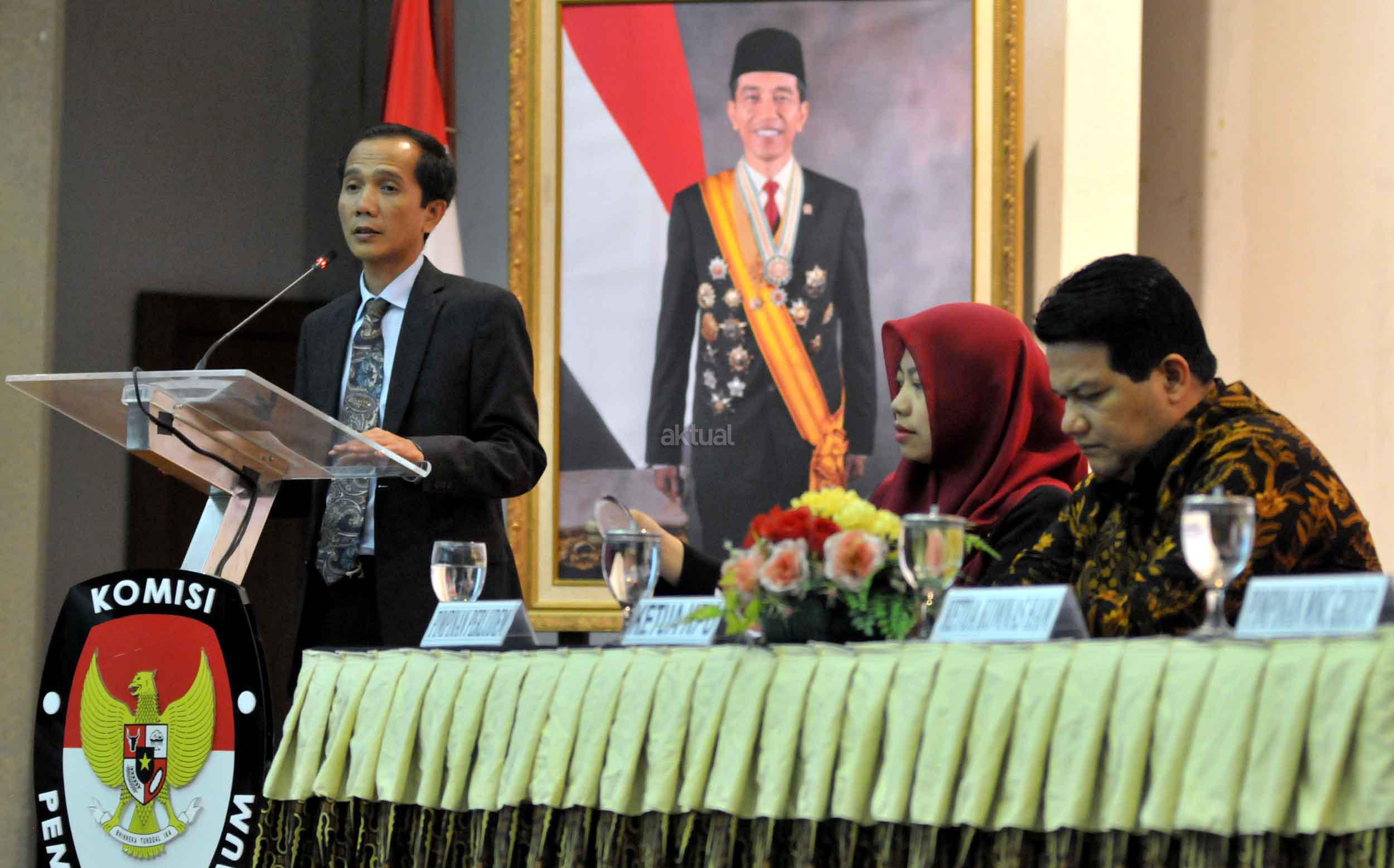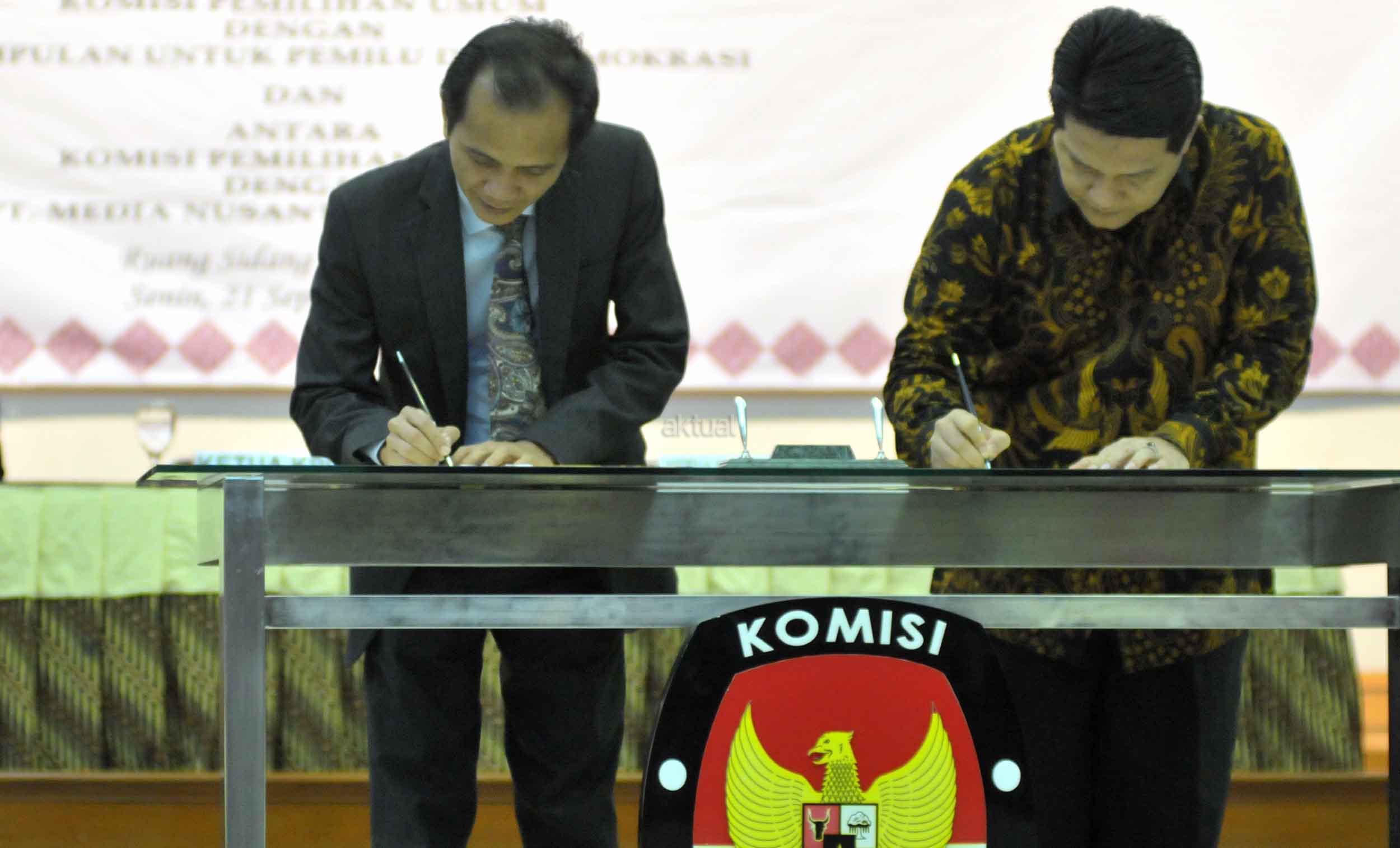 Ketua Komisi Pemilihan Umum (KPU) Husni Kamil Manik (kiri) berjabat tangan dengan Ketua Komisi Nasional Hak Asasi Manusia Nur Kholis (kanan) usai penandatanganan Nota Kesepahaman (MoU) di Ruang Sidang Utama KPU RI, Jakarta, Senin (21/9/2015). MoU dengan Komnas HAM ini dimaksudkan untuk meningkatkan kualitas perlidungan dan pemenuhan HAM dalam penyelnggaraan pemilu dan pilkada.