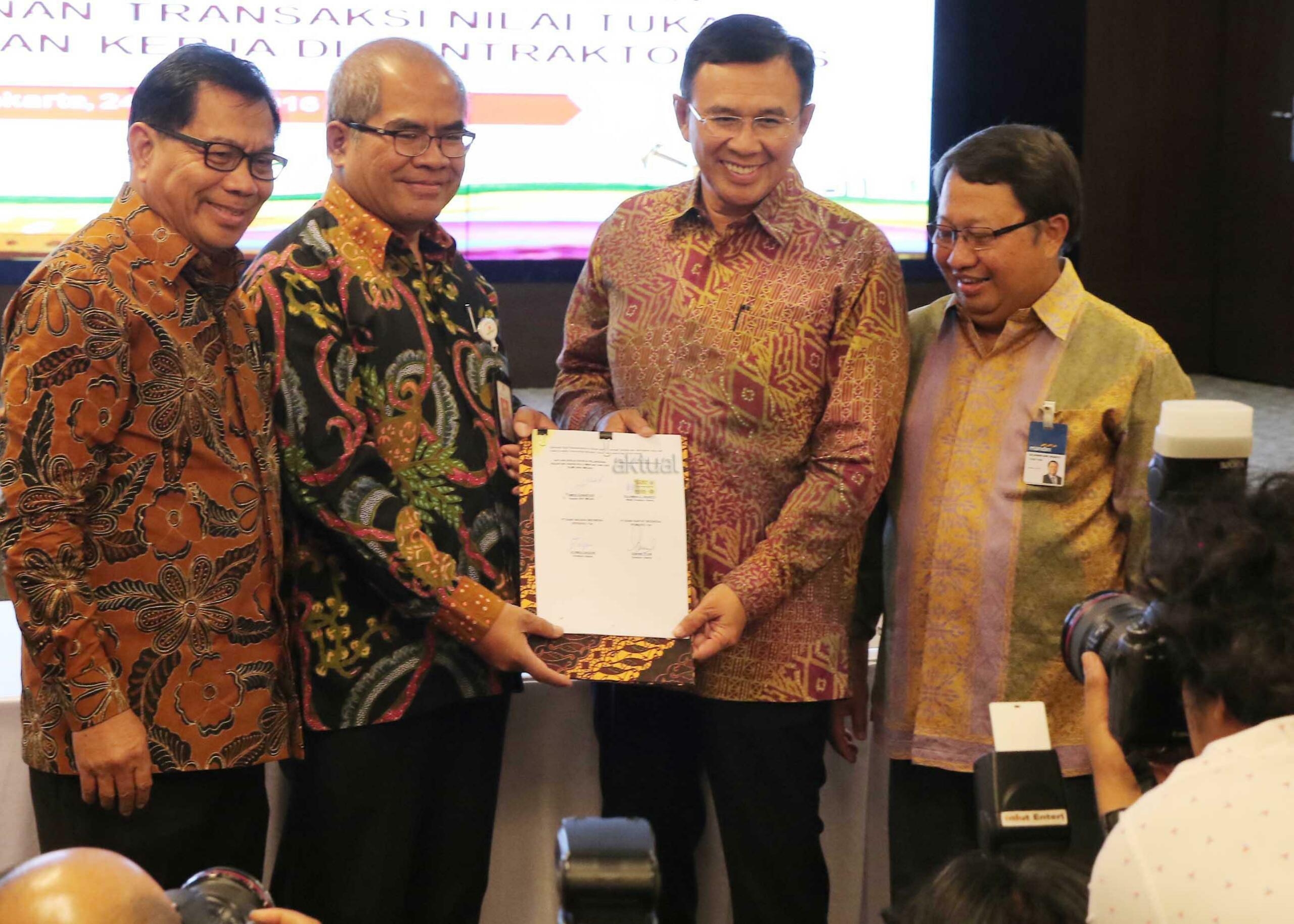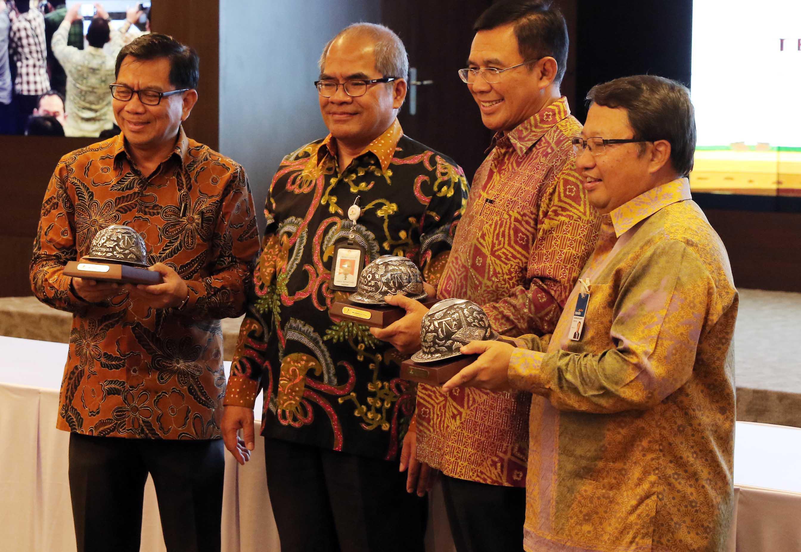 Kepala SKK Migas Amien Sunaryadi (kedua kiri) bersama Dirut Bank BNI Ahmad Baequni (kedua kanan), Dirut Bank BRI Asmawi Syam (kiri) serta Wakil Dirut Bank Mandiri Sulaiman A Arianto (kanan) menunjukkan dokumen nota kesepahaman kerjasama penyediaan layanan transaksi nilai tukar terhadap kontraktor migas dan vendor, Jakarta, Kamis (24/3). Perbankan Nasional menjadi tempat penyimpanan dana pemulihan pasca operasi (ASR), hingga 29 Februari 2016 mencapai 177 Juta US dollar, selain itu juga dipercaya menjadi Tristee Paying Agent untuk mengelola penjualan migas. Aktual/Tino OKtaviano