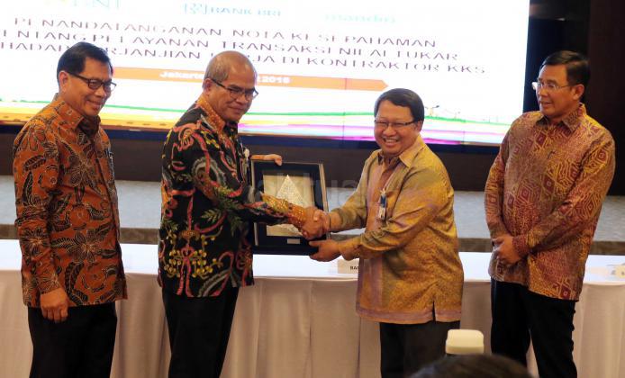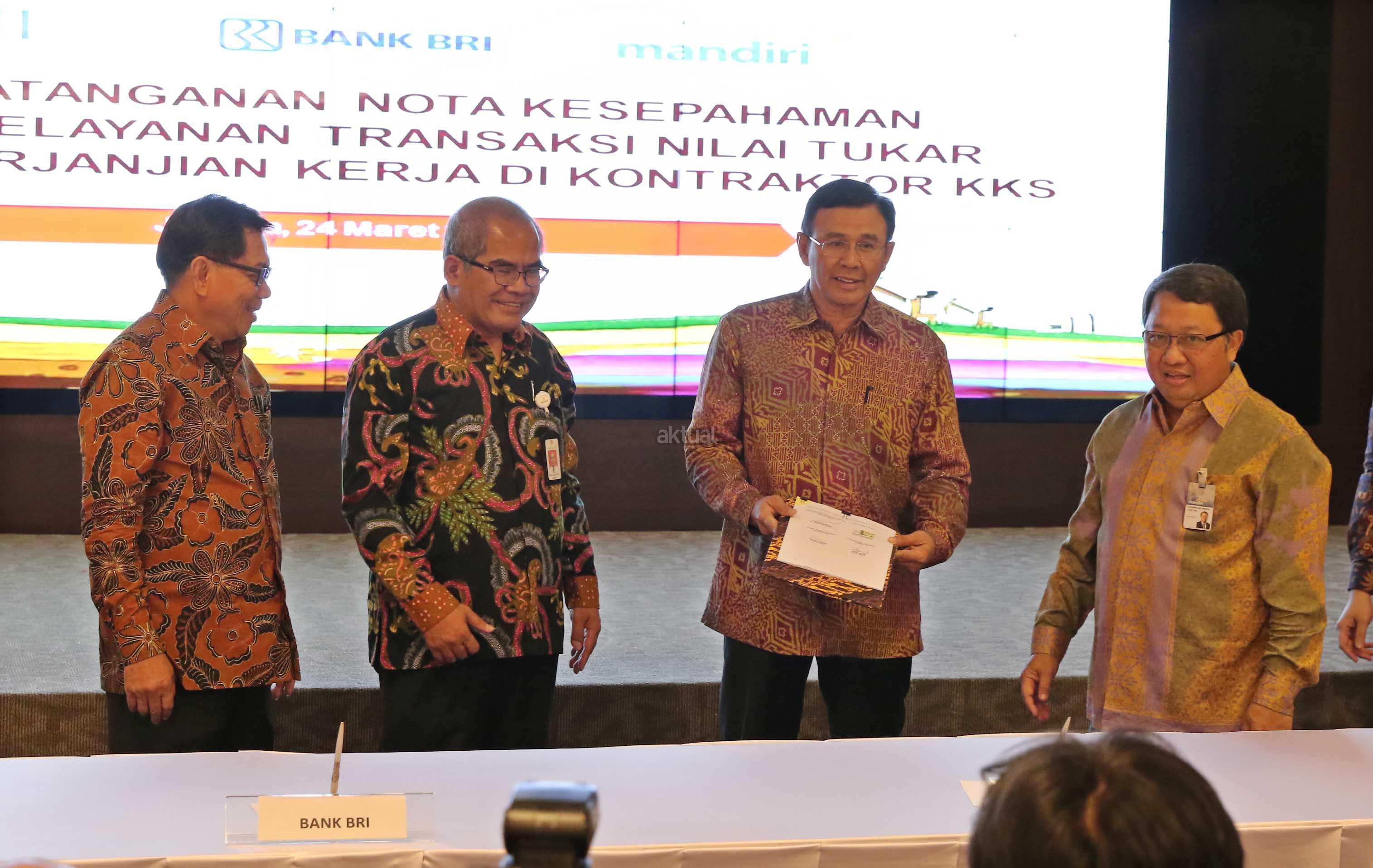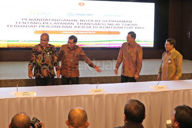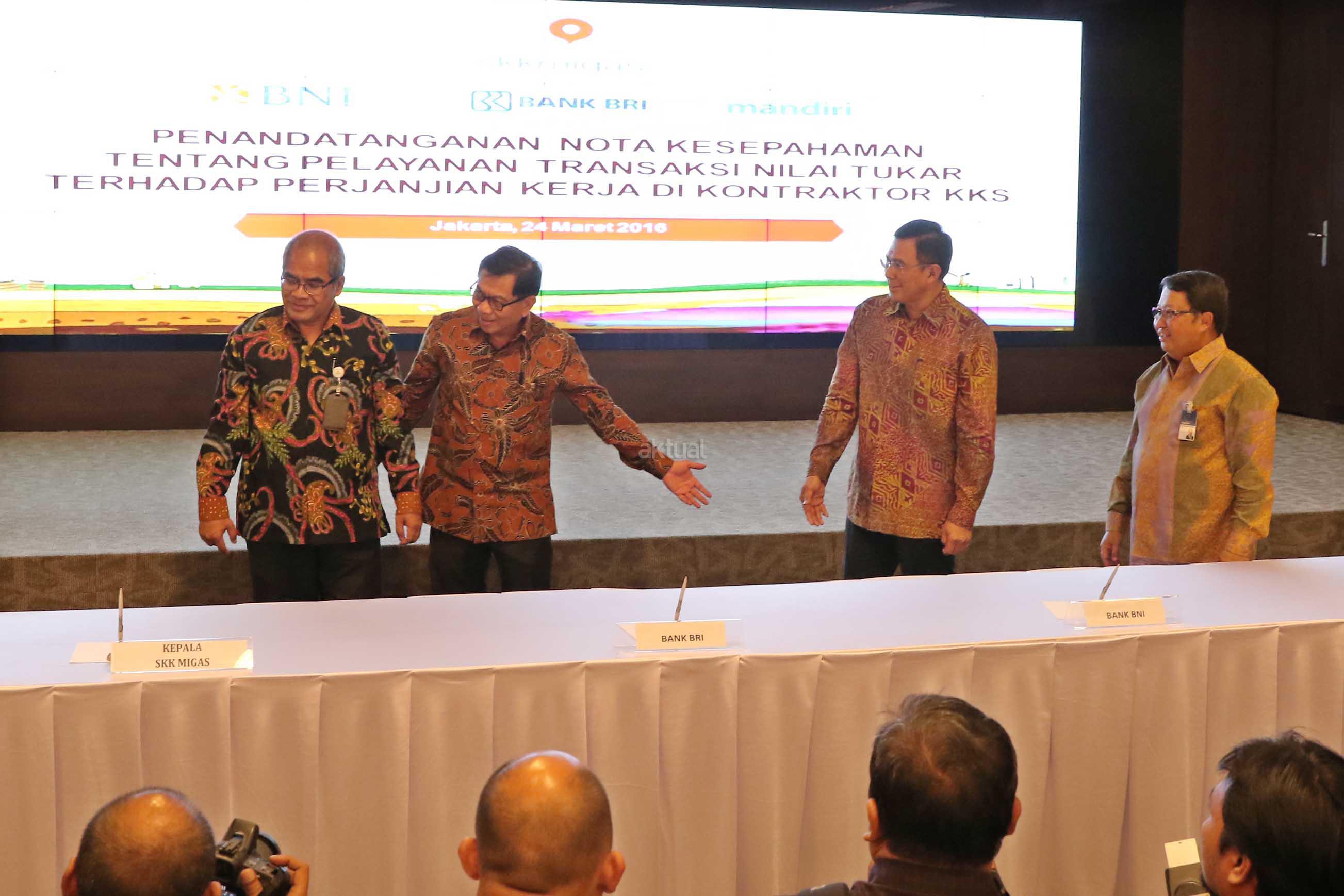 Kepala SKK Migas Amien Sunaryadi (kedua kiri) bersama Dirut Bank BNI Ahmad Baequni (kiri), Dirut Bank BRI Asmawi Syam (kedua kanan) serta Wakil Dirut Bank Mandiri Sulaiman A Arianto (kanan) saat akan menandatangani nota kesepahaman kerjasama penyediaan layanan transaksi nilai tukar terhadap kontraktor migas dan vendor, Jakarta, Kamis (24/3). Perbankan Nasional menjadi tempat penyimpanan dana pemulihan pasca operasi (ASR), hingga 29 Februari 2016 mencapai 177 Juta US dollar, selain itu juga dipercaya menjadi Tristee Paying Agent untuk mengelola penjualan migas. Aktual/Tino OKtaviano