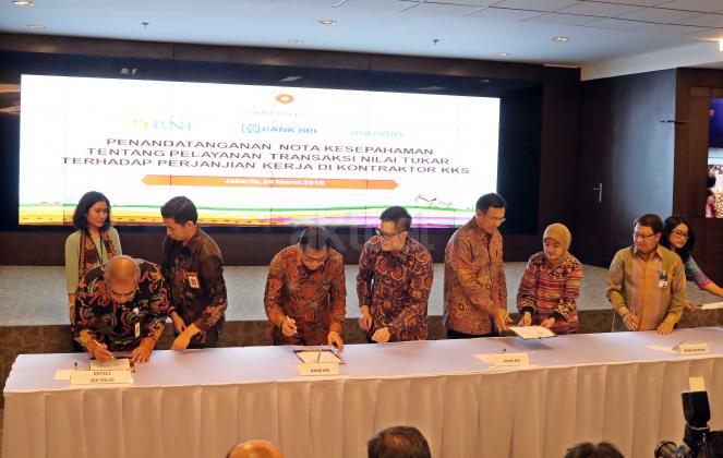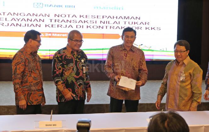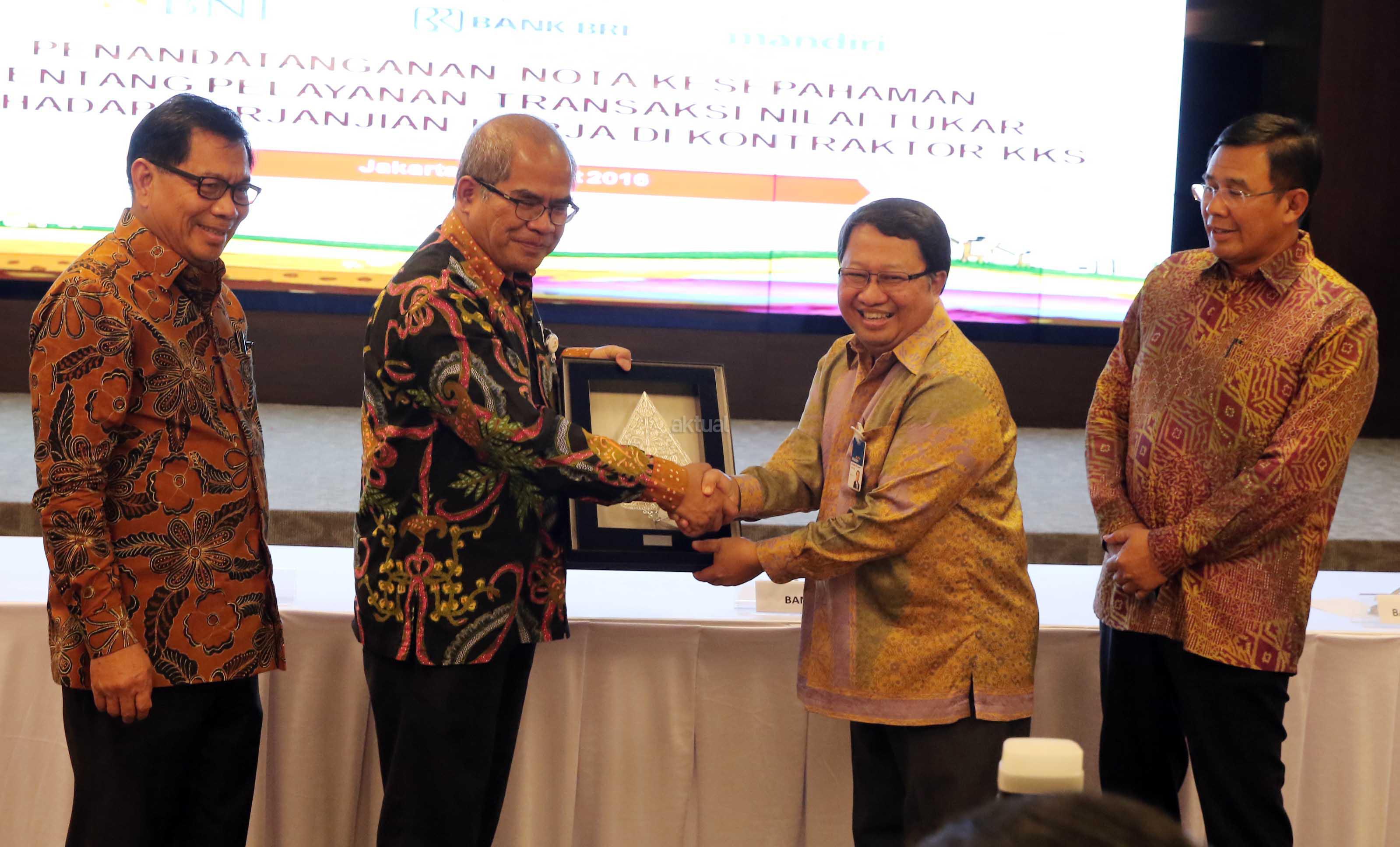 Kepala SKK Migas Amien Sunaryadi (kedua kiri) bersama Dirut Bank BNI Ahmad Baequni (kedua kanan), Dirut Bank BRI Asmawi Syam (kiri) serta Wakil Dirut Bank Mandiri Sulaiman A Arianto (kanan) saat menandatangani nota kesepahaman kerjasama penyediaan layanan transaksi nilai tukar terhadap kontraktor migas dan vendor, Jakarta, Kamis (24/3). Perbankan Nasional menjadi tempat penyimpanan dana pemulihan pasca operasi (ASR), hingga 29 Februari 2016 mencapai 177 Juta US dollar, selain itu juga dipercaya menjadi Tristee Paying Agent untuk mengelola penjualan migas. Aktual/Tino OKtaviano