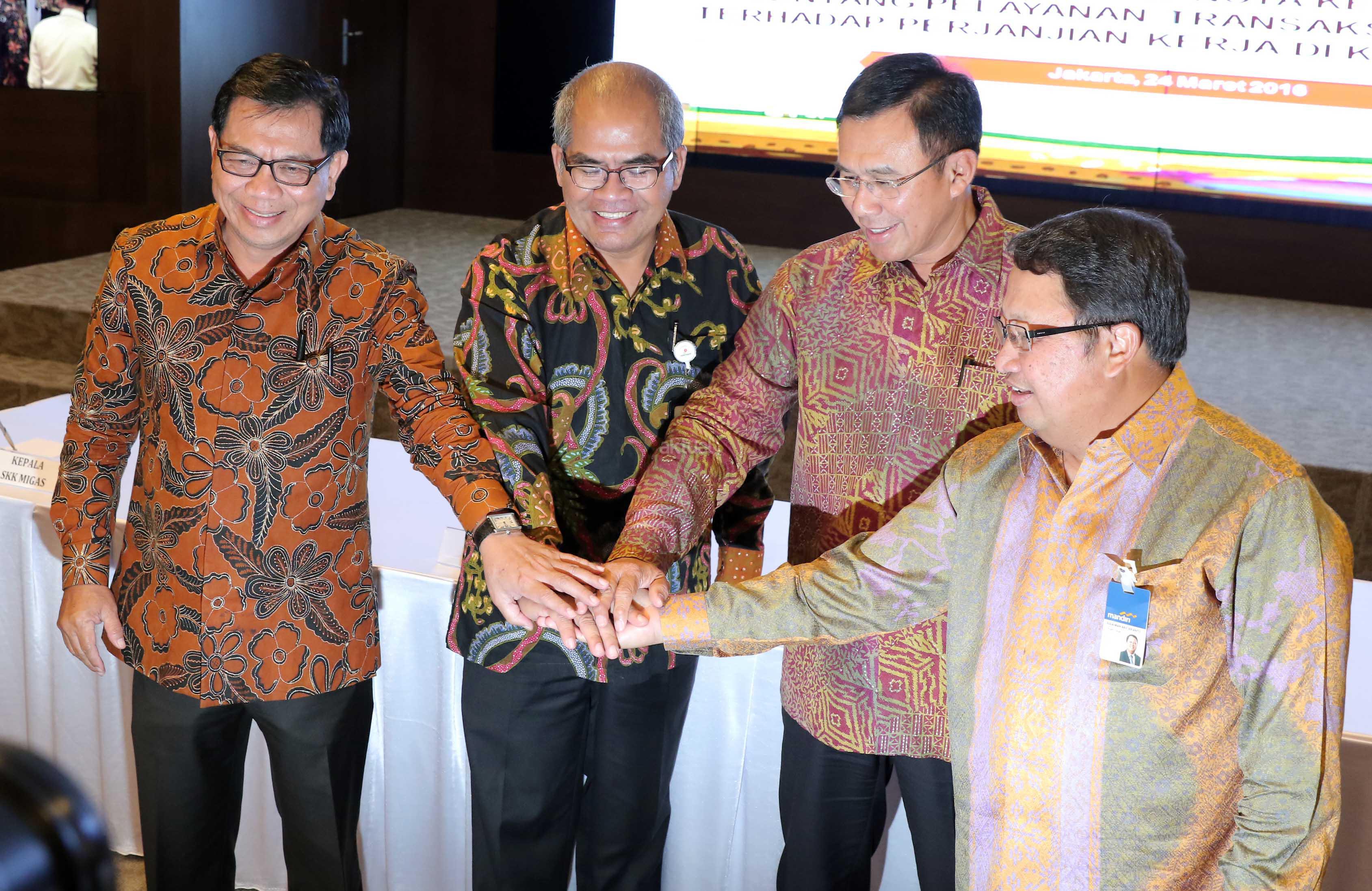 Kepala SKK Migas Amien Sunaryadi (kedua kiri) bersama Dirut Bank BNI Ahmad Baequni (kedua kanan), Dirut Bank BRI Asmawi Syam (kiri) serta Wakil Dirut Bank Mandiri Sulaiman A Arianto (kanan) saling menyatukan tangan usai penandatangan nota kesepahaman kerjasama penyediaan layanan transaksi nilai tukar terhadap kontraktor migas dan vendor, Jakarta, Kamis (24/3). Perbankan Nasional menjadi tempat penyimpanan dana pemulihan pasca operasi (ASR), hingga 29 Februari 2016 mencapai 177 Juta US dollar, selain itu juga dipercaya menjadi Tristee Paying Agent untuk mengelola penjualan migas. Aktual/Tino OKtaviano