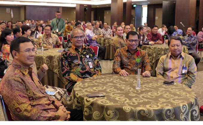 Kepala SKK Migas Amien Sunaryadi (kedua kiri) bersama Dirut Bank BNI Ahmad Baequni (kedua kanan), Dirut Bank BRI Asmawi Syam (kiri) serta Wakil Dirut Bank Mandiri Sulaiman A Arianto (kanan) saling berdiskusi usai penandatangan nota kesepahaman kerjasama penyediaan layanan transaksi nilai tukar terhadap kontraktor migas dan vendor, Jakarta, Kamis (24/3). Perbankan Nasional menjadi tempat penyimpanan dana pemulihan pasca operasi (ASR), hingga 29 Februari 2016 mencapai 177 Juta US dollar, selain itu juga dipercaya menjadi Tristee Paying Agent untuk mengelola penjualan migas. Aktual/Tino OKtaviano