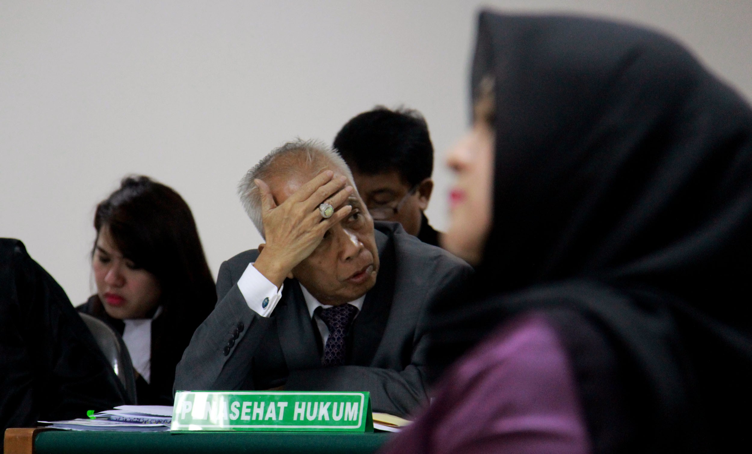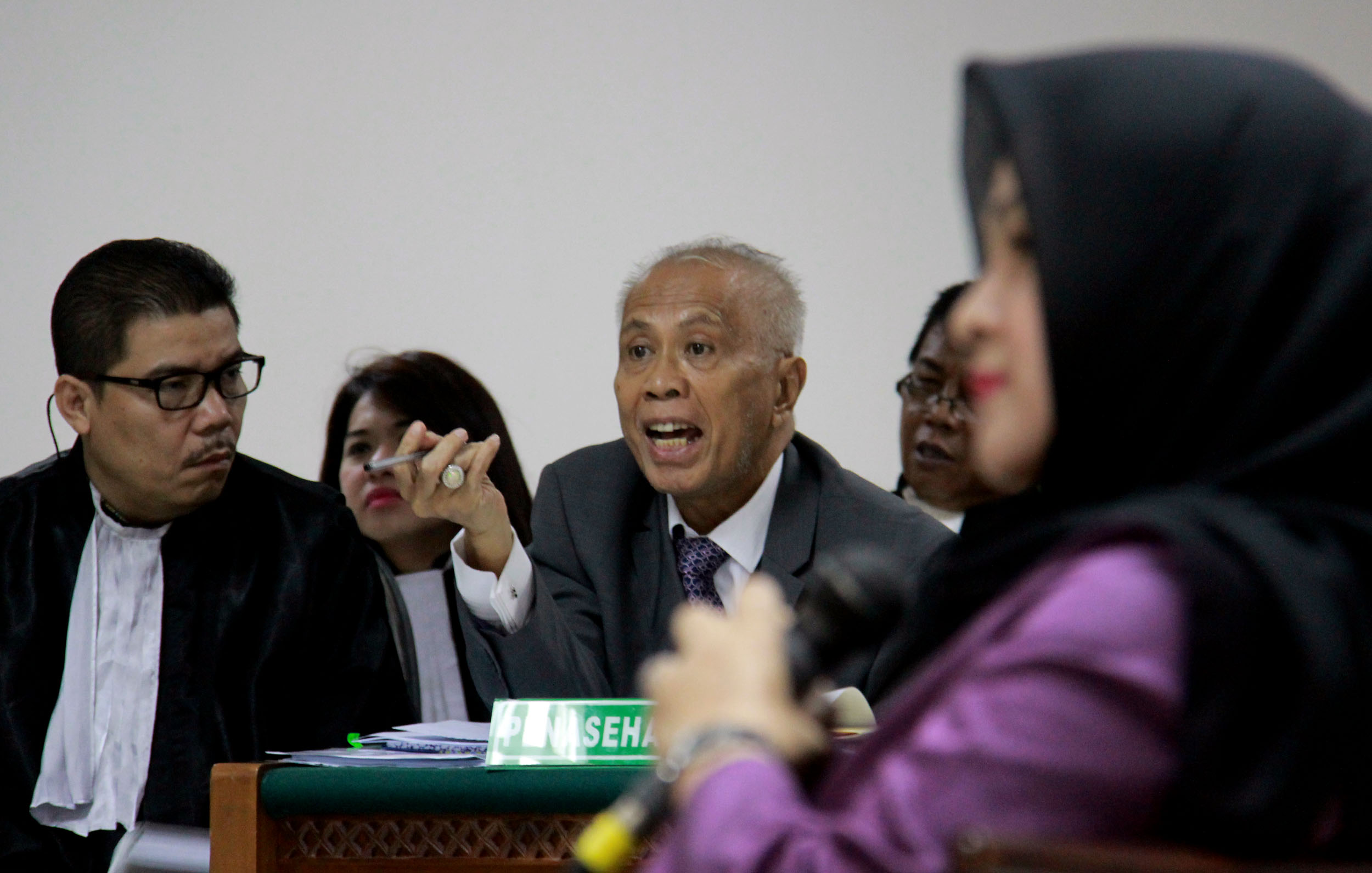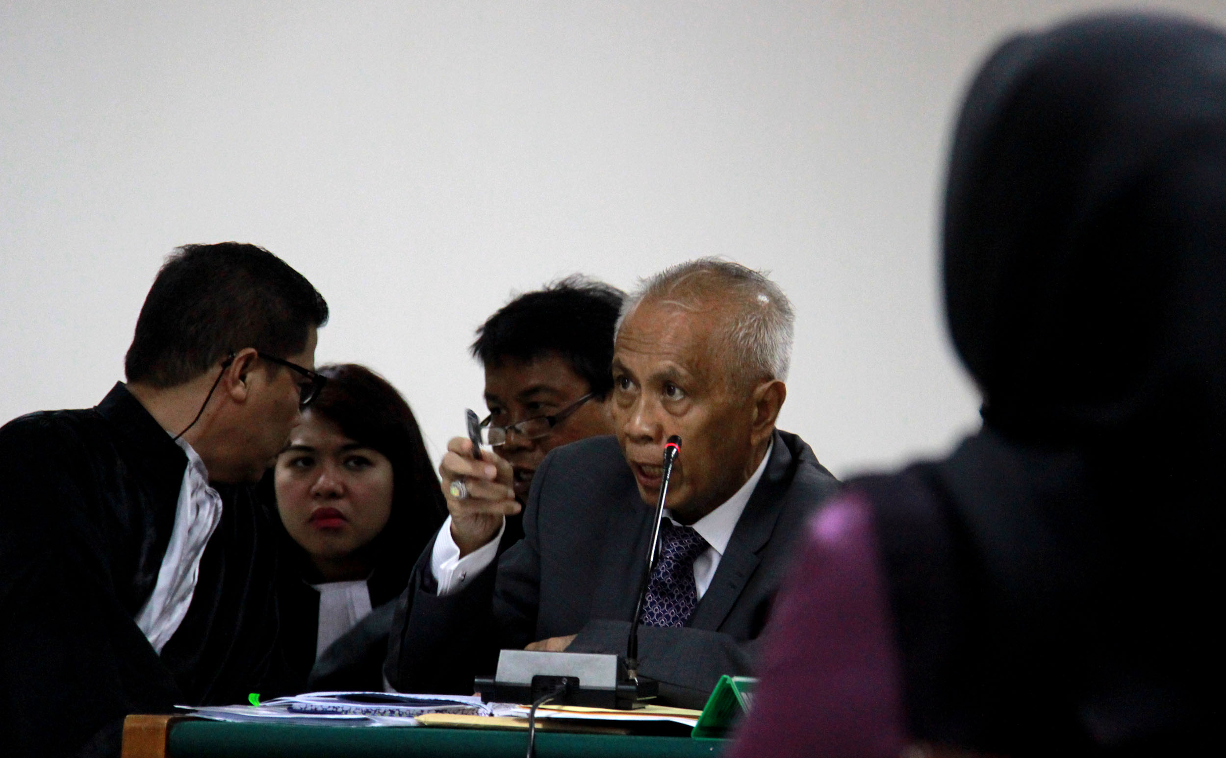 Terdakwa Otto Cornelis Kaligis (OC Kaligis) saat mendengarkan kesaksian Istri Gubernur Sumatera Utara Gatot Pujo Nugroho, Evy Susanti dalam sidang lanjutan di Pengadilan Tipikor, Jakarta, Kamis (1/10/2015). OC Kaligis didakwa terlibat dalam kasus suap kepada hakim dan panitera Pengadilan Tata Usaha Negara di Medan.