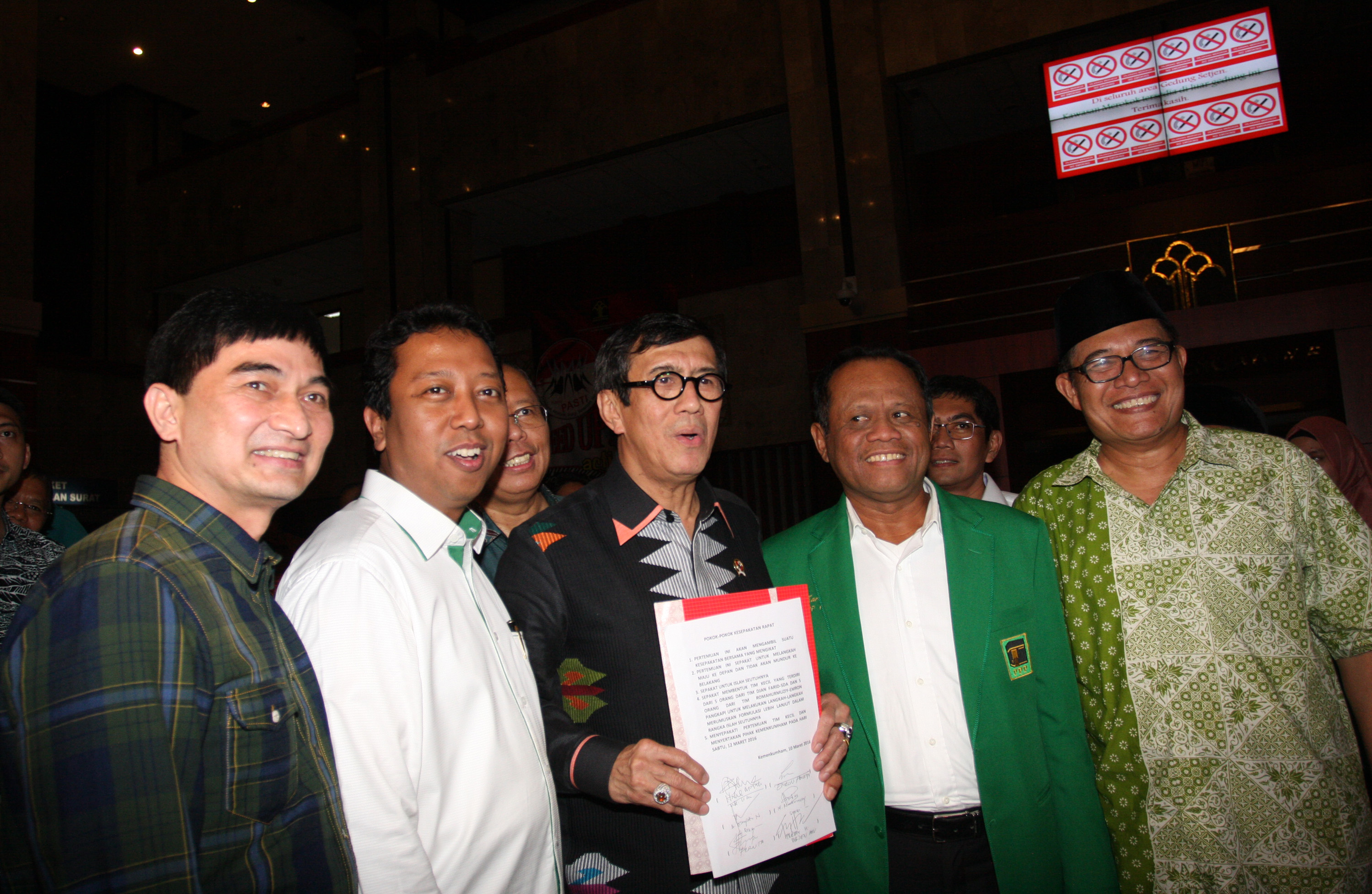 Menteri Hukum dan Hak Asasi Manusia (Menkumham) Yasonna H Laoly (tengah) bersama Wakil Ketua Umum DPP Partai Persatuan Pembangunan (PPP) hasil Muktamar Bandung Emron Pangkapi (kedua kanan), Wakil Ketua Umum PPP Muktamar Jakarta Habil Marati (kedua kiri), Sekretaris Jenderal PPP muktamar Bandung Romahurmuziy (kanan), dan Sekjen DPP PPP hasil Muktamar Jakarta, Achmad Dimyati Natakusuma (kiri) menunjukkan surat kesepakatan islah Partai PPP usai mengadakan rapat pertemuan di Gedung Menkumham, Jakarta, Kamis (10/3). Hasil pertemuan rapat tersebut menyepakati adanya islah seutuhnya dengan membentuk tim kecil dari 2 kubu Djan farid - SDA dan Romahurmuziy - Emron Pangkapi untuk islah Partai Persatuan Pembangunan (PPP). ANTARA FOTO/Reno Esnir/ama/16. *** Local Caption ***