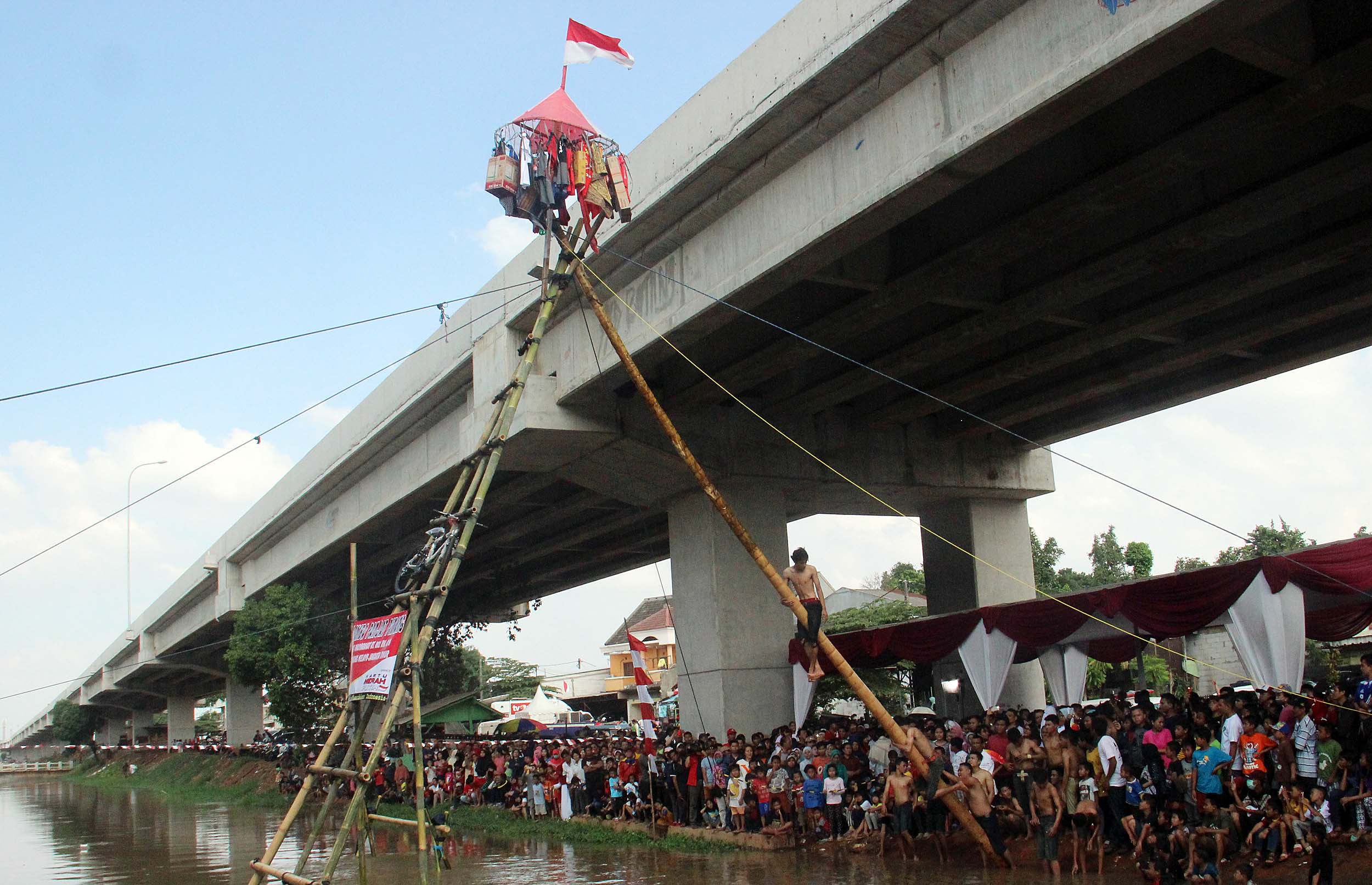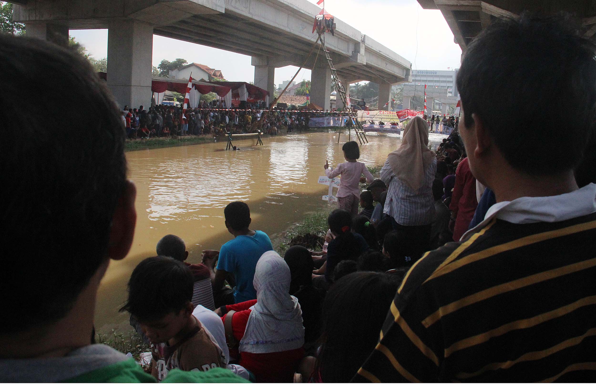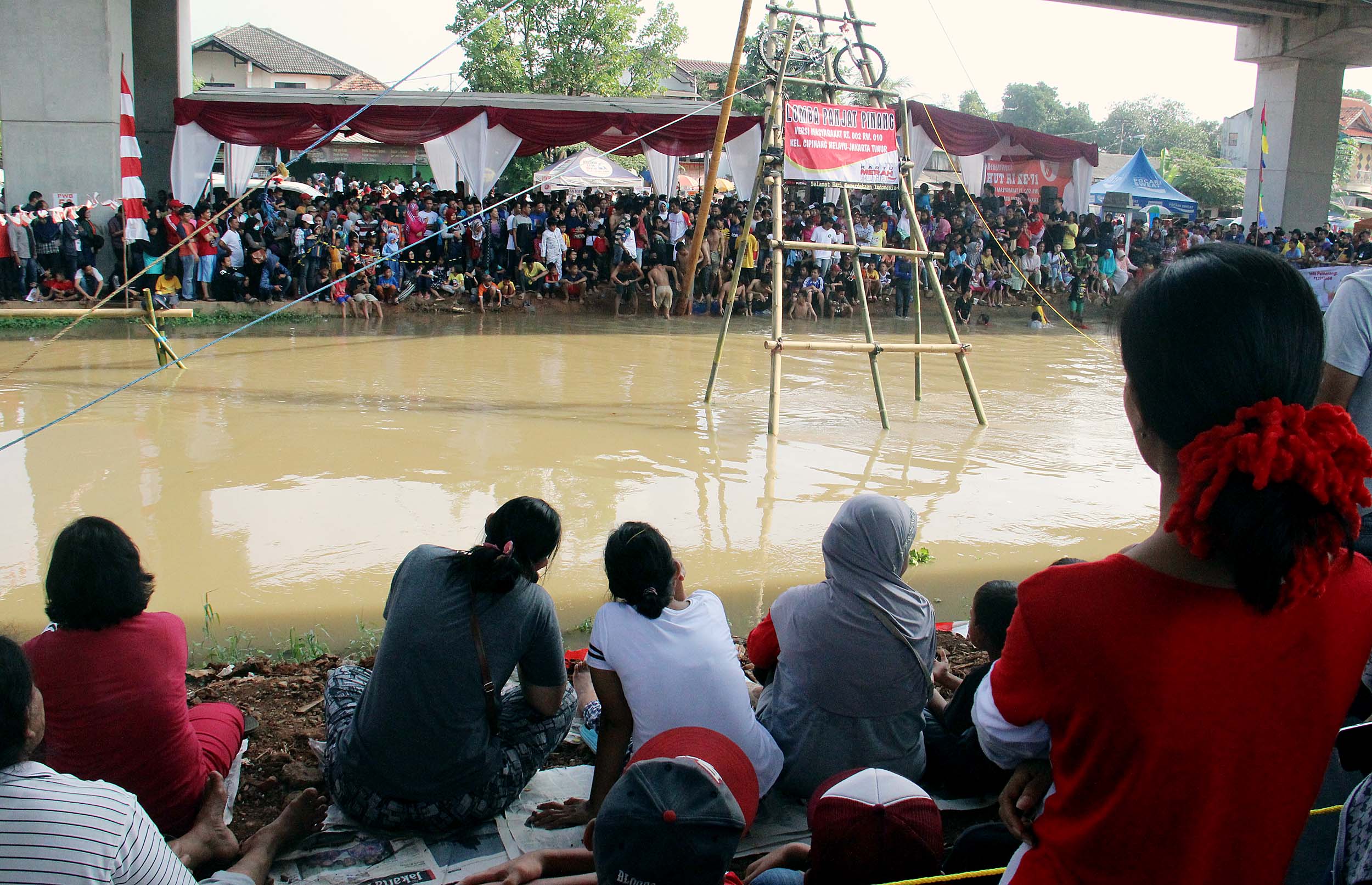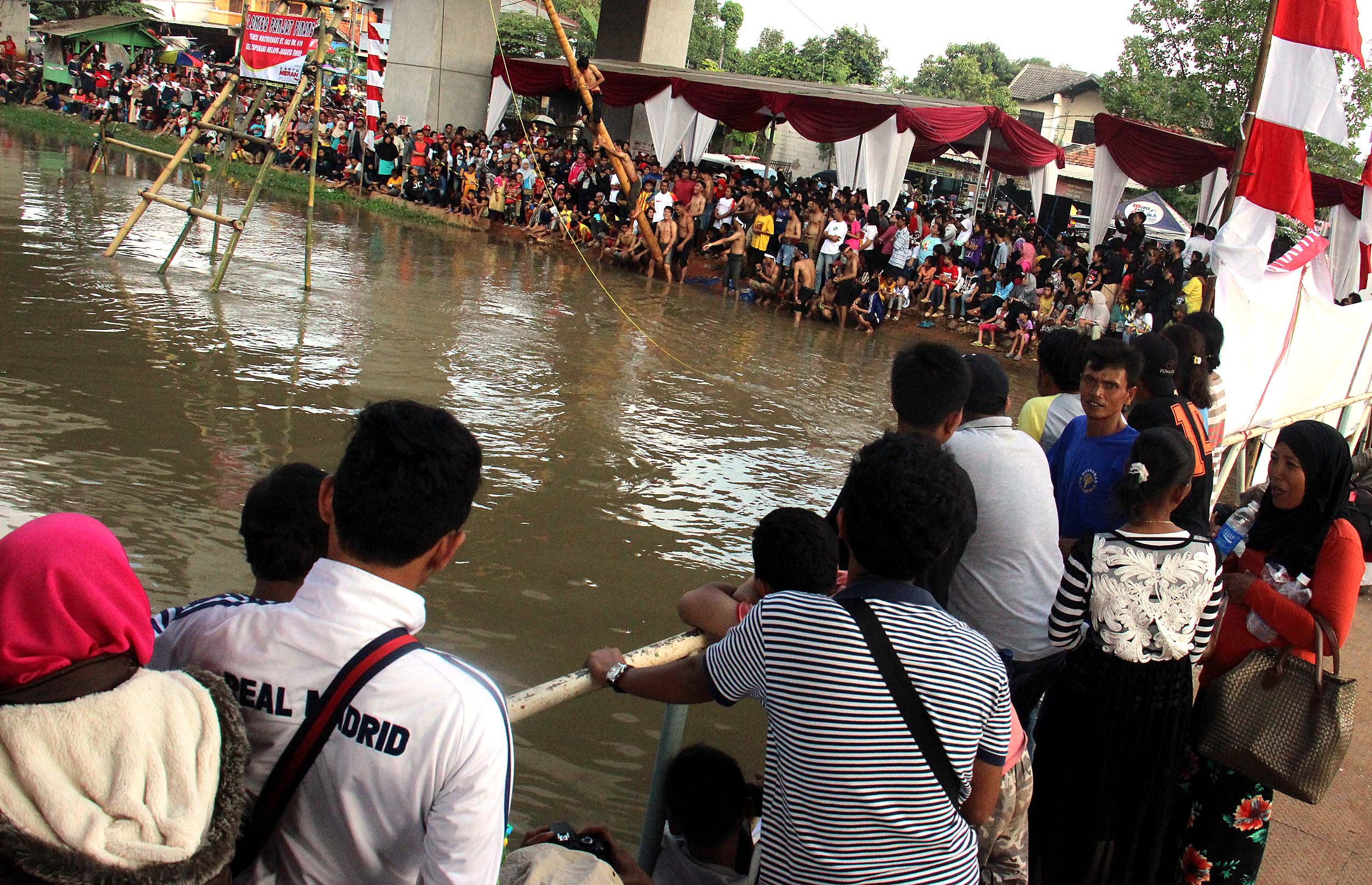 Antusias masyarakat menonton perlombaan panjat Pinang di Kalimalang, Jakarta Timur, Rabu (17/8/2016). Lomba tersebut dalam rangka menyemarakkan perayaan HUT RI ke-71.