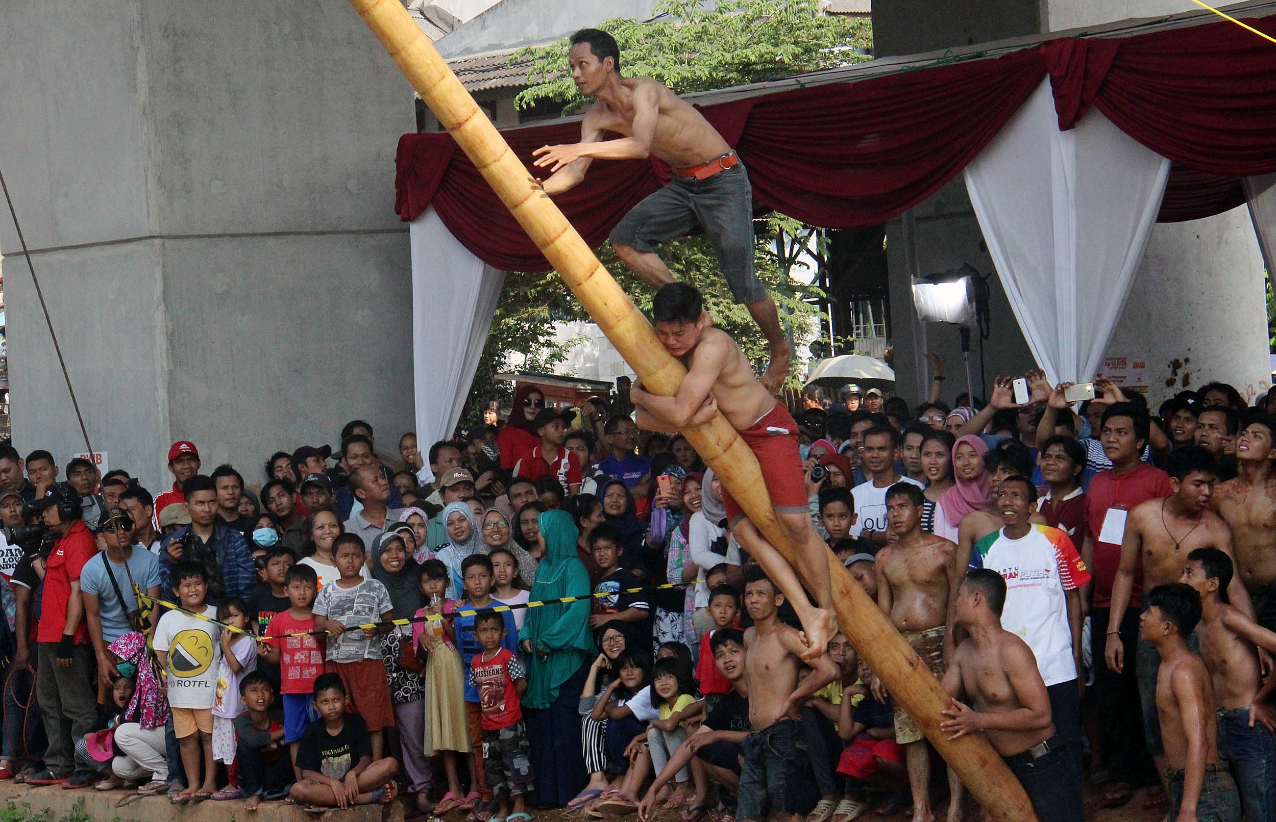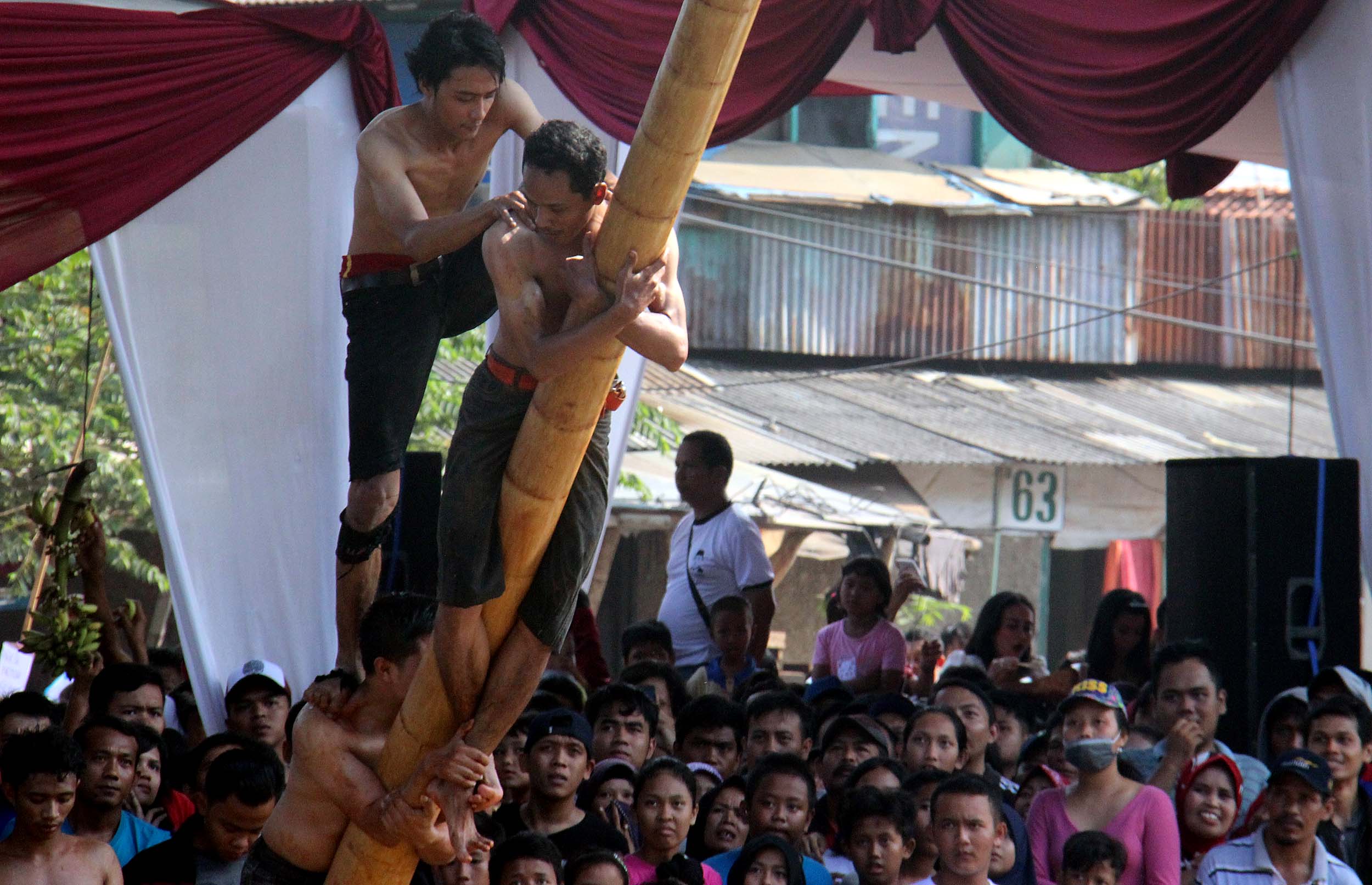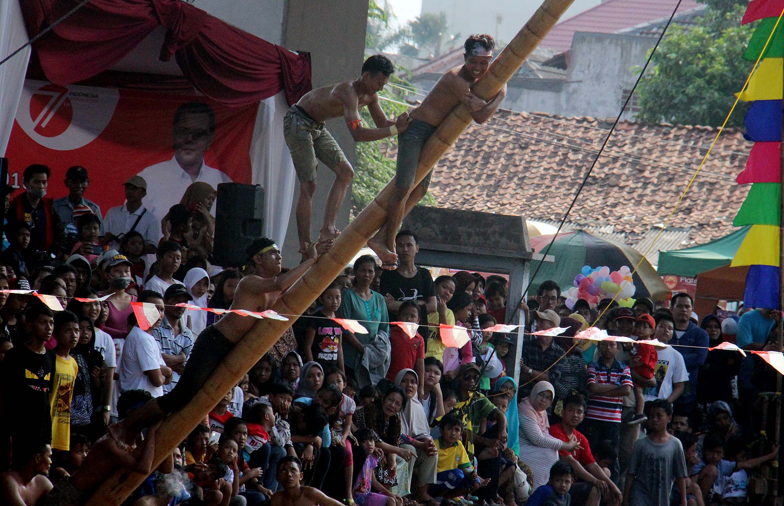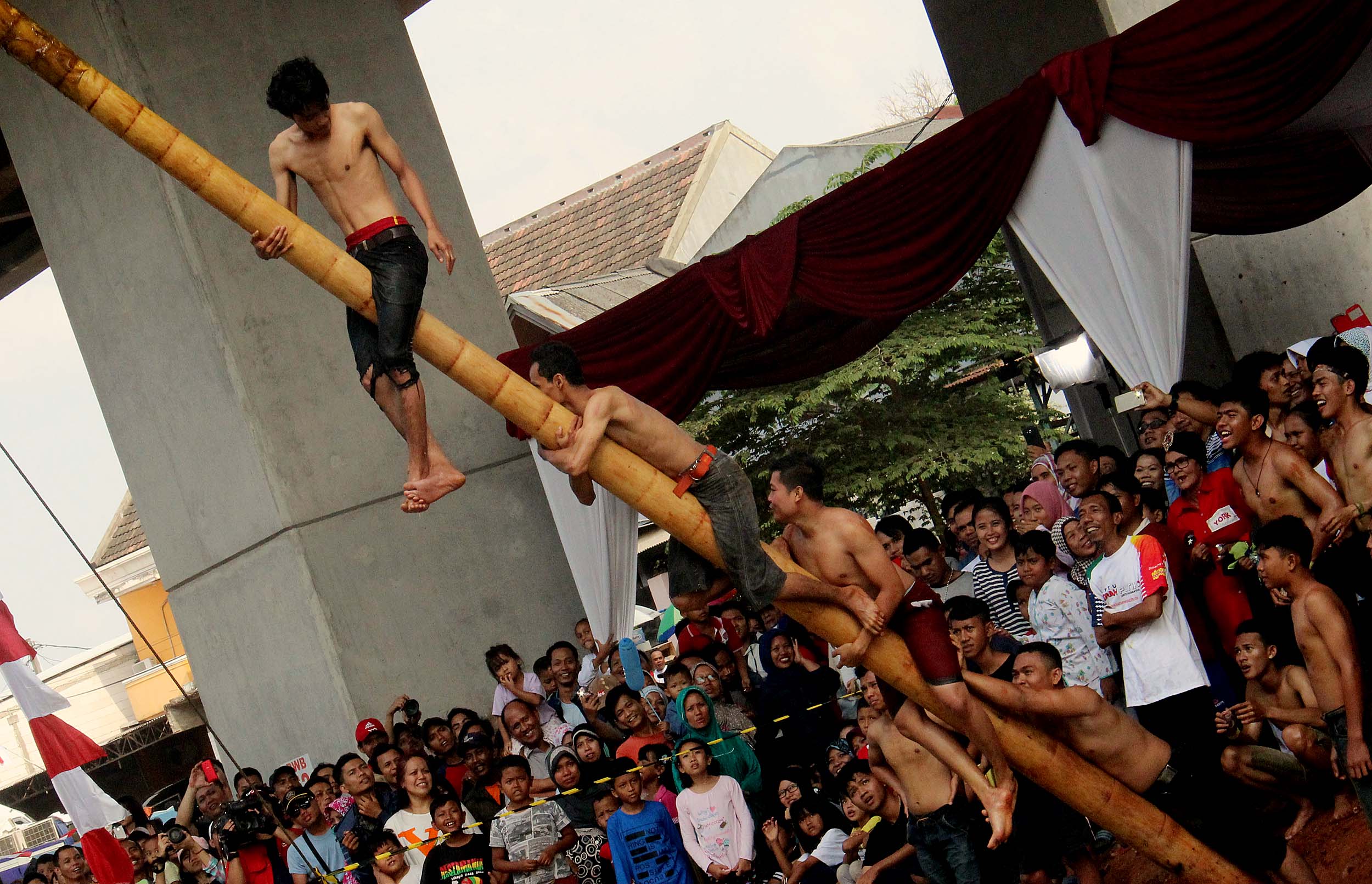 Antusias masyarakat menonton perlombaan panjat Pinang di Kalimalang, Jakarta Timur, Rabu (17/8/2016). Lomba tersebut dalam rangka menyemarakkan perayaan HUT RI ke-71.