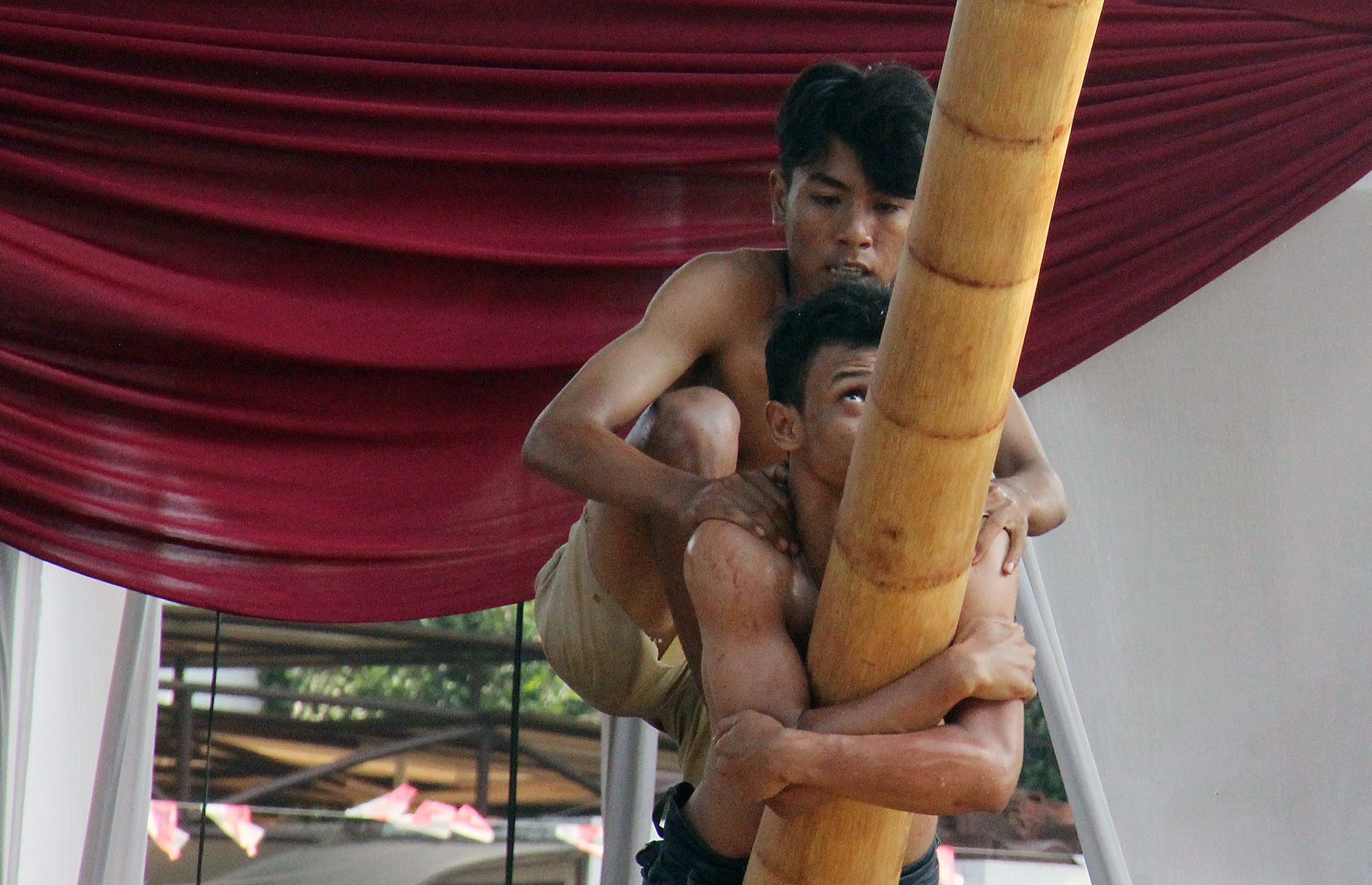 Peserta mengikuti lomba panjat Pinang di Kalimalang, Jakarta Timur, Rabu (17/8/2016). Lomba tersebut dalam rangka menyemarakkan perayaan HUT RI ke-71.