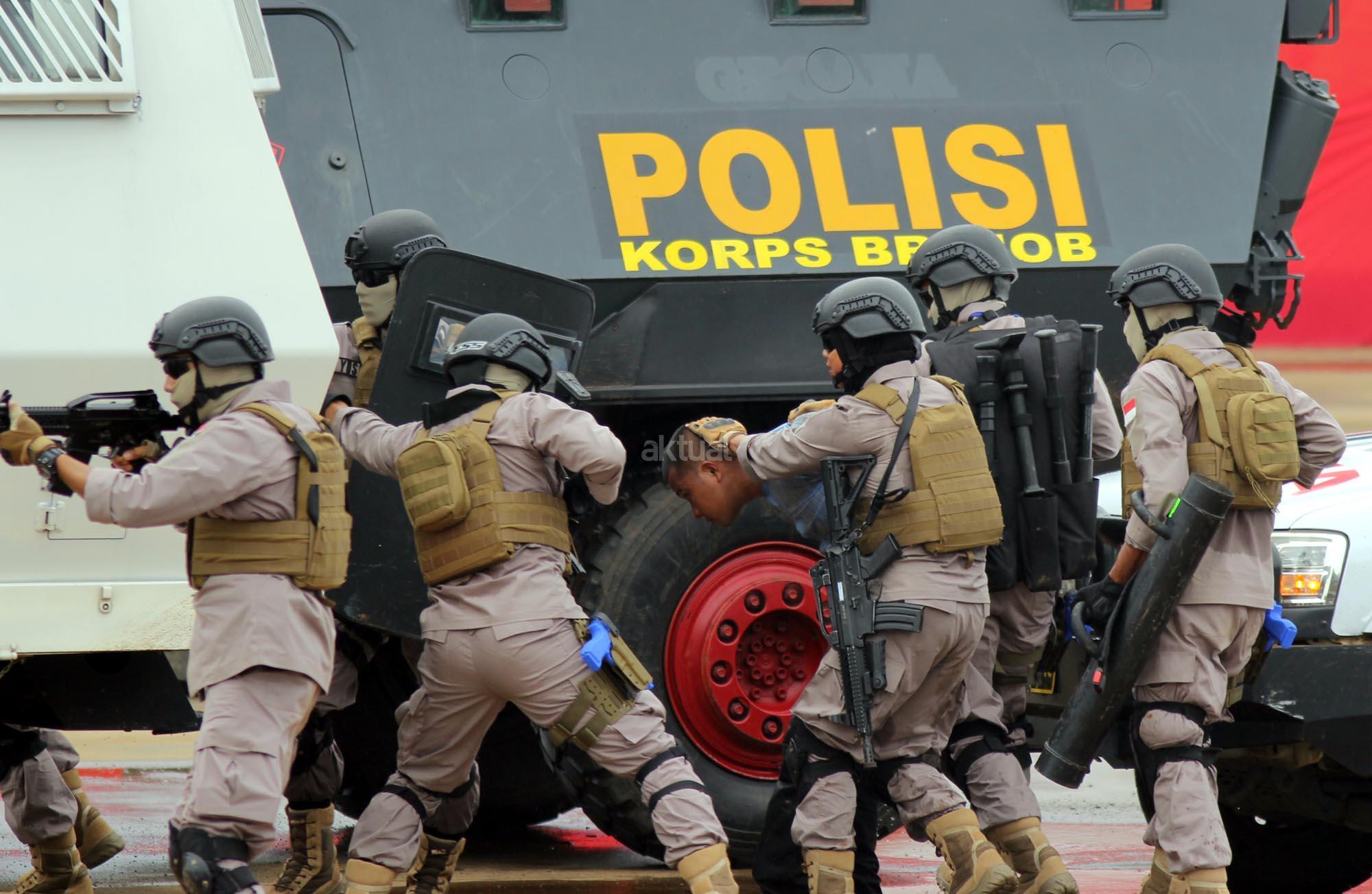 Personel Polri dari berbagai kesatuan usai melakukan simulasi penanganan teror dan unjuk rasa di Gedung Multi Fungsi Polri, Cikeas, Bogor, Senin (23/4/18). AKTUAL/Tino Oktaviano