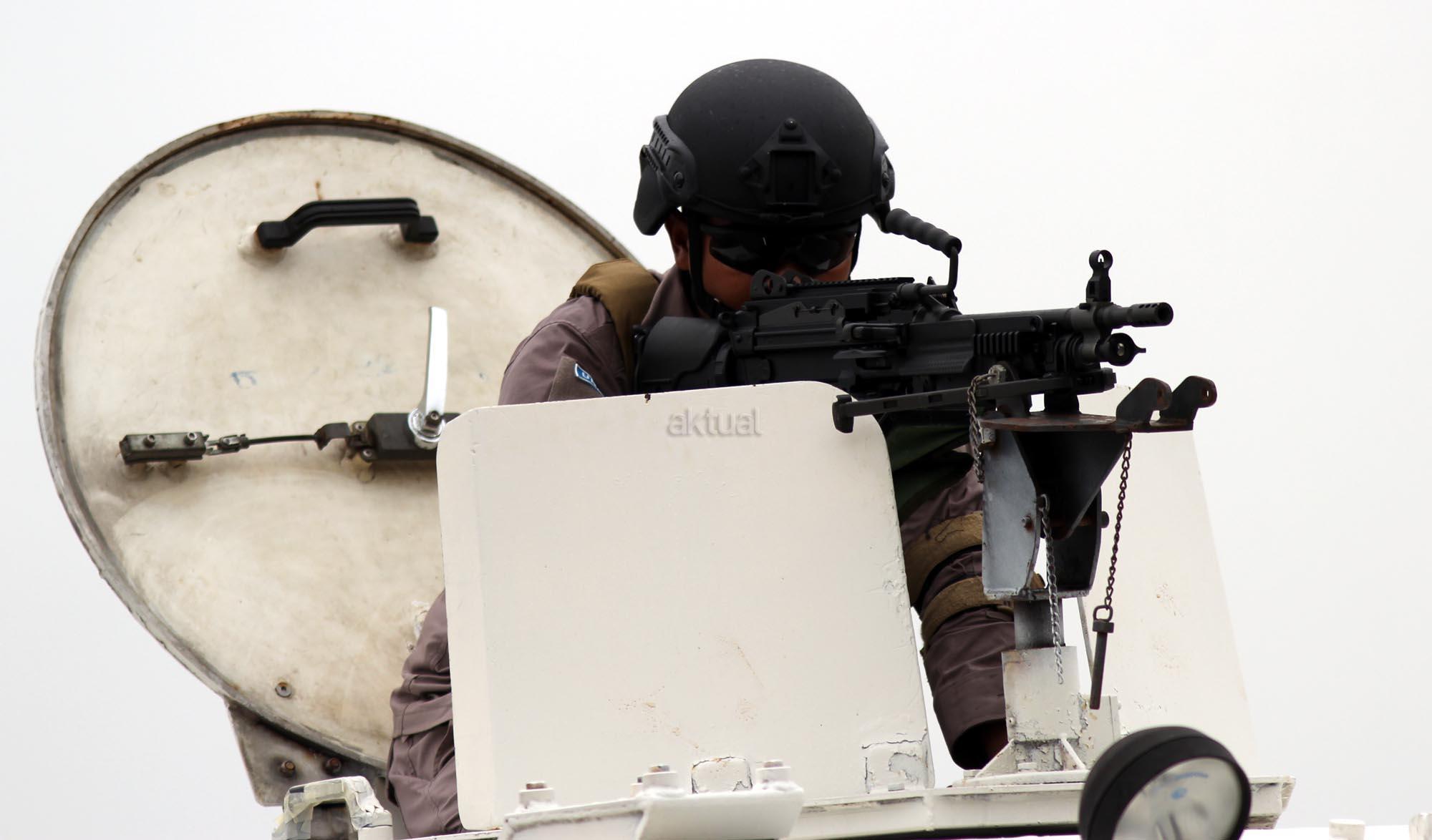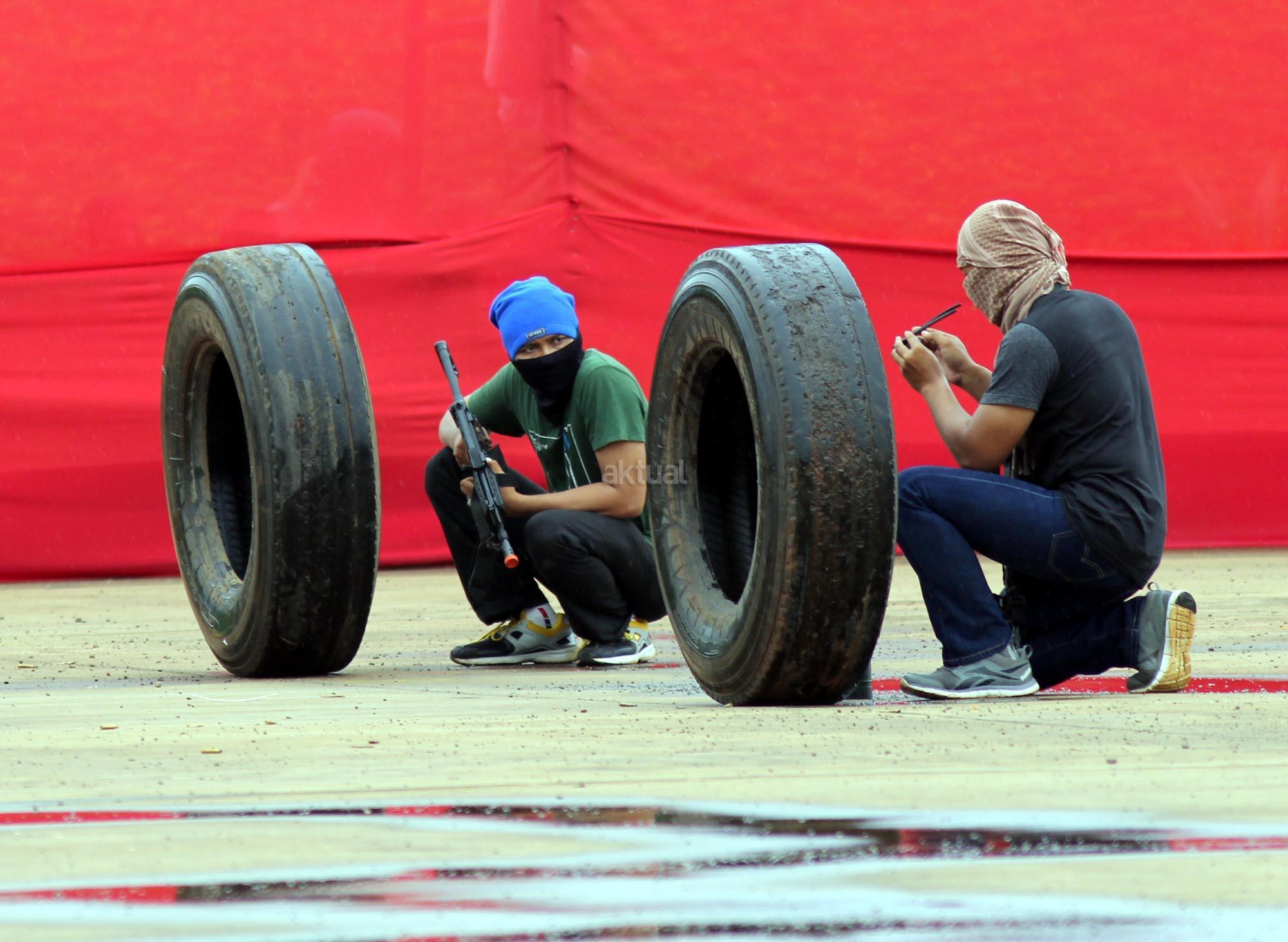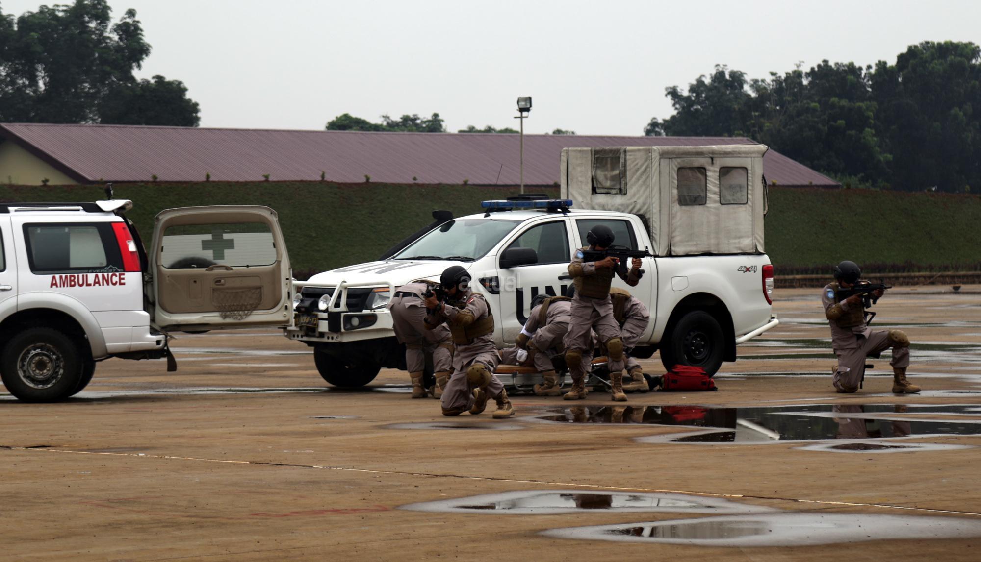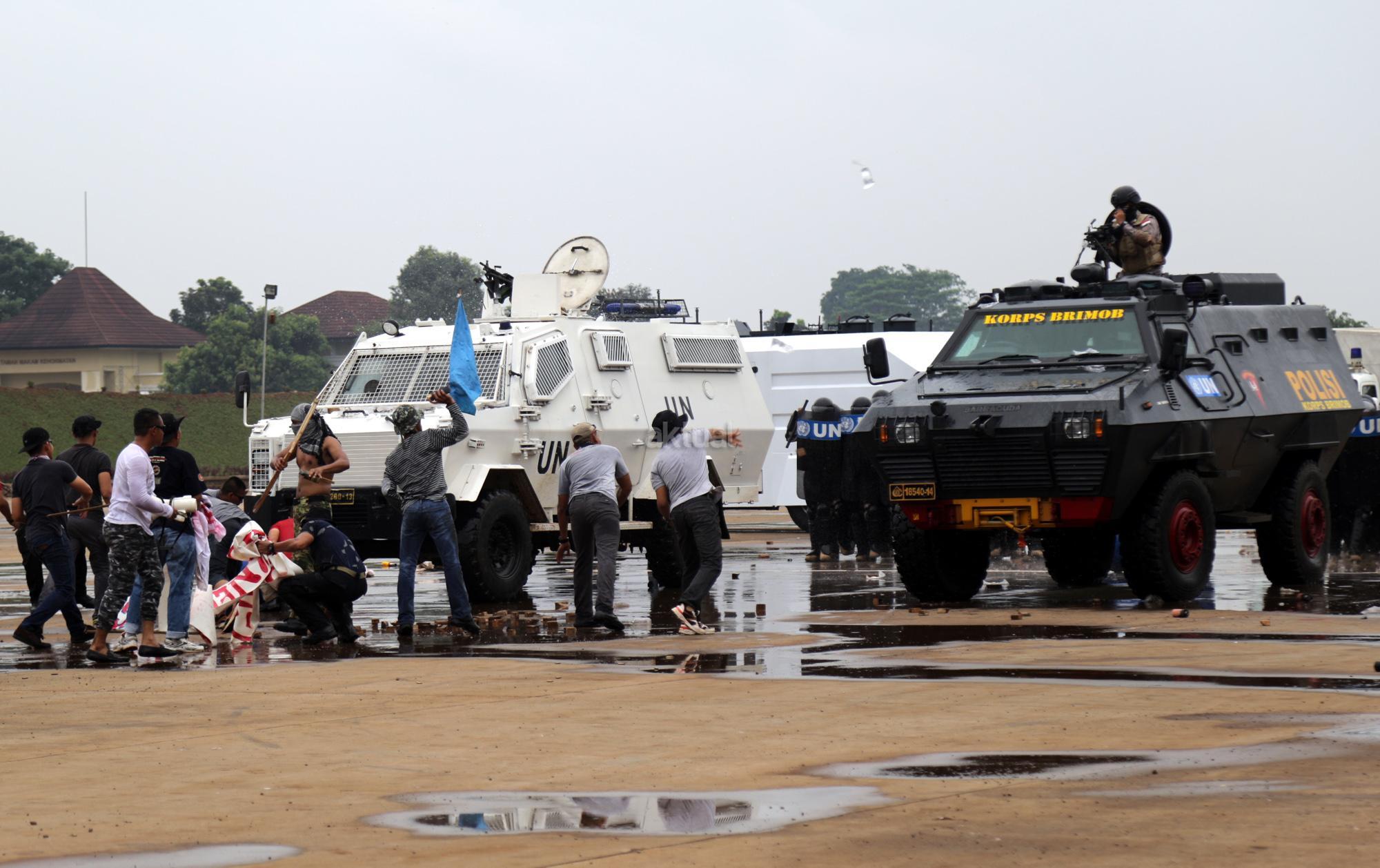 Sejumlah personel pasukan perdamaian Garuda Bhayangkara melakukan simulasi pengamanan di wilayah konflik di Gedung Multi Fungsi Polri, Bogor, Jawa Barat, Senin (23/4). Pasukan yang terdiri dari 215 orang diantaranya pasukan pendukung, pasukan taktis, dan pasukan SWAT, dipersiapkan untuk memastikan Indonesia siap mengirimkan pasukan dan logistik bagi perdamaian dunia. AKTUAL/Tino Oktaviano