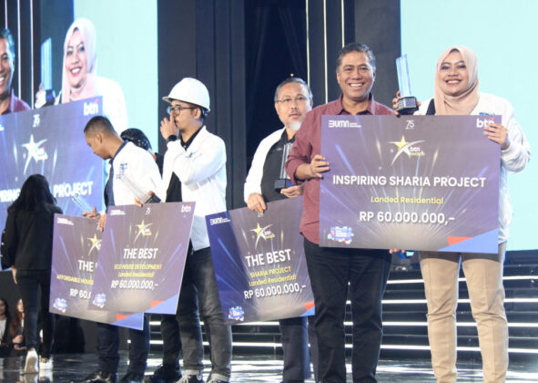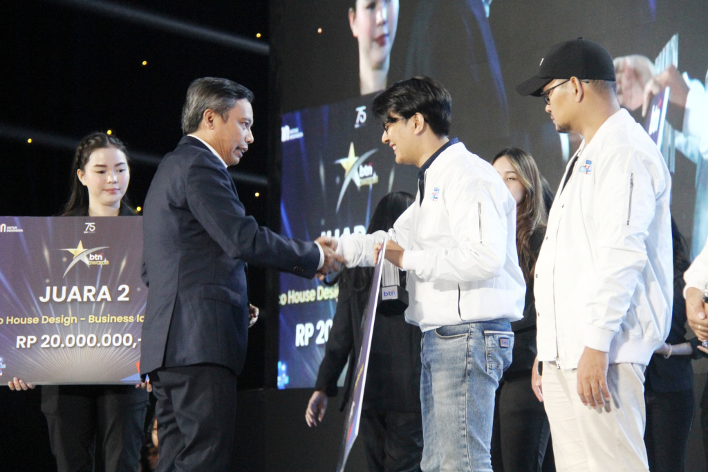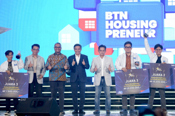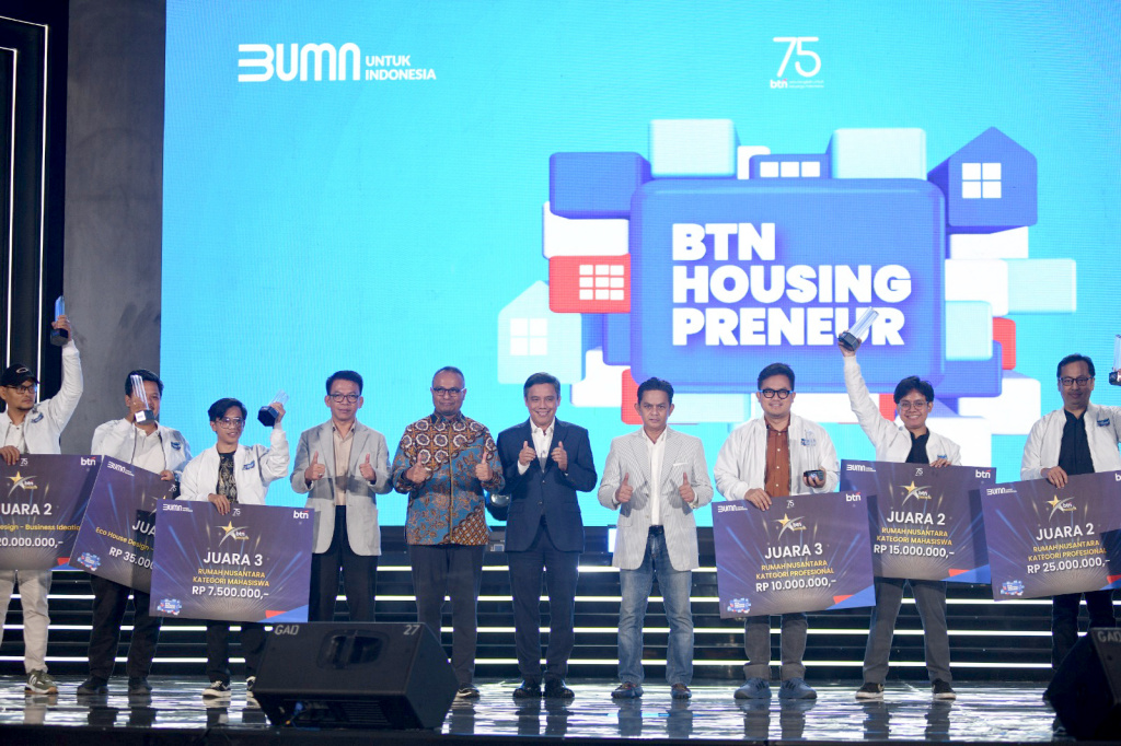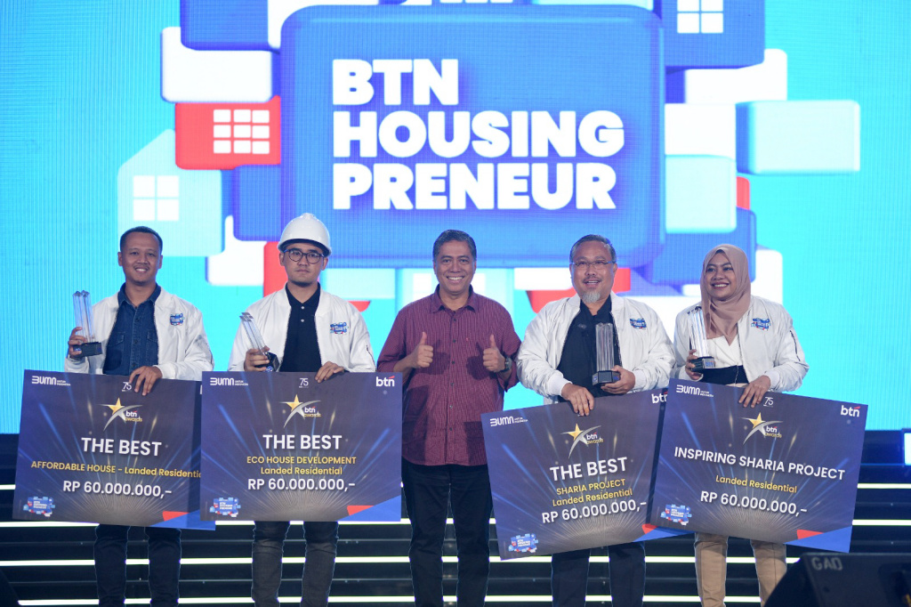 Direktur Utama BTN Nixon LP Napitupulu bersama Anggota Satgas Perumahan Bonny Z Minang, dan Dirjen Perumahan Perdesaan Kementerian Perumahan dan Kawasan Permukiman (PKP) Imran berfoto dengan para pemenang ajang Kompetisi BTN Housingpreneur di Jakarta, Sabtu (15/2). BTN Housingpreneur yang diikuti hampir 1.000 peserta sukses digelar dengan 4 kategori yang dikompetisikan yakni Housing Related Inovation, Landed Residential, Eco House Design dan Rumah Nusantara. Adapun total hadiah yang dibagikan dalam ajang kompetisi BTN Housingpreneur sebesar Rp1 miliar. BTN Housingpreneur merupakan ajang kompetisi yang tidak hanya diikuti oleh para wirausahawan sektor properti dan industri pendukungnya, namun juga oleh mahasiswa serta masyarakat umum untuk mendukung terciptanya wirausaha muda dalam ekosistem perumahan di Indonesia yang berorientasi pada keberlanjutan (sustainability) yang dapat mendukung Program 3 Juta Rumah. Aktual/DOK BTN