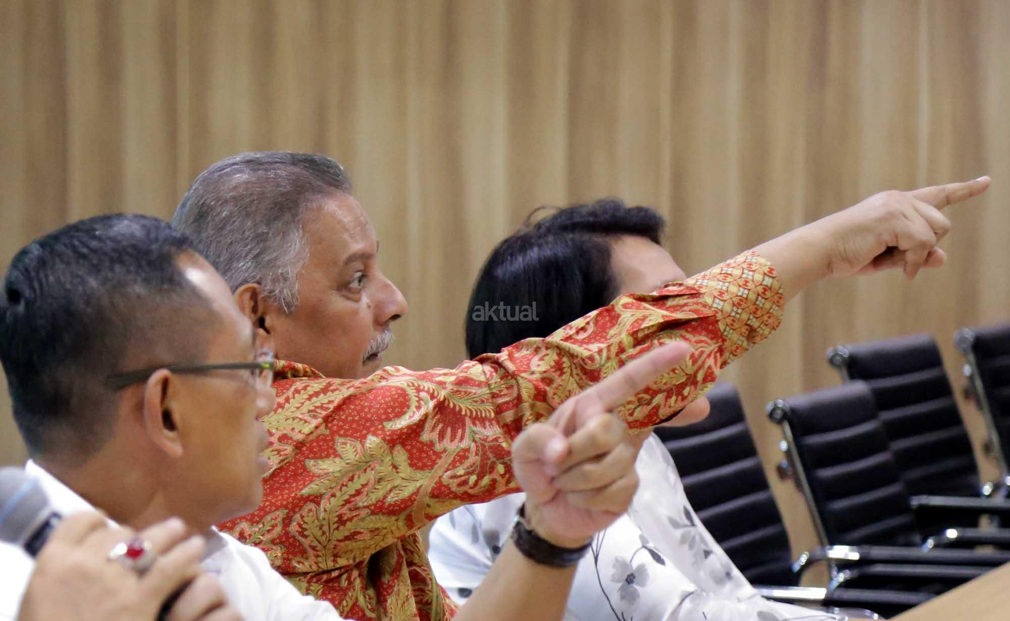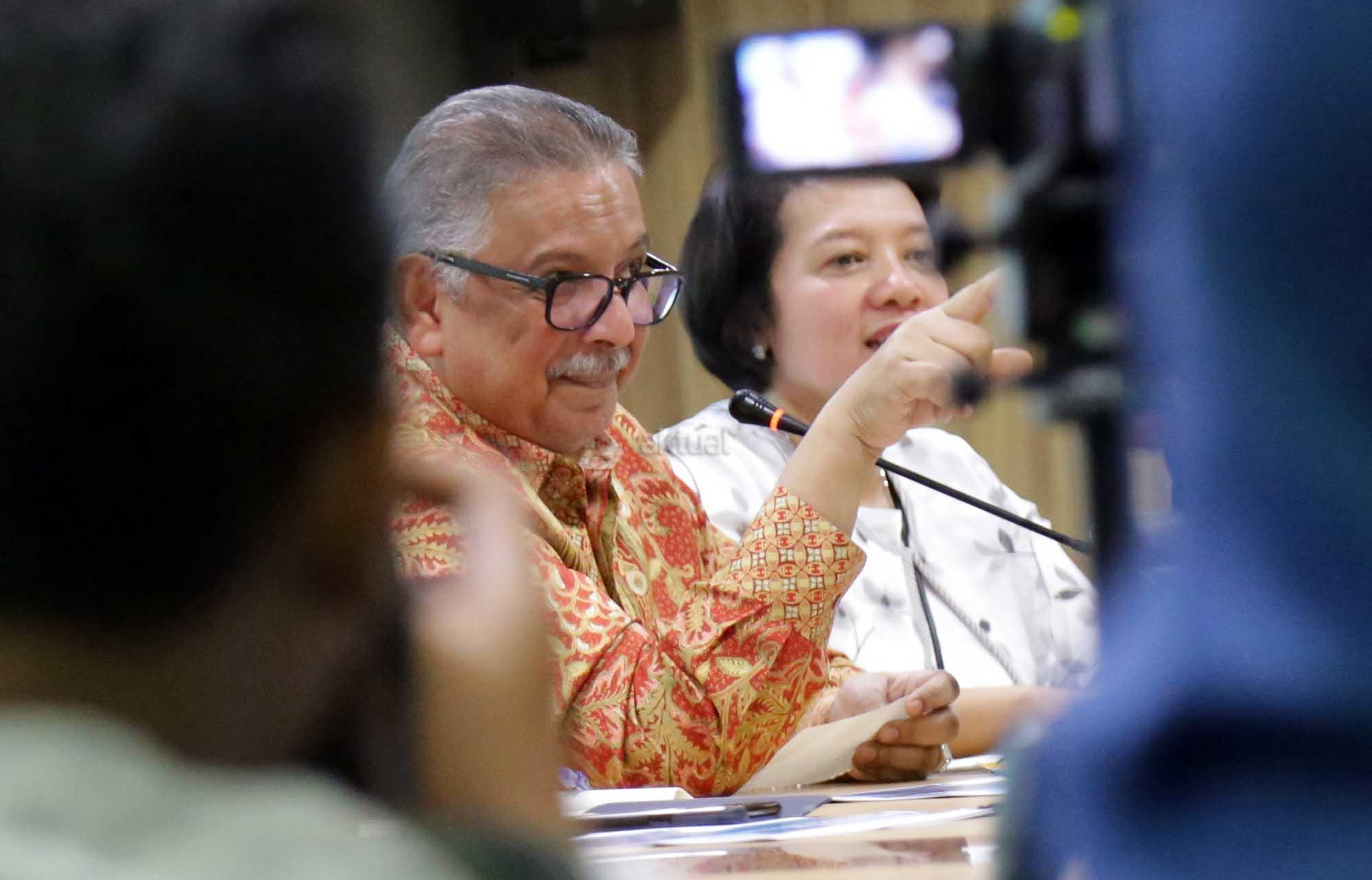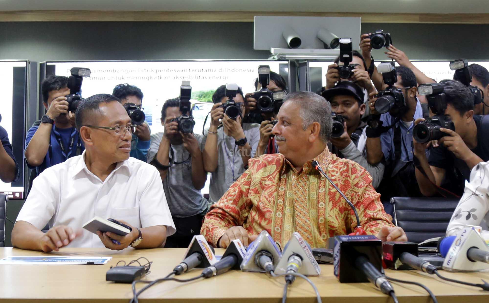 Direktur Utama PLN Sofyan Basir (kanan) memberikan keterangan pers tentang penggeledahan kediamannya oleh petugas Komisi Pemberantasan Korupsi (KPK), di Kantor Pusat PLN, Jakarta, Senin (16/7/2018). PLN menyatakan menghormati proses hukum yang dilakukan KPK dengan mengedepankan asas praduga tidak bersalah dan membantu KPK dengan memberikan sejumlah informasi dan dokumen-dokumen terkait proyek PLTU Riau-1. AKTUAL/Tino Oktaviano