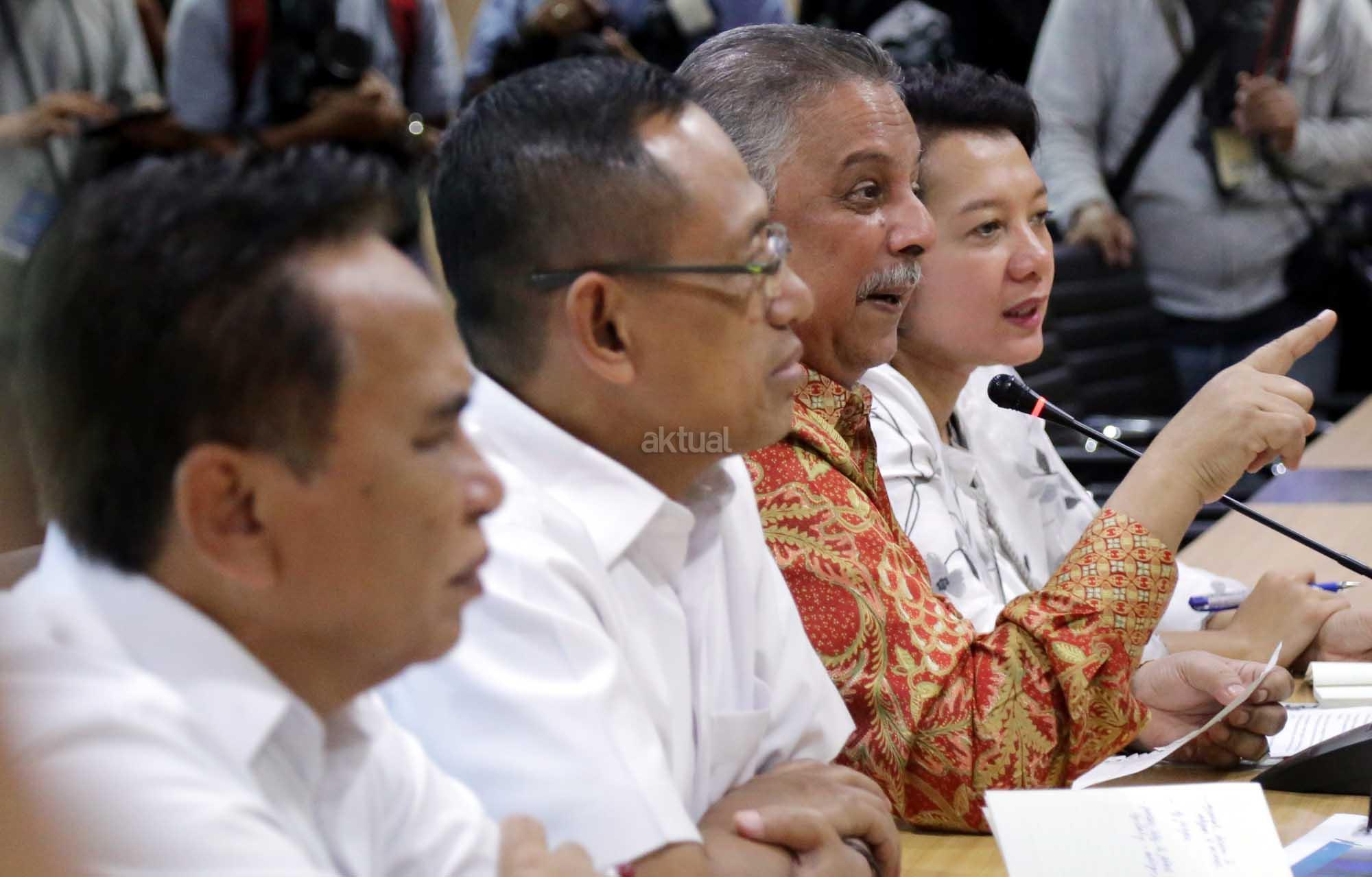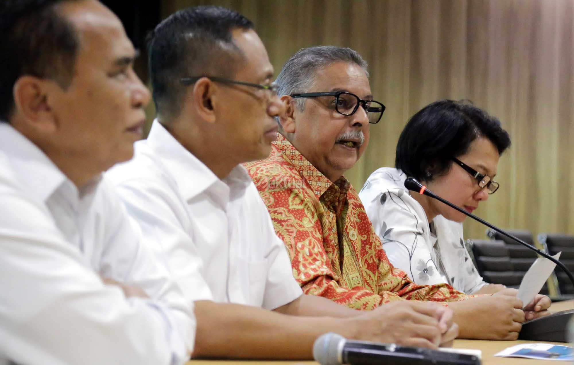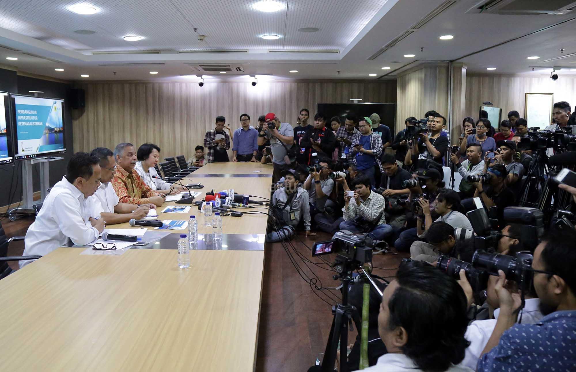 Direktur Utama PLN Sofyan Basir (kedua kanan) memberikan keterangan pers tentang penggeledahan kediamannya oleh petugas Komisi Pemberantasan Korupsi (KPK), di Kantor Pusat PLN, Jakarta, Senin (16/7/2018). PLN menyatakan menghormati proses hukum yang dilakukan KPK dengan mengedepankan asas praduga tidak bersalah dan membantu KPK dengan memberikan sejumlah informasi dan dokumen-dokumen terkait proyek PLTU Riau-1. AKTUAL/Tino Oktaviano