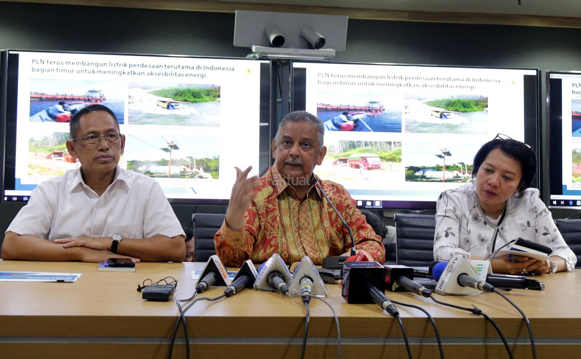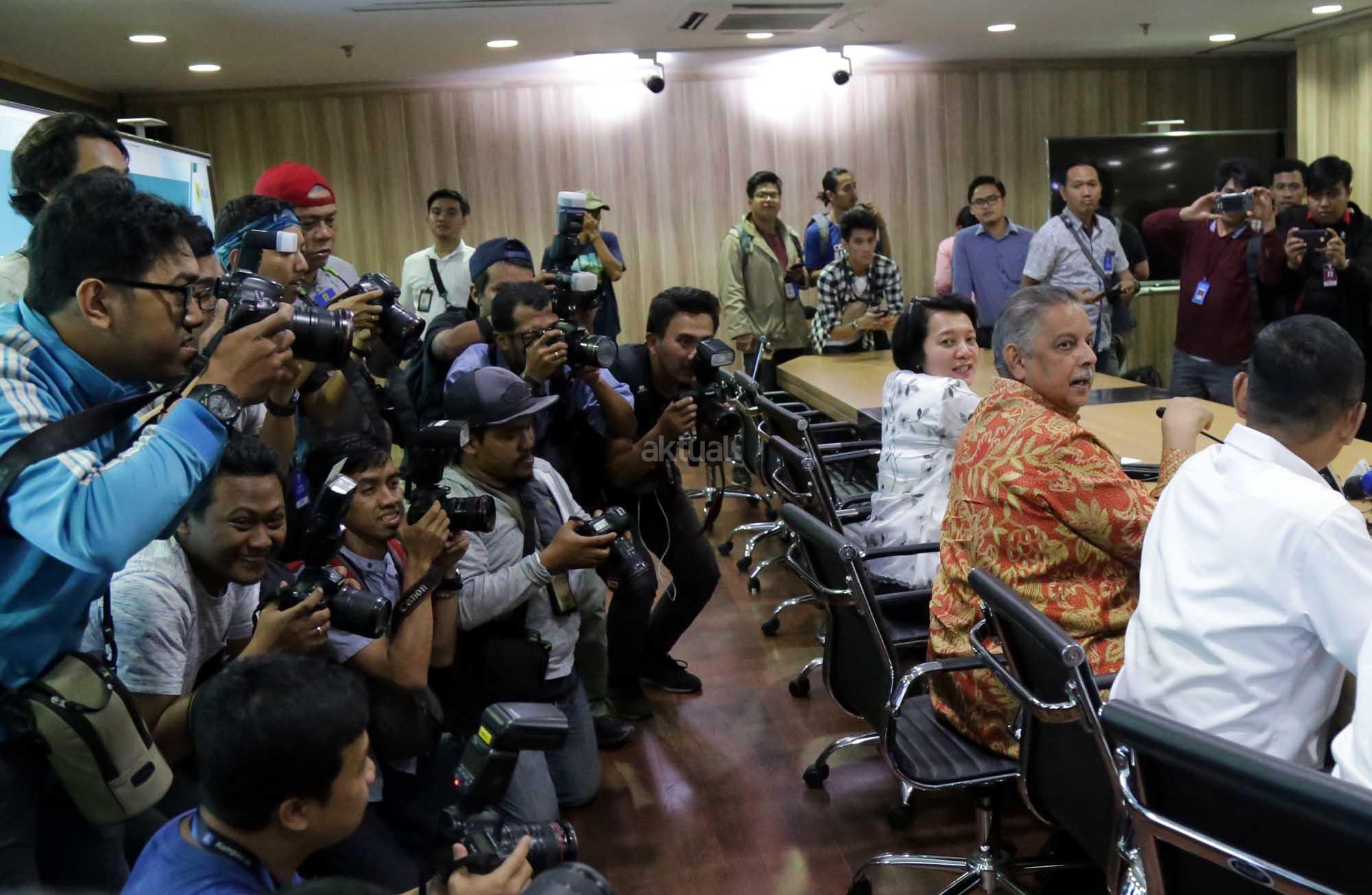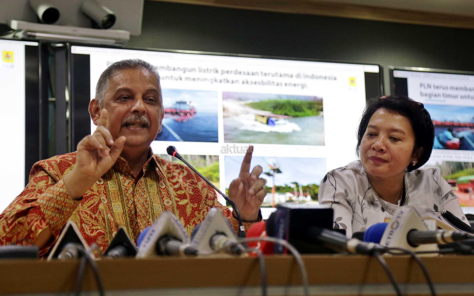 Direktur Utama PLN Sofyan Basir (kiri) memberikan keterangan pers tentang penggeledahan kediamannya oleh petugas Komisi Pemberantasan Korupsi (KPK), di Kantor Pusat PLN, Jakarta, Senin (16/7/2018). PLN menyatakan menghormati proses hukum yang dilakukan KPK dengan mengedepankan asas praduga tidak bersalah dan membantu KPK dengan memberikan sejumlah informasi dan dokumen-dokumen terkait proyek PLTU Riau-1. AKTUAL/Tino Oktaviano
