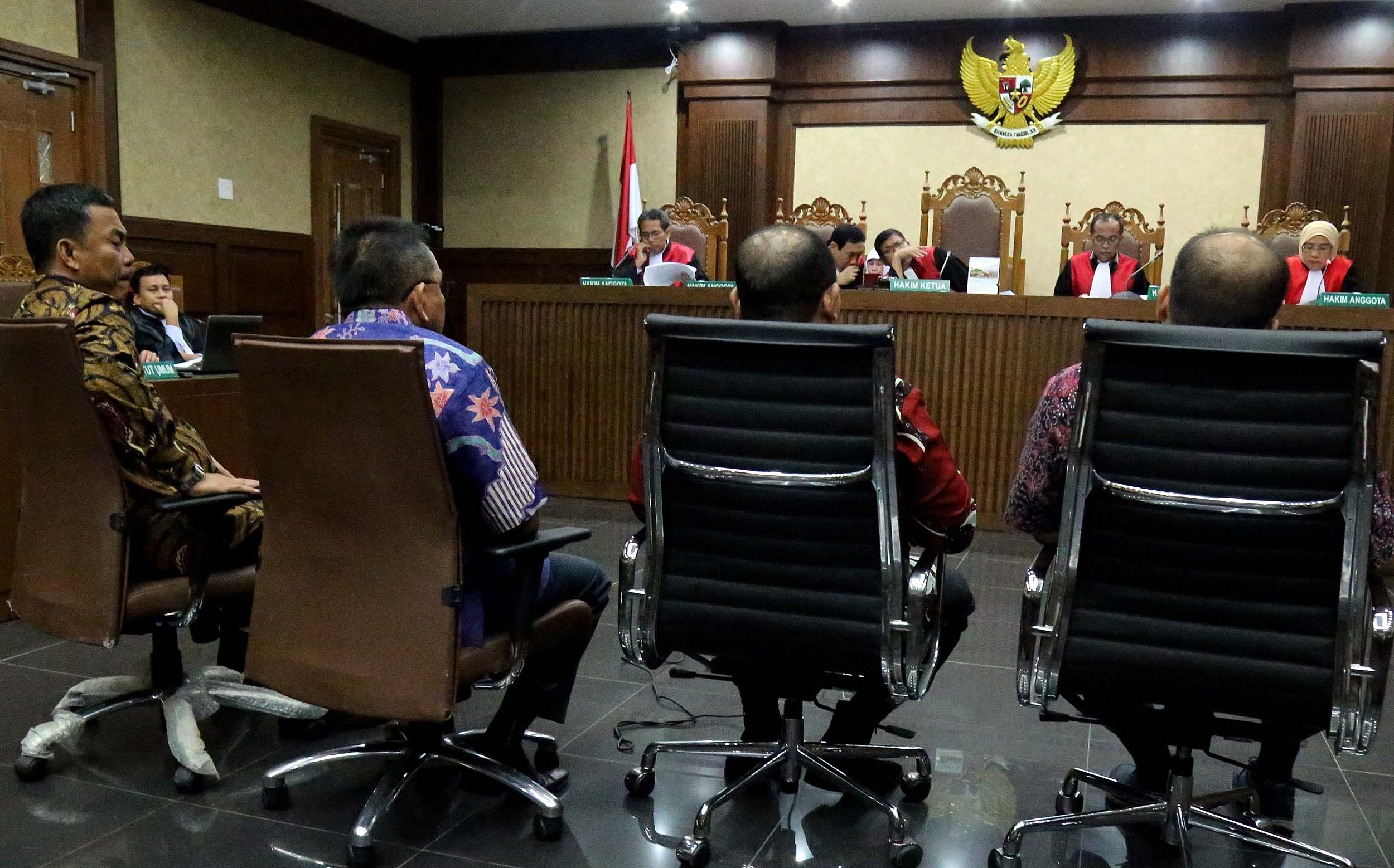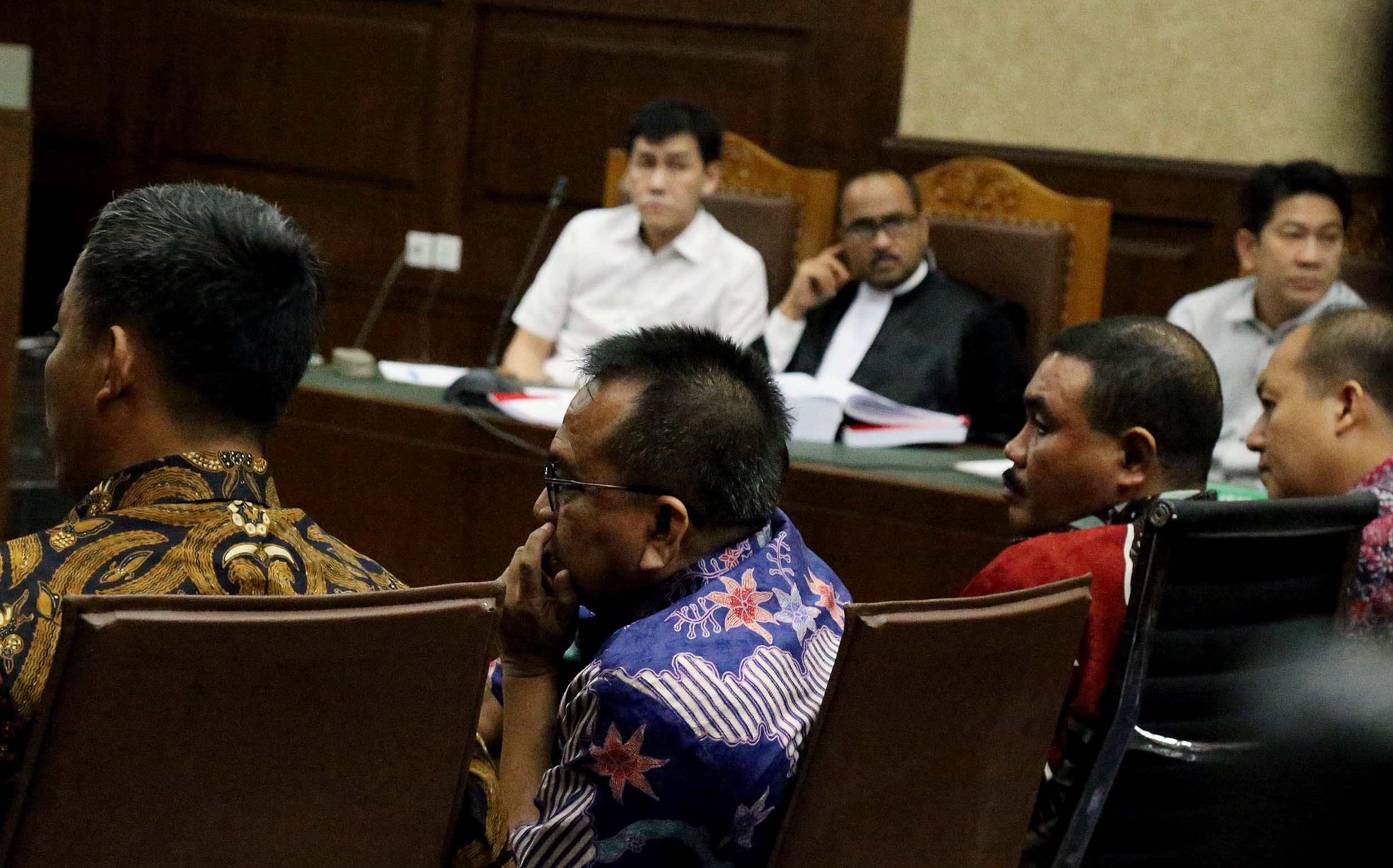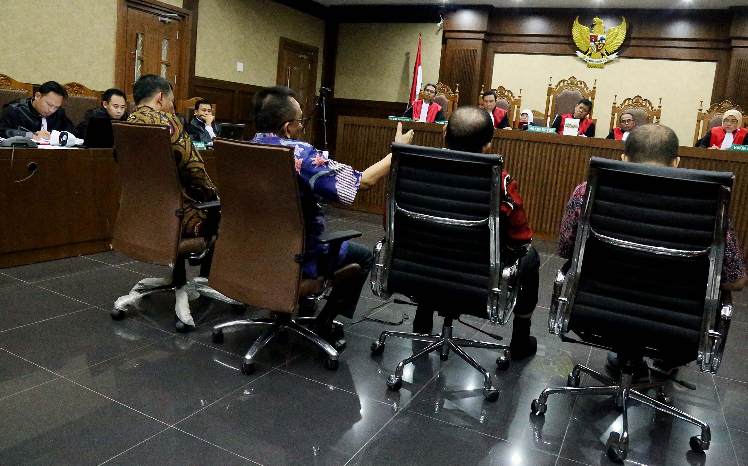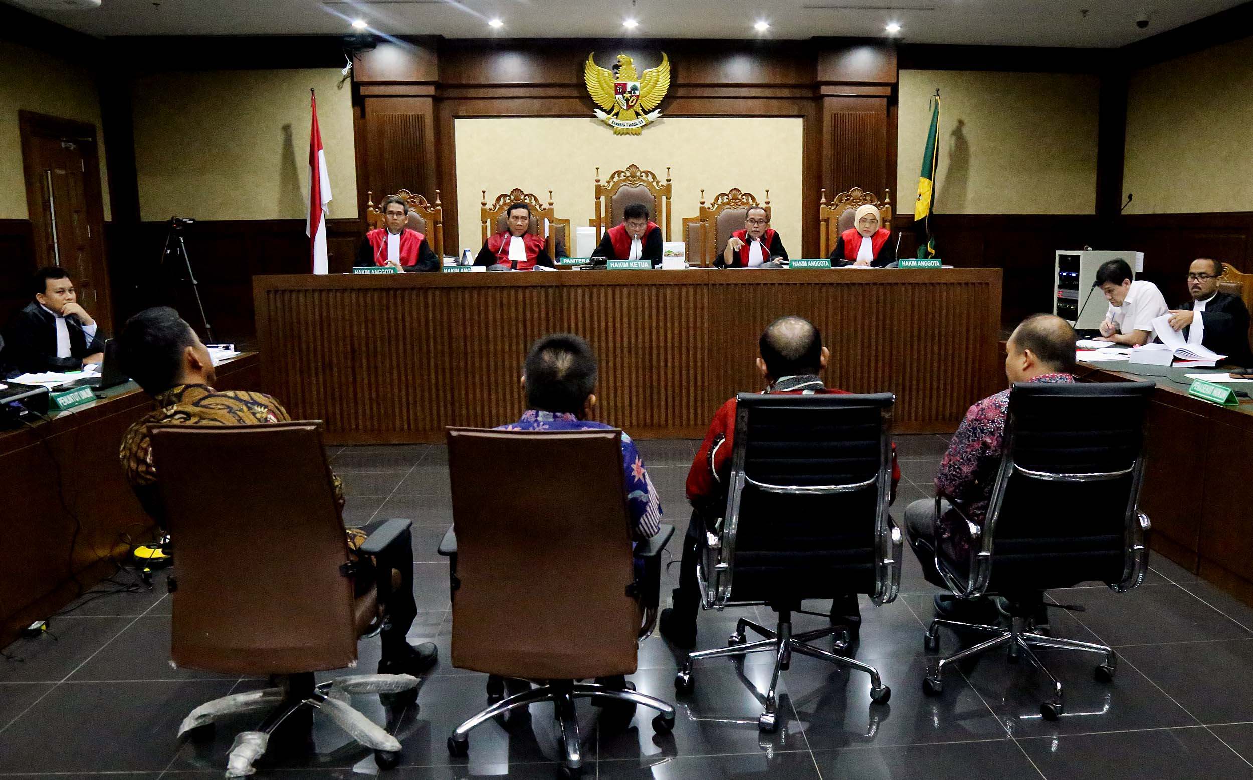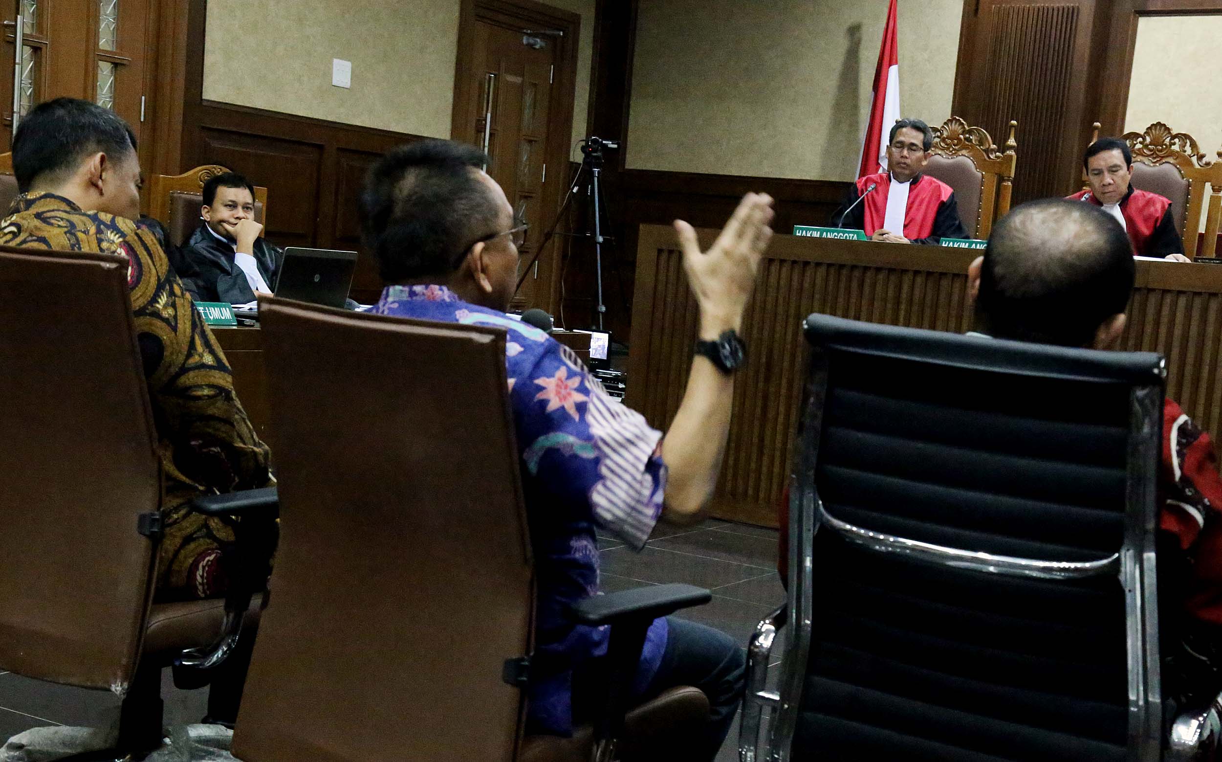 Terdakwa kasus suap pembahasan rancangan peraturan daerah tentang reklamasi Ariesman Widjaja (kiri) dan Trinanda Prihantoro (kanan) mendengarkan kesaksian dari Ketua DPRD DKI Jakarta Prasetyo Edi Marsudi saat sidang lanjutan di Pengadilan Tipikor, Jakarta, Rabu (20/7/2016). Sidang tersebut beragendakan keterangan empat orang saksi, Ketua DPRD DKI Jakarta Prasetyo Edi Marsudi, Wakil Ketua DPRD DKI Jakarta Muhammad Taufik, Ketua Fraksi Hanura DPRD DKI Muhammad Ongen Sangaji, dan Ketua Fraksi PKS Selamat Nurdin.