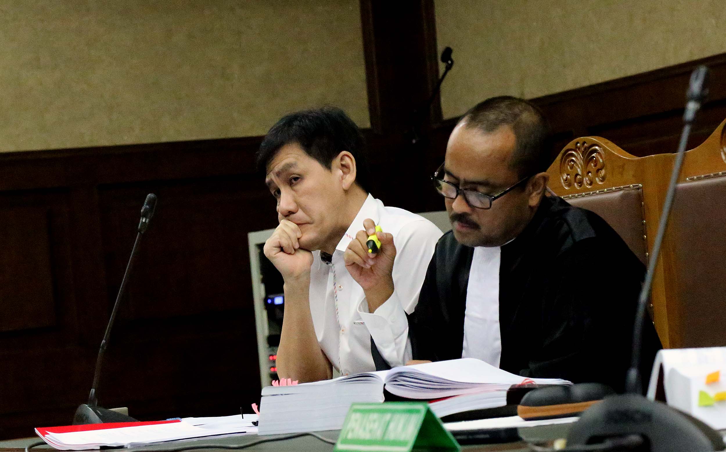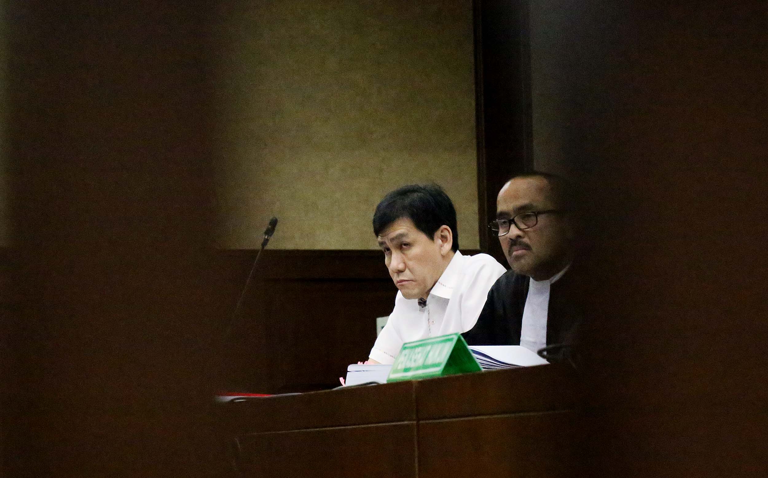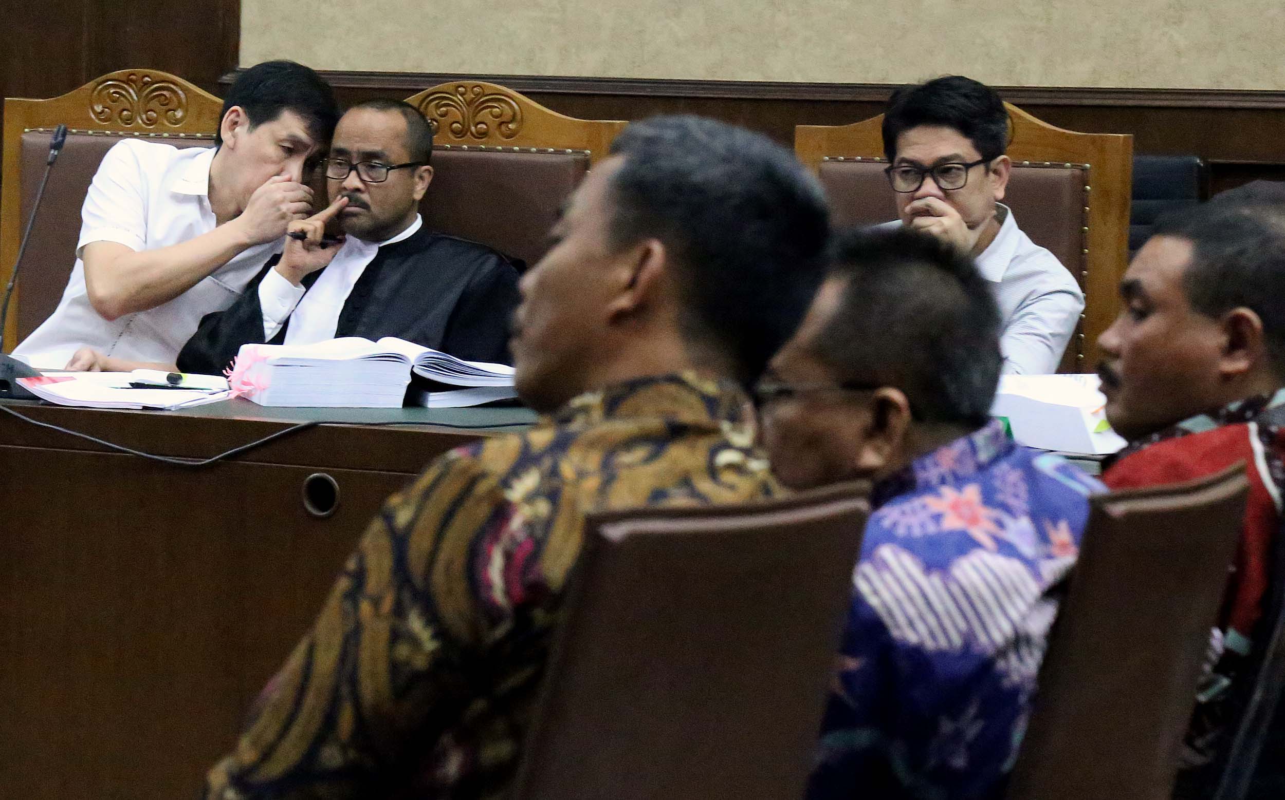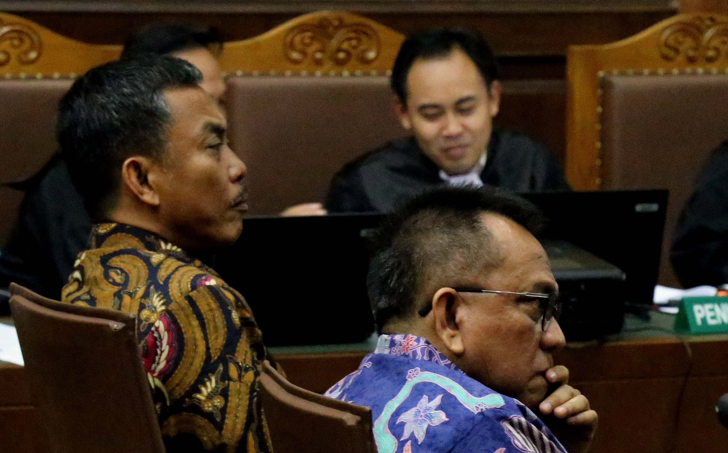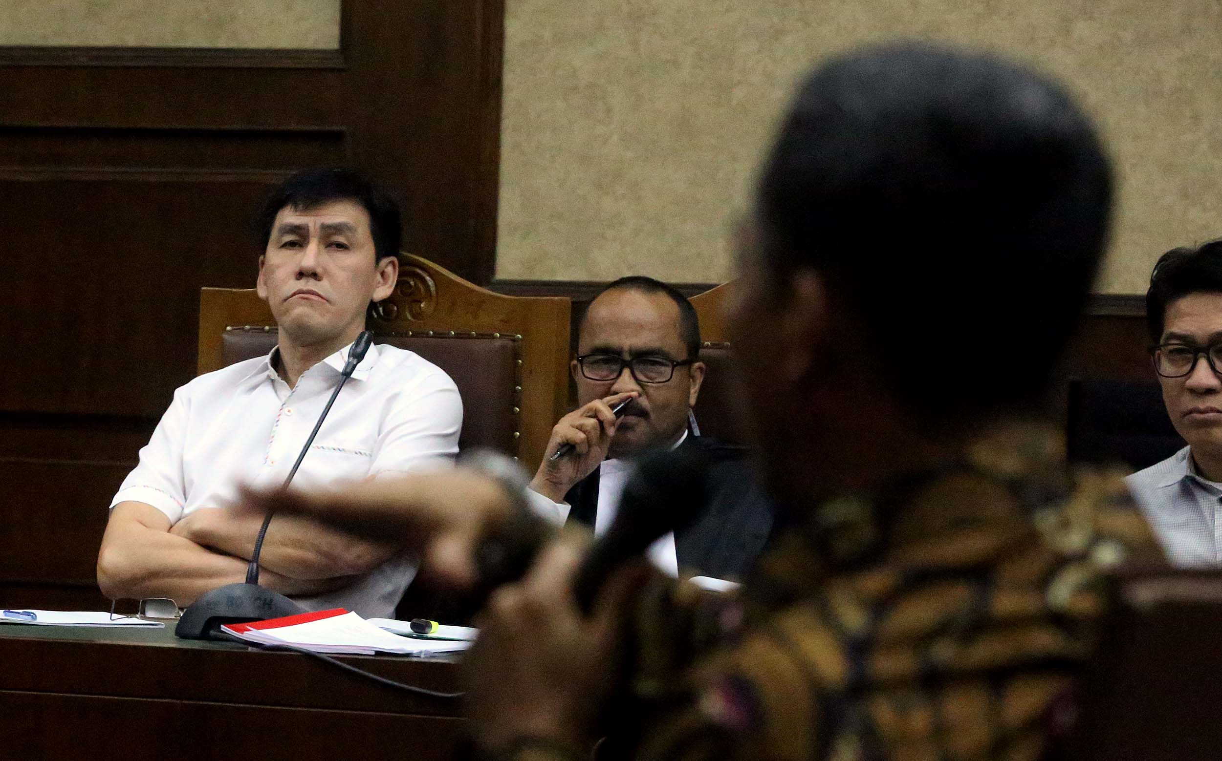 Terdakwa kasus suap pembahasan rancangan peraturan daerah tentang reklamasi Ariesman Widjaja (kiri) dan Trinanda Prihantoro (kanan) mendengarkan kesaksian dari Ketua DPRD DKI Jakarta Prasetyo Edi Marsudi saat sidang lanjutan di Pengadilan Tipikor, Jakarta, Rabu (20/7/2016). Sidang tersebut beragendakan keterangan empat orang saksi, Ketua DPRD DKI Jakarta Prasetyo Edi Marsudi, Wakil Ketua DPRD DKI Jakarta Muhammad Taufik, Ketua Fraksi Hanura DPRD DKI Muhammad Ongen Sangaji, dan Ketua Fraksi PKS Selamat Nurdin.