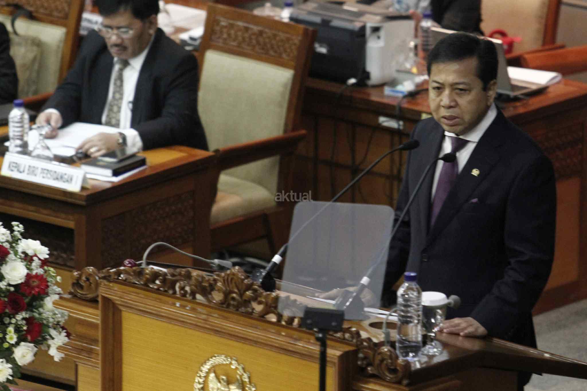 Ketua DPR Setya Novanto ketika menyampaikan Pidato Pembukaan Masa Persidangan IV tahun Sidang 2016-2017 di Kompleks Parlemen, Senayan, Jakarta, Rabu (15/3). DPR berkomitmen mempercepat proses pembahasan RUU yang menjadi prioritas tahun 2017 diantaranya 10 RUU, yaitu RUU tentang Penyelenggaraan Pemilu, RUU (MD 3), RUU tentang KUHP dan RUU tentang Pemberantaran Terorisme. AKTUAL/Tino Oktaviano