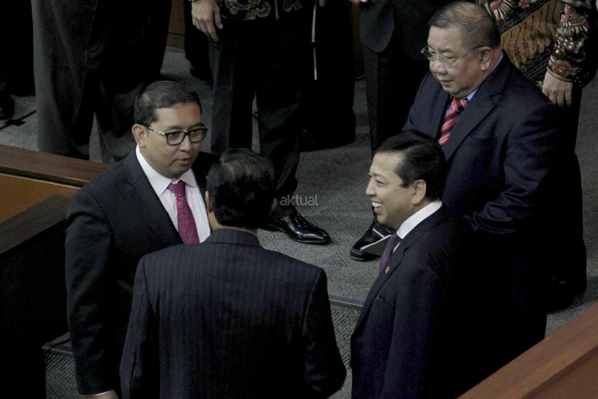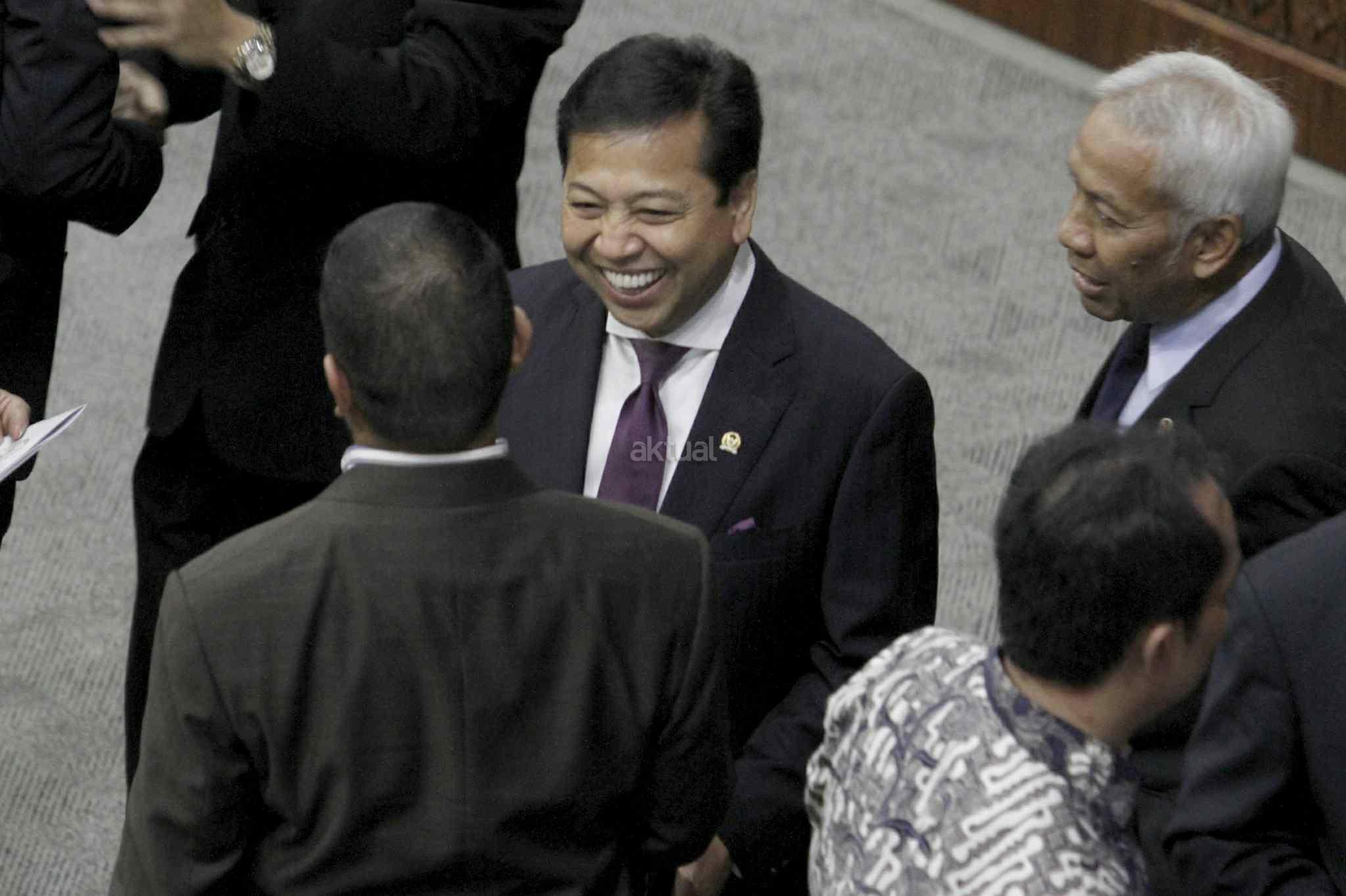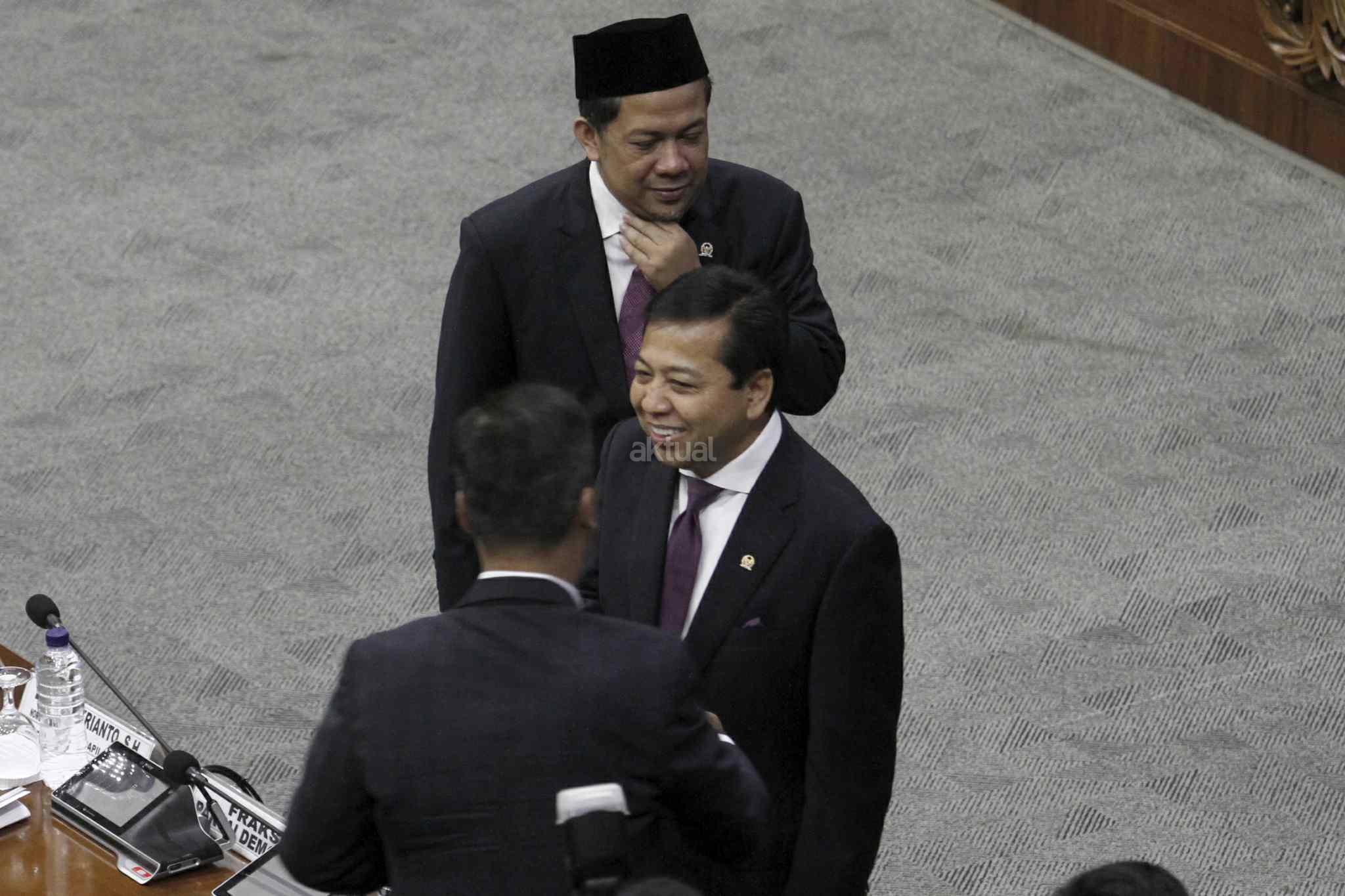 Ketua DPR Setya Novanto berbincang dengan sebelum Pembukaan Masa Persidangan IV tahun Sidang 2016-2017 di Kompleks Parlemen, Senayan, Jakarta, Rabu (15/3). DPR berkomitmen mempercepat proses pembahasan RUU yang menjadi prioritas tahun 2017 diantaranya 10 RUU, yaitu RUU tentang Penyelenggaraan Pemilu, RUU (MD 3), RUU tentang KUHP dan RUU tentang Pemberantaran Terorisme. AKTUAL/Tino Oktaviano