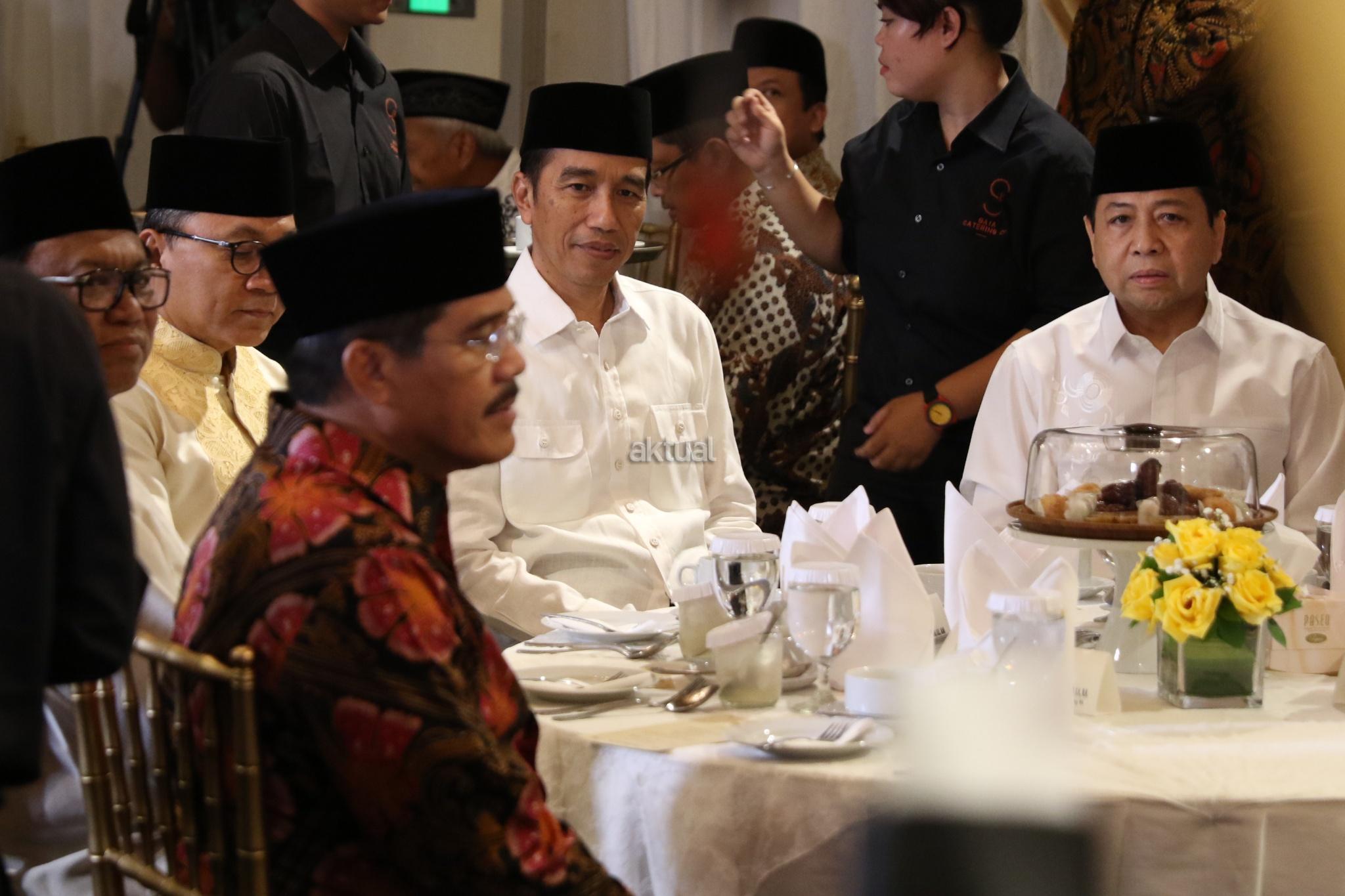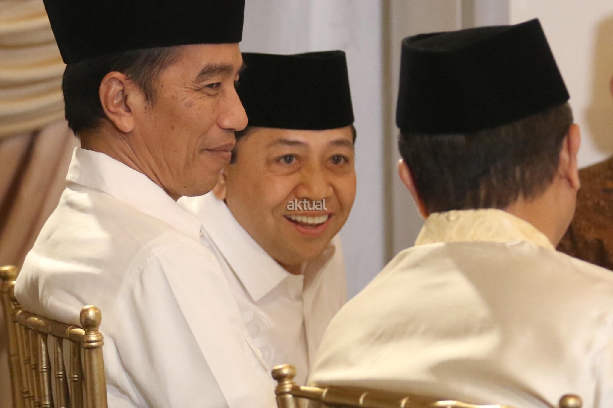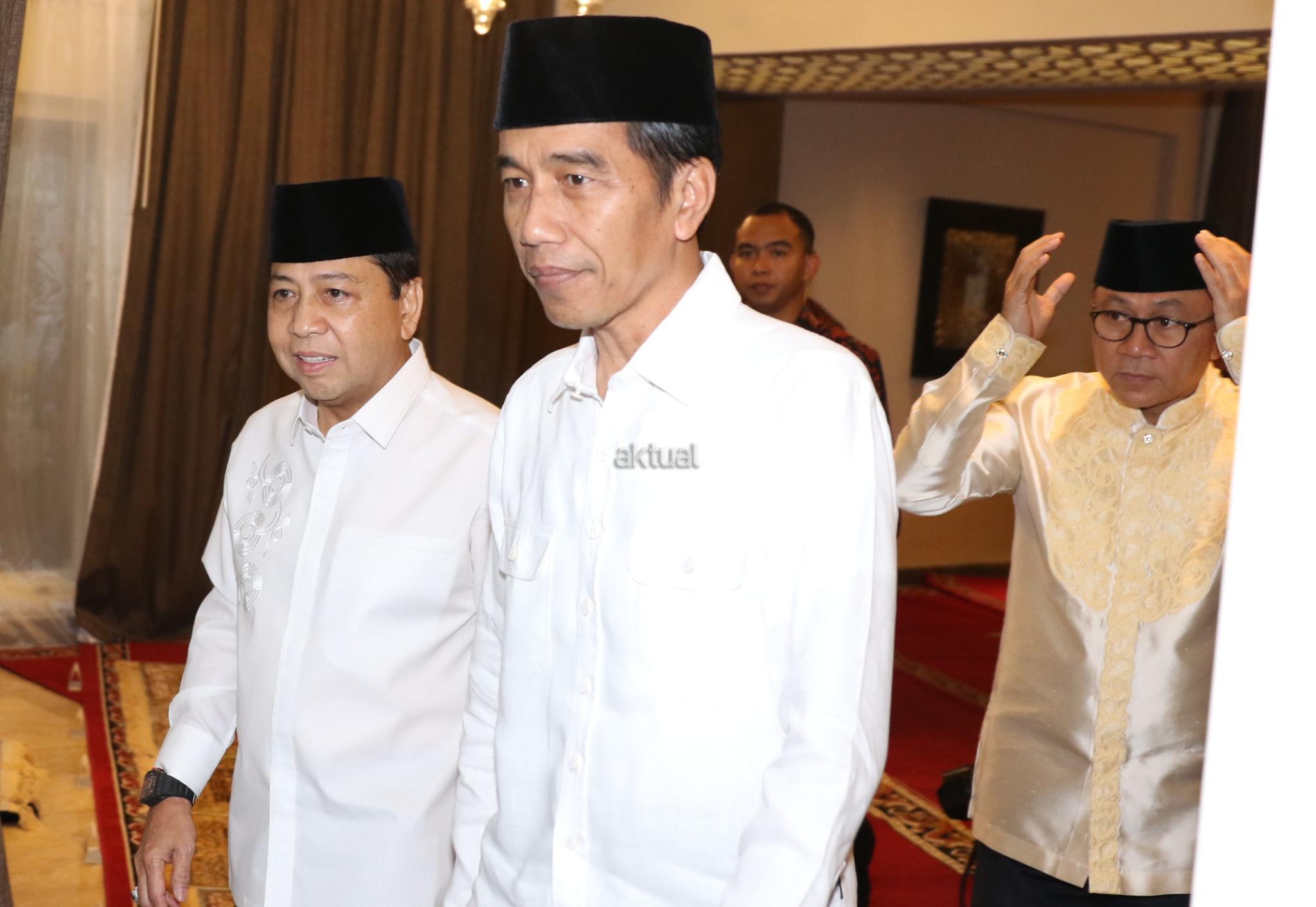 Presiden Joko Widodo berjalan bersama Ketua DPR Setya Novanto diikuti Ketua MPR Zulkifli Hasan menghadiri acara buka puasa bersama di kompleks Widya Chandra, Jakarta, Senin (5/6). Buka puasa bersama tersebut dihadiri sejumlah pimpinan lembaga negara, jajaran menteri serta tokoh partai politik. AKTUAL/Tino Oktaviano