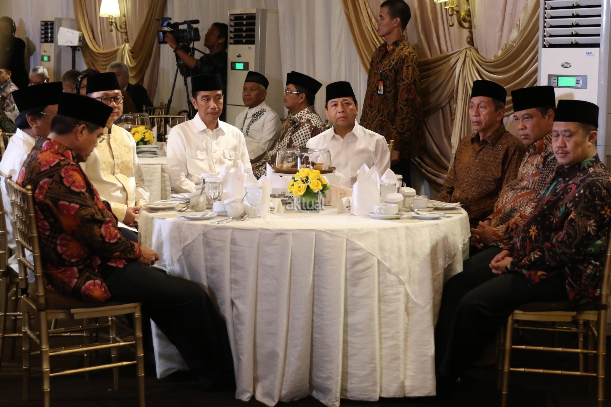 Presiden Joko Widodo (keempat kanan) bersama Ketua DPR Setya Novanto (ketiga kanan), Ketua MPR Zulkifli Hasan (kedua kiri), Ketua DPD Oesman Sapta Odang (kiri), Ketua BPK Moermahadi Soerja Djanegara (kedua kanan), dan Ketua MK Arief Hidayat (kanan) berbuka puasa bersama di rumah dinas Ketua DPR di kompleks Widya Chandra, Jakarta, Senin (5/6). Buka puasa bersama tersebut dihadiri sejumlah pimpinan lembaga negara, jajaran menteri serta tokoh partai politik. AKTUAL/Tino Oktaviano