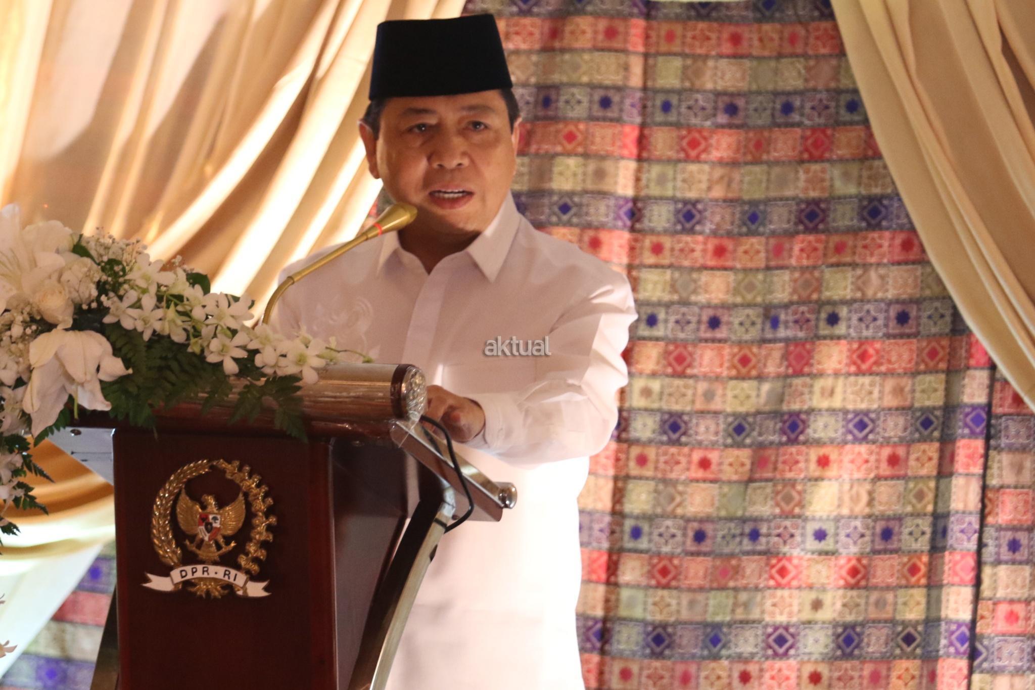 Ketua DPR Setya Novanto memberikan sambutan saat acara berbuka puasa bersama di kediaman dinas Ketua DPR di kompleks Widya Chandra, Jakarta, Senin (5/6). Buka puasa bersama tersebut dihadiri sejumlah pimpinan lembaga negara, jajaran menteri serta tokoh partai politik. AKTUAL/Tino Oktaviano