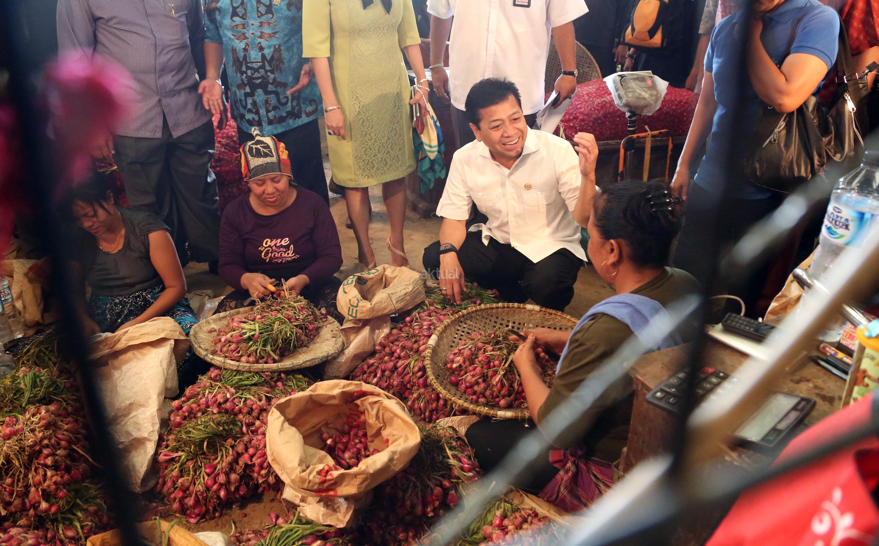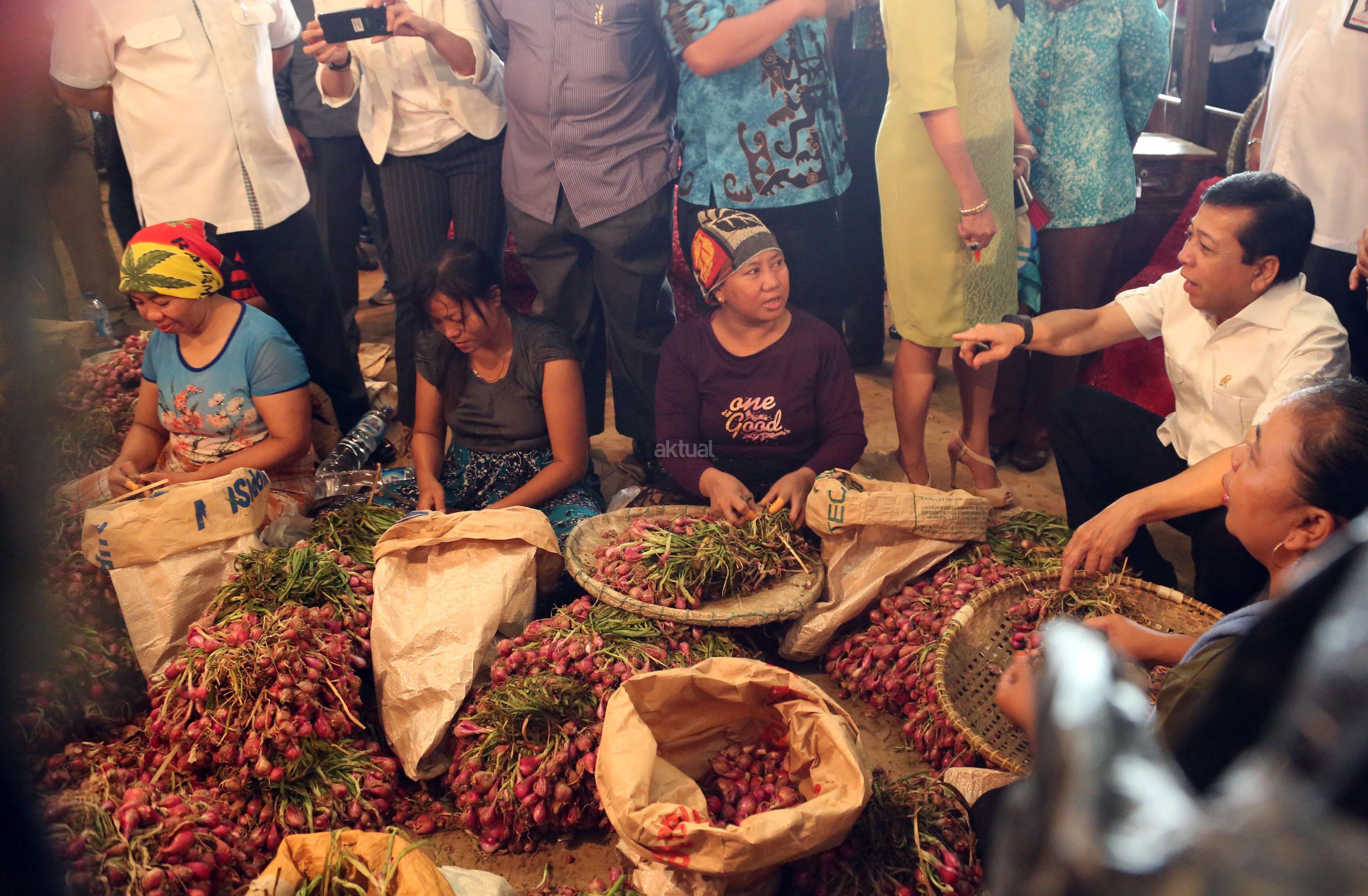 Ketua DPR RI Setya Novanto berbincang dengan pedagang bawang saat melakukan sidak harga cabai di Pasar Induk Kramat Jati, Jakarta Timur, Kamis (12/1/2017). Harga cabai yang melambung tinggi menjadi keprihatinan Ketua DPR untuk melihat langsung harga cabai di pasar. Harga cabai merah di Pasar Induk Kramat Jati mencapai Rp100 ribu per kg. Sebelumnya pernah menyentuh Rp120 ribu per kg. Kenaikan ini disebabkan salah satunya faktor cuaca yang membuat banyak cabai rusak. AKTUAL/Tino Oktaviano