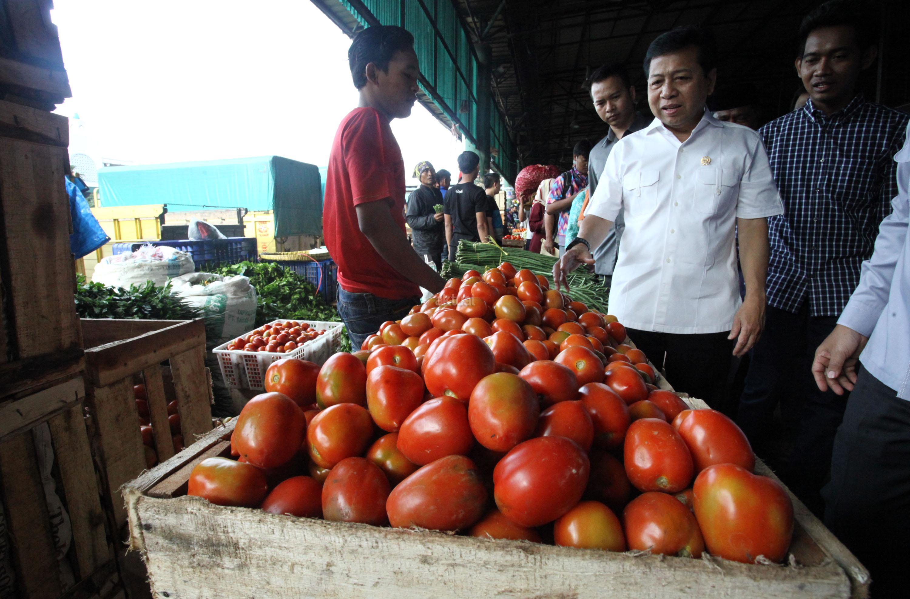 Ketua DPR RI Setya Novanto berbincang dengan pedagang tomat saat melakukan sidak harga cabai di Pasar Induk Kramat Jati, Jakarta Timur, Kamis (12/1/2017). Harga cabai yang melambung tinggi menjadi keprihatinan Ketua DPR untuk melihat langsung harga cabai di pasar. Harga cabai merah di Pasar Induk Kramat Jati mencapai Rp100 ribu per kg. Sebelumnya pernah menyentuh Rp120 ribu per kg. Kenaikan ini disebabkan salah satunya faktor cuaca yang membuat banyak cabai rusak. AKTUAL/Tino Oktaviano