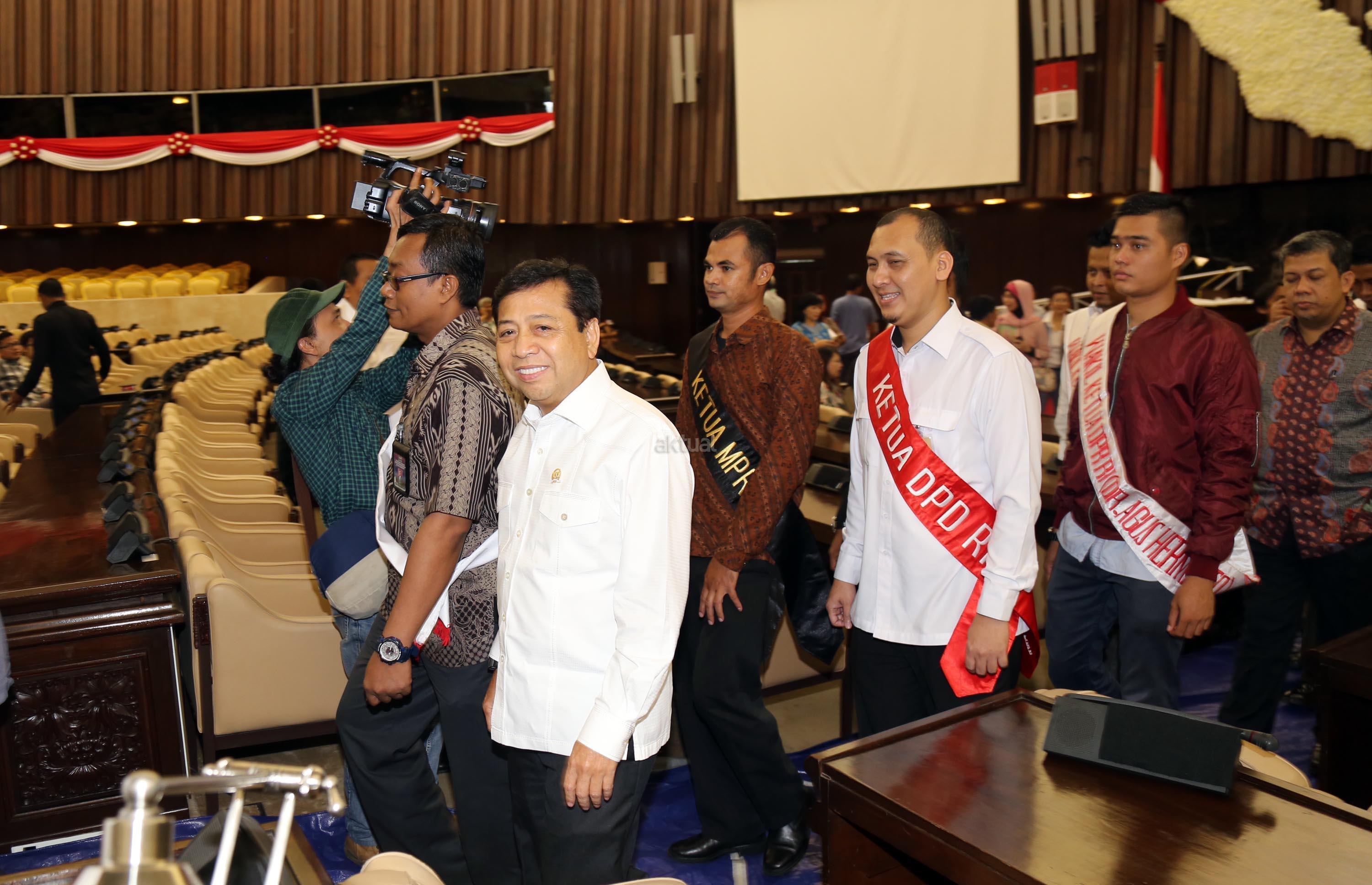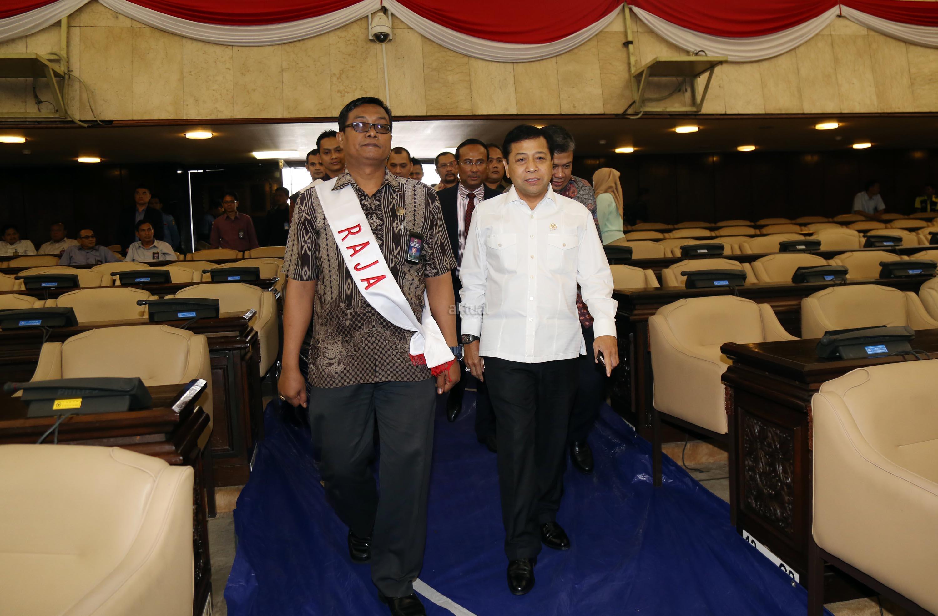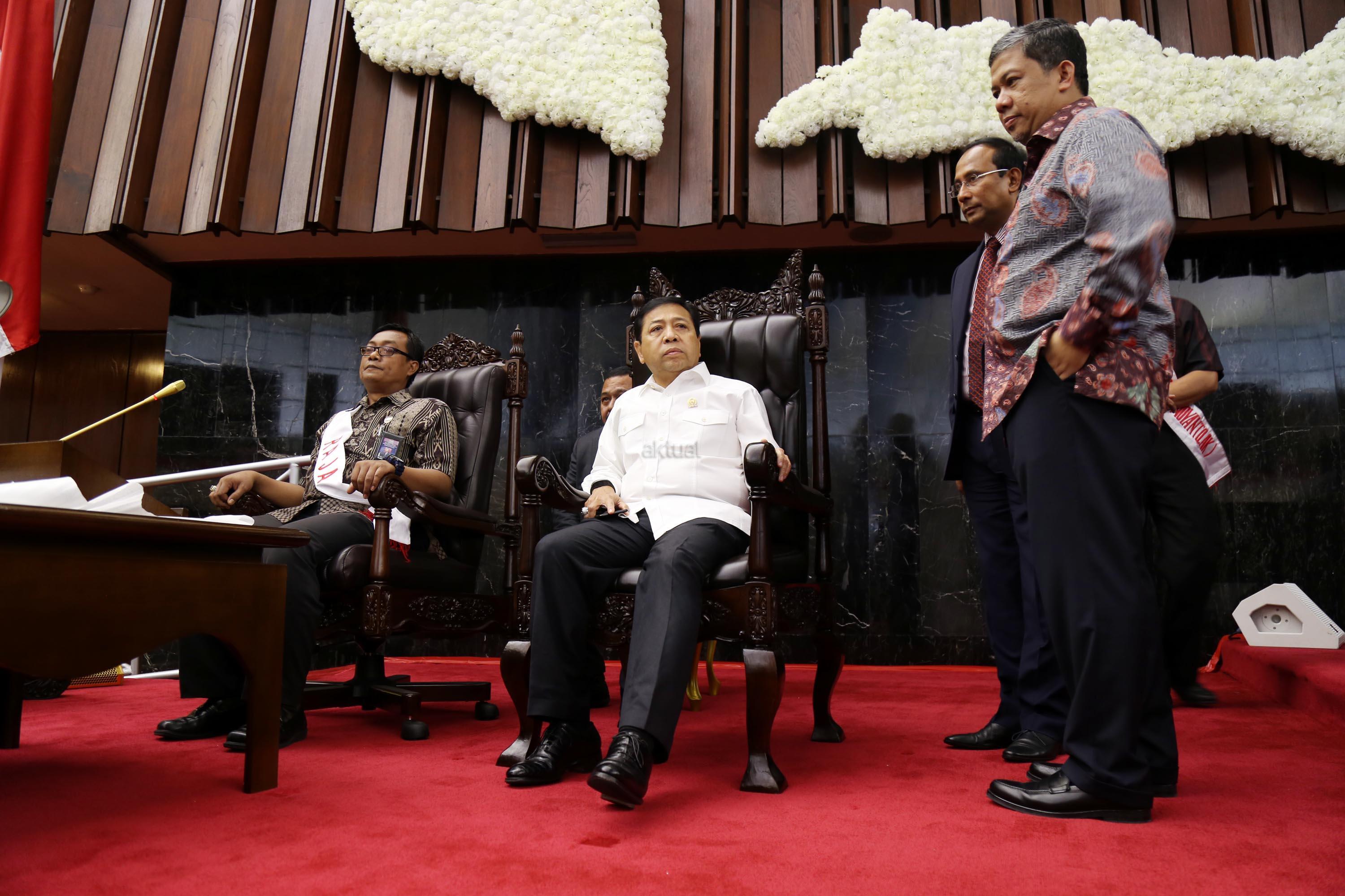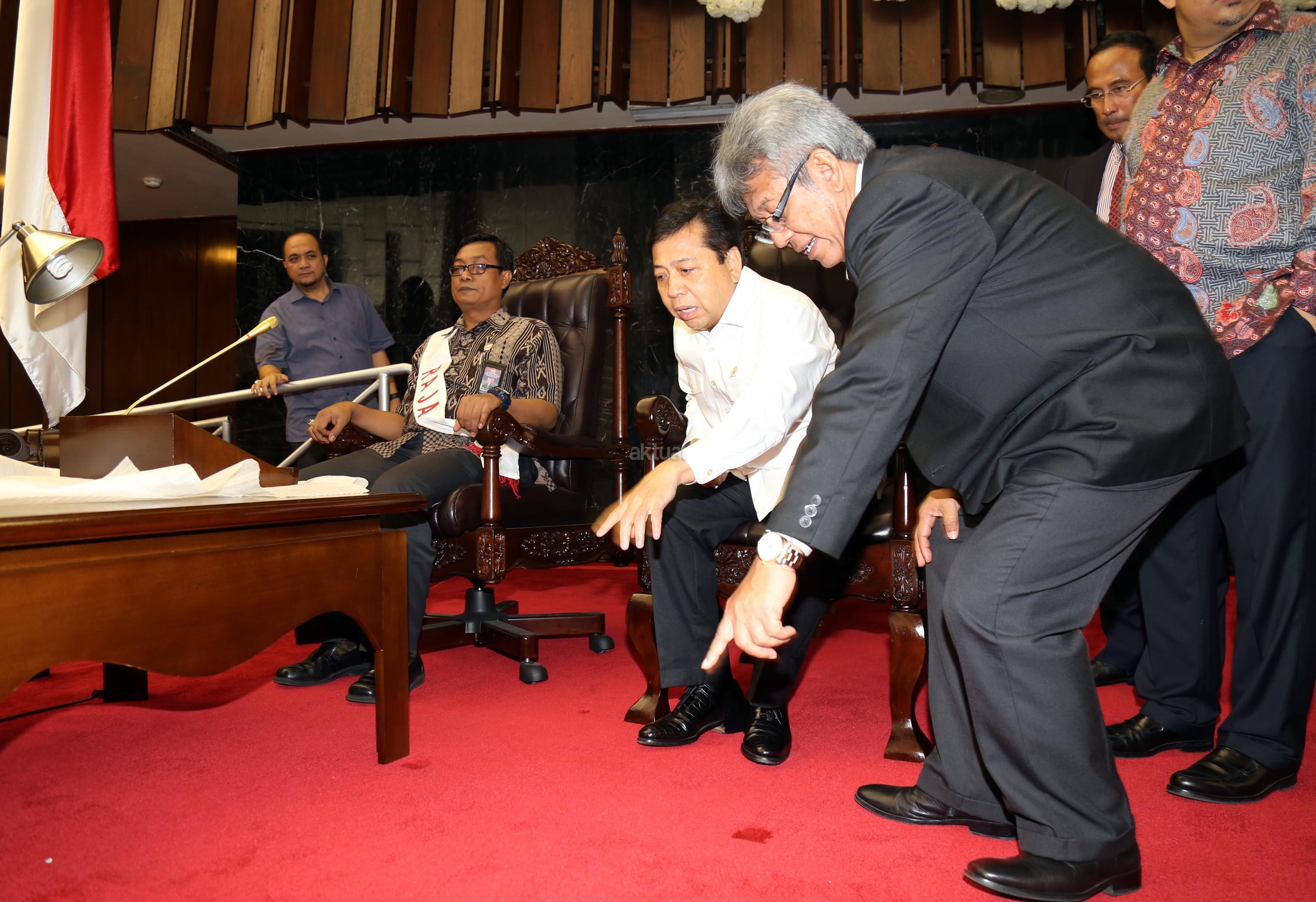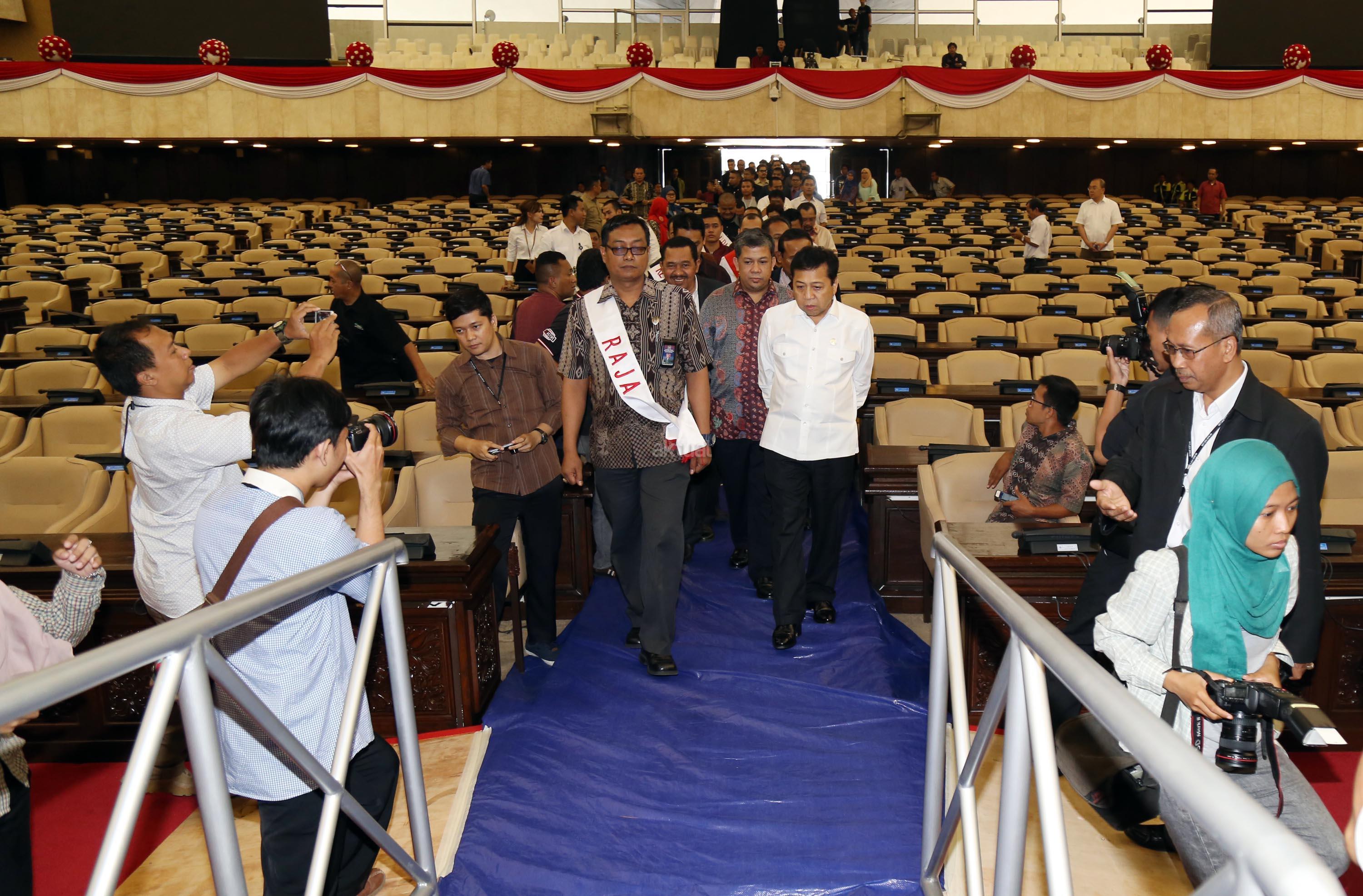 Ketua Dewan Perwakilan Rakyat (DPR) Setya Novanto didampingi oleh Wakil Ketua DPR RI Fahri Hamzah meninjau persiapan pelaksanaan kedatangan Raja Salman Bin Abdulazis di Ruang Paripurna Gedung DPR Komplek Parlemen, Senayan, Jakarta, Selasa (28/2). Raja Arab Saudi Salman bin Abdulaziz al-Saud akan mengunjungi DPR, Kamis (2/3) siang. Pada kesempatan tersebut, Raja Salman akan menyampaikan pidato kurang lebih selama 10 menit menggunakan Bahasa Arab. Sebelum Raja Salman berpidato, Ketua DPR RI Setya Novanto akan menyampaikan pidato terlebih dahulu. AKTUAL/Tino Oktaviano