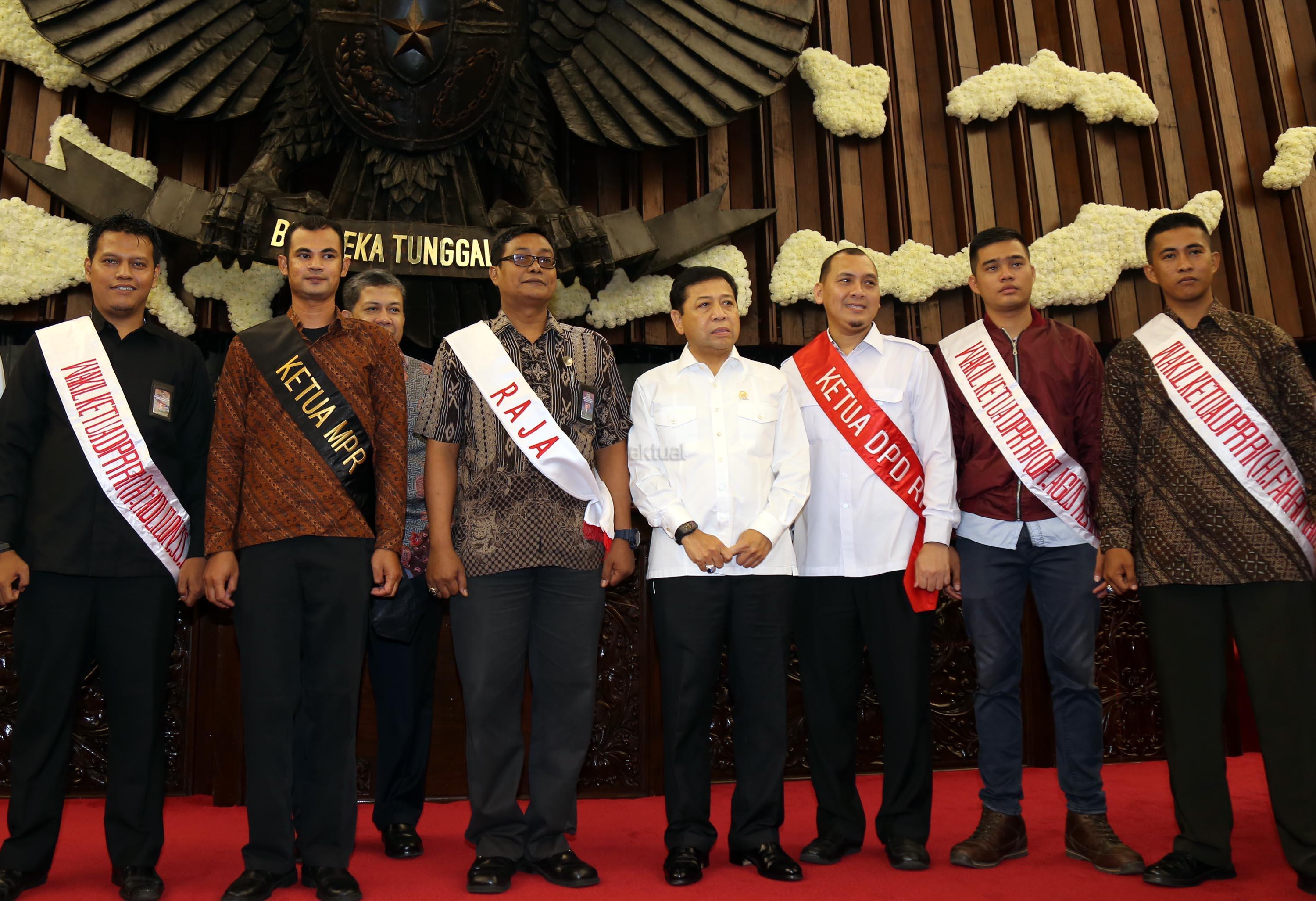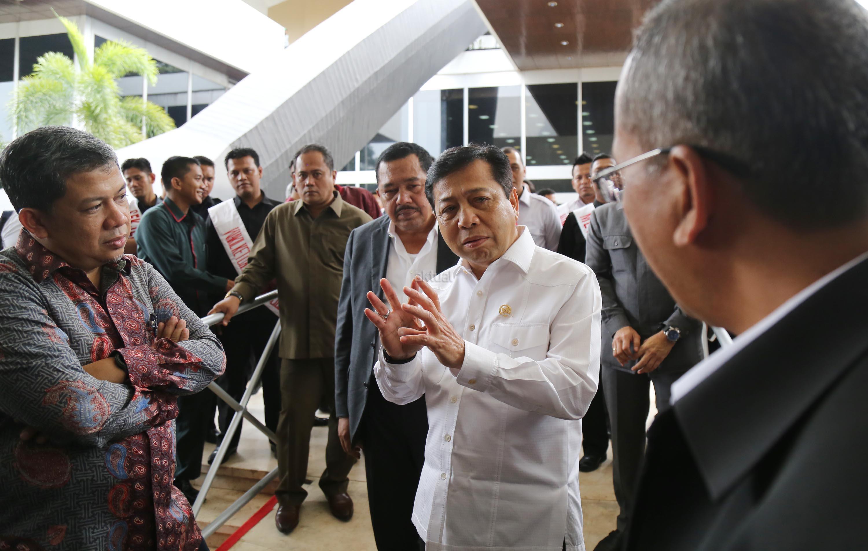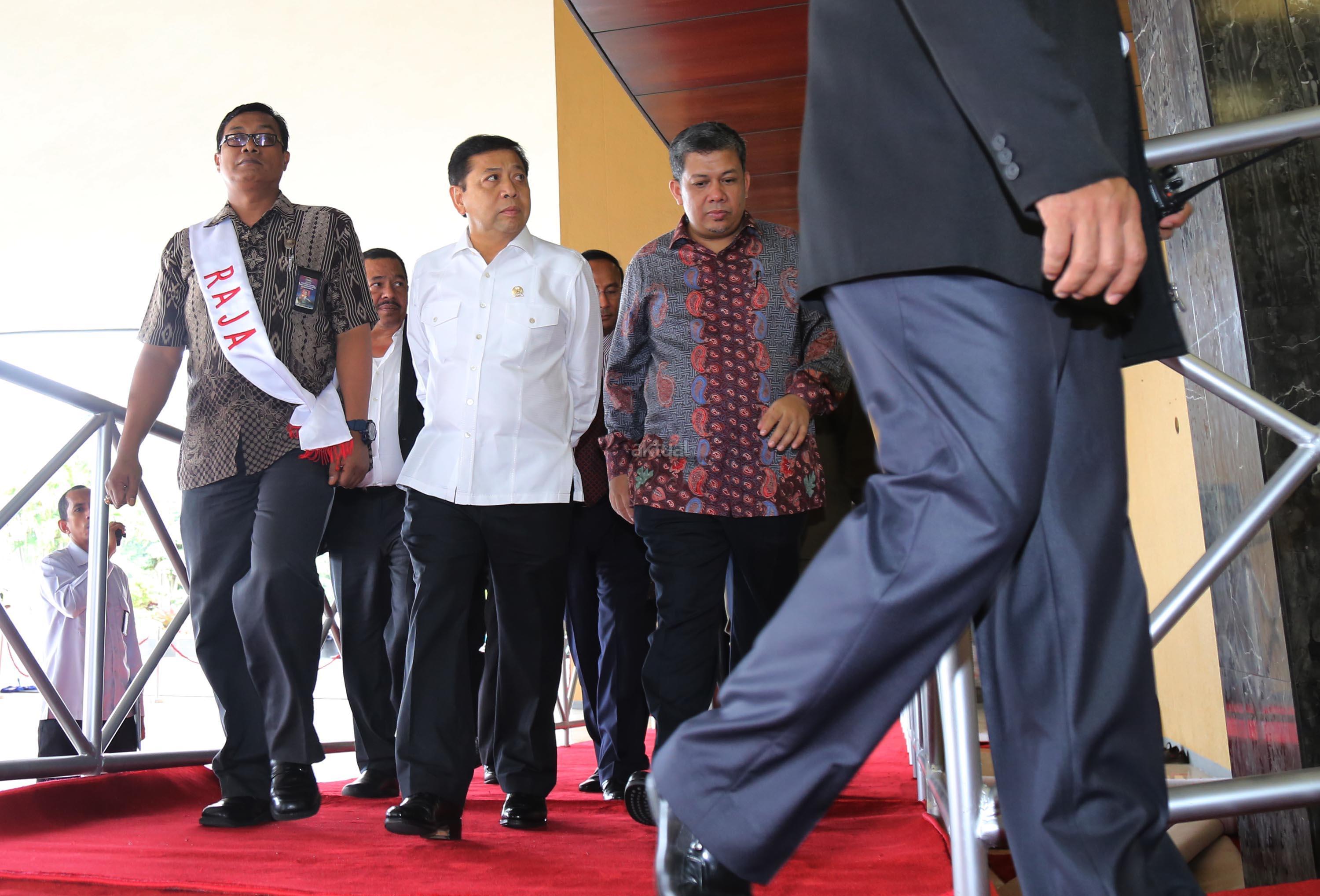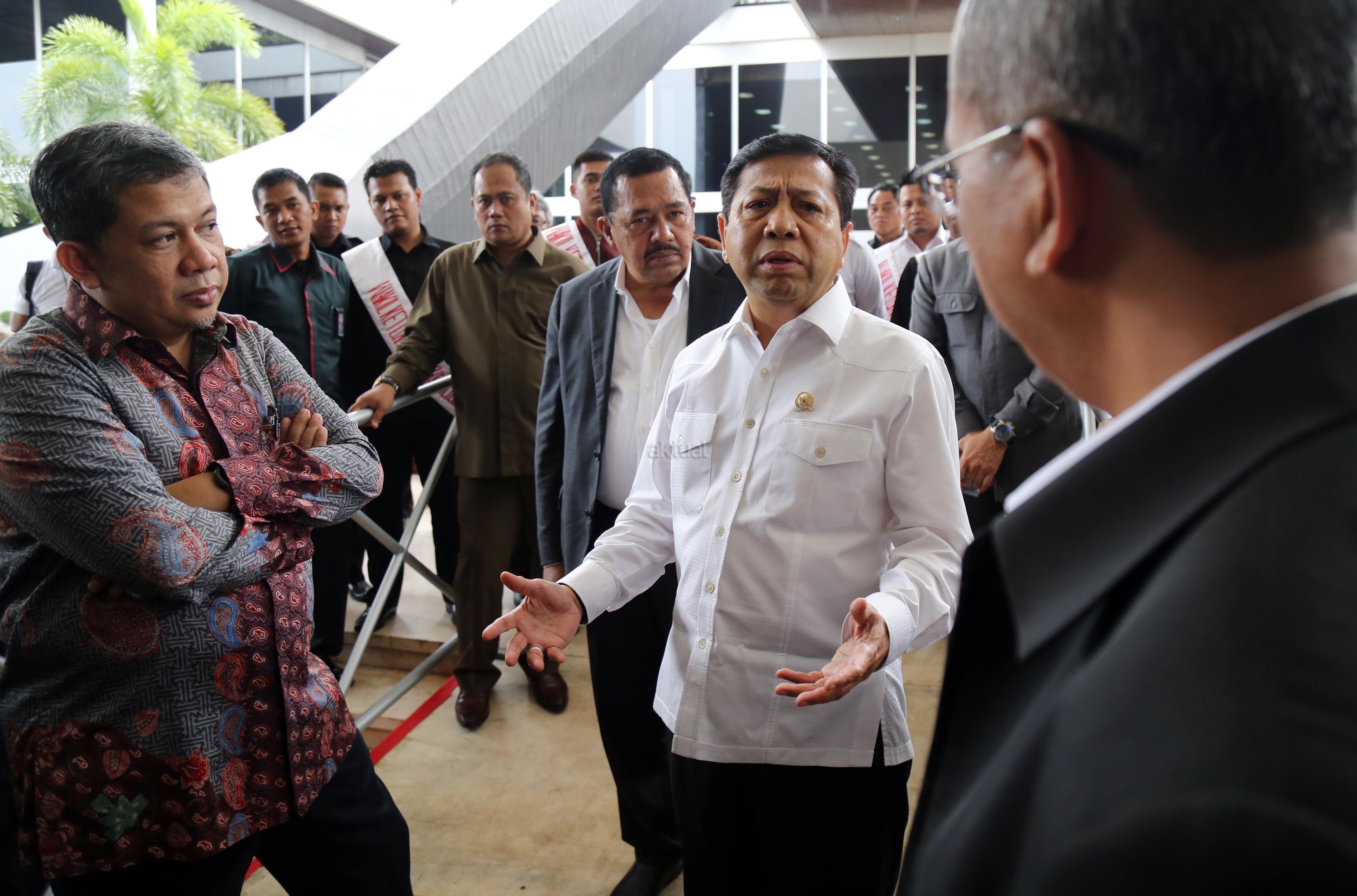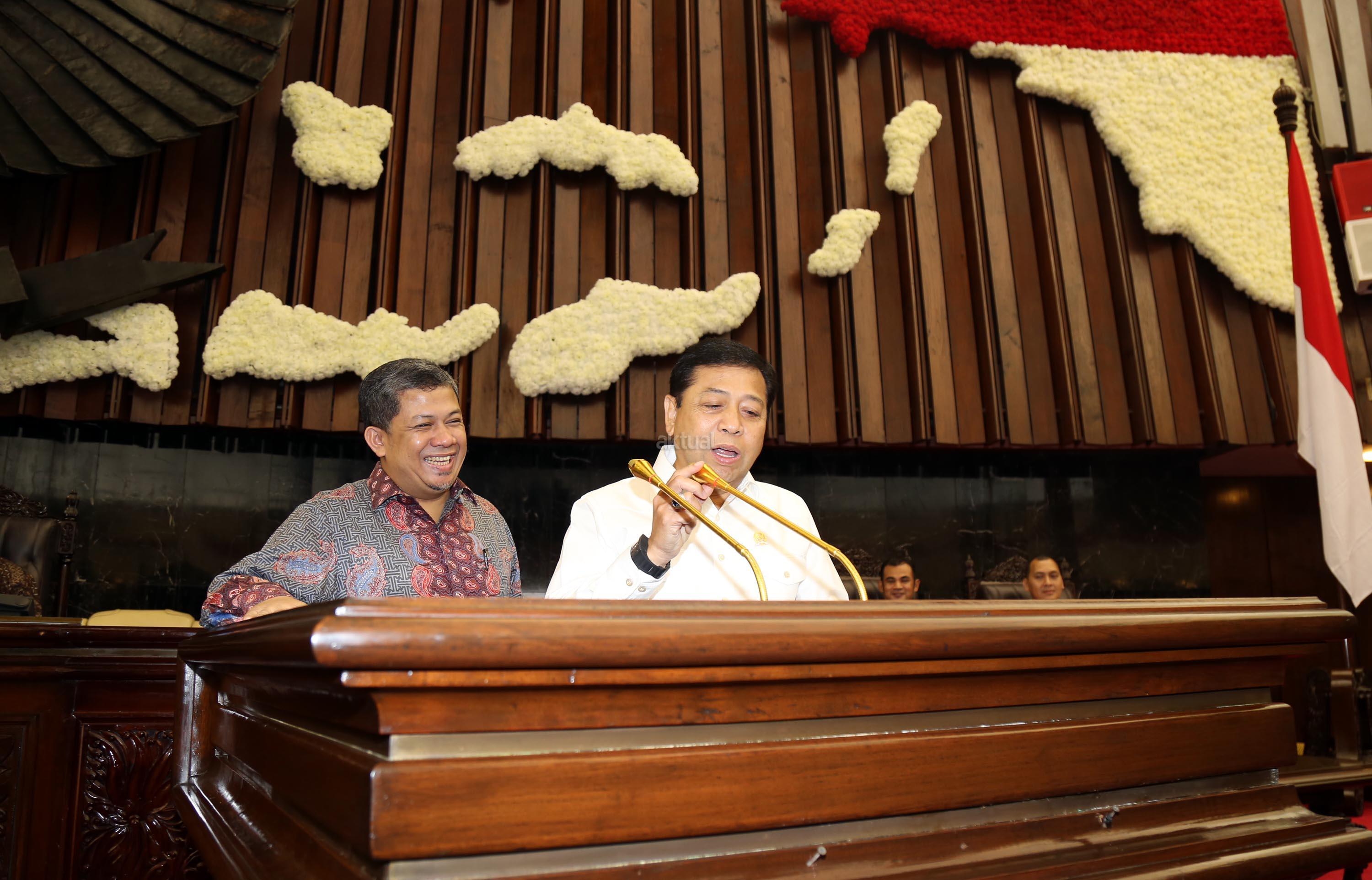 Ketua Dewan Perwakilan Rakyat (DPR) Setya Novanto didampingi oleh Wakil Ketua DPR RI Fahri Hamzah meninjau persiapan pelaksanaan kedatangan Raja Salman Bin Abdulazis di Ruang Paripurna Gedung DPR Komplek Parlemen, Senayan, Jakarta, Selasa (28/2). Raja Arab Saudi Salman bin Abdulaziz al-Saud akan mengunjungi DPR, Kamis (2/3) siang. Pada kesempatan tersebut, Raja Salman akan menyampaikan pidato kurang lebih selama 10 menit menggunakan Bahasa Arab. Sebelum Raja Salman berpidato, Ketua DPR RI Setya Novanto akan menyampaikan pidato terlebih dahulu. AKTUAL/Tino Oktaviano