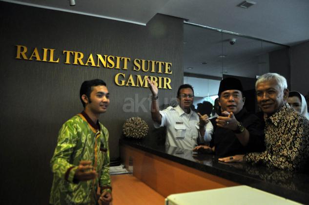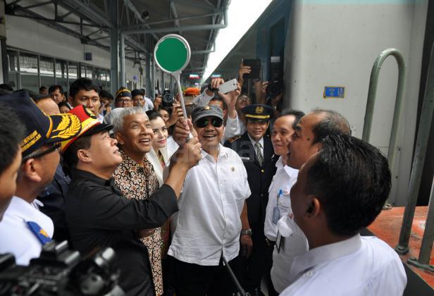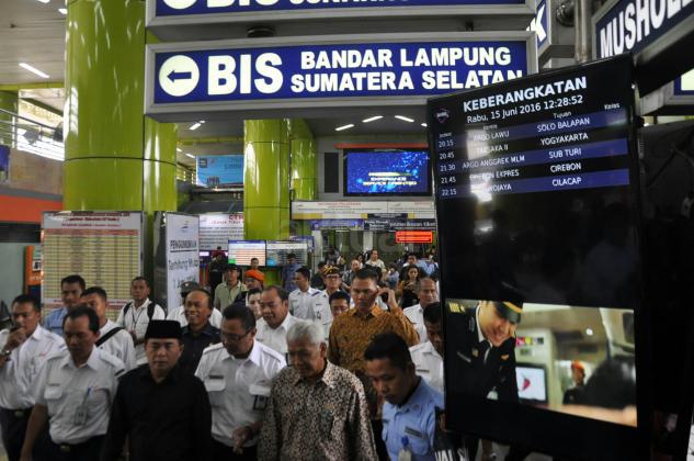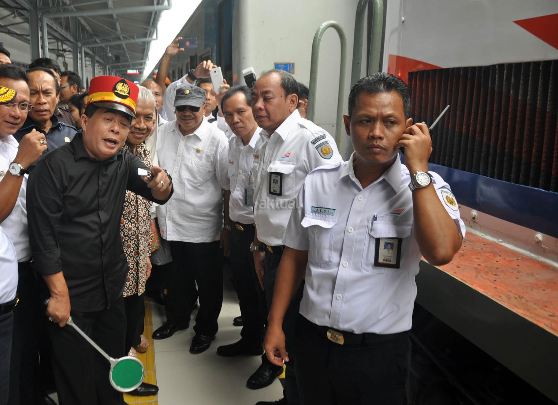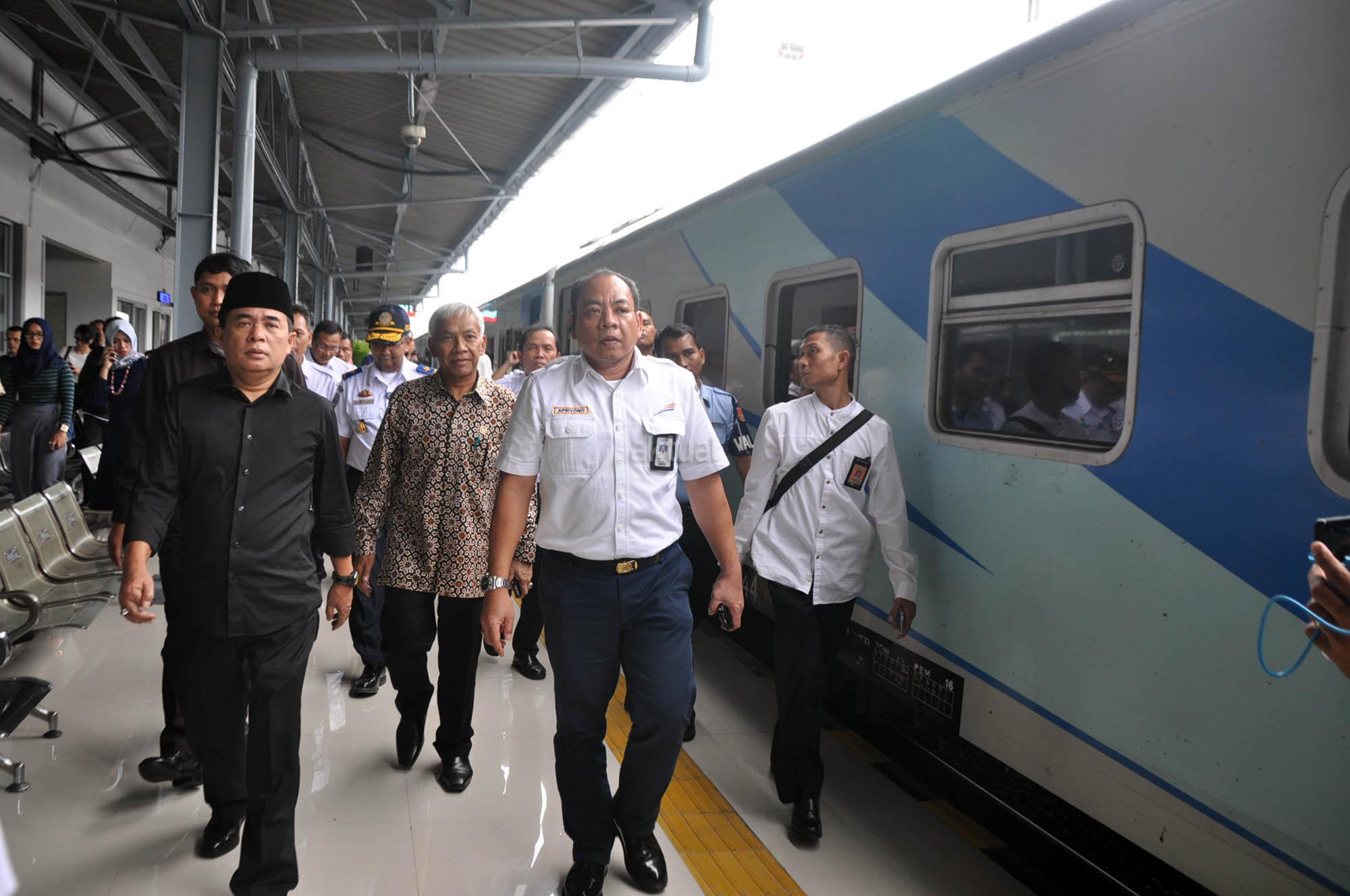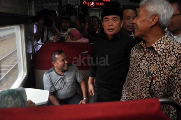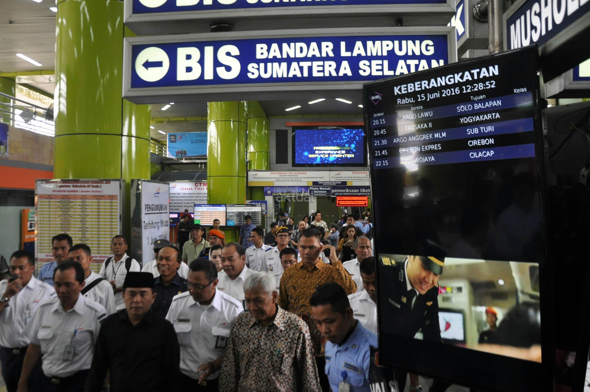Ketua DPR Ade Komarudin bersama Wakil Ketua DPR Agus Hermanto berbincang dengan penumpang Kereta Ekonomi AC Krakatau jurusan Merak-Kediri di Stasiun Senen, Jakarta Pusat, Rabu (15/6/2016). Pimpinan dan sejumlah anggota DPR memantau persiapan PT KAI menjelang mudik Lebaran 1437 H di Stasiun Gambir dan Pasar Senen, Jakarta.