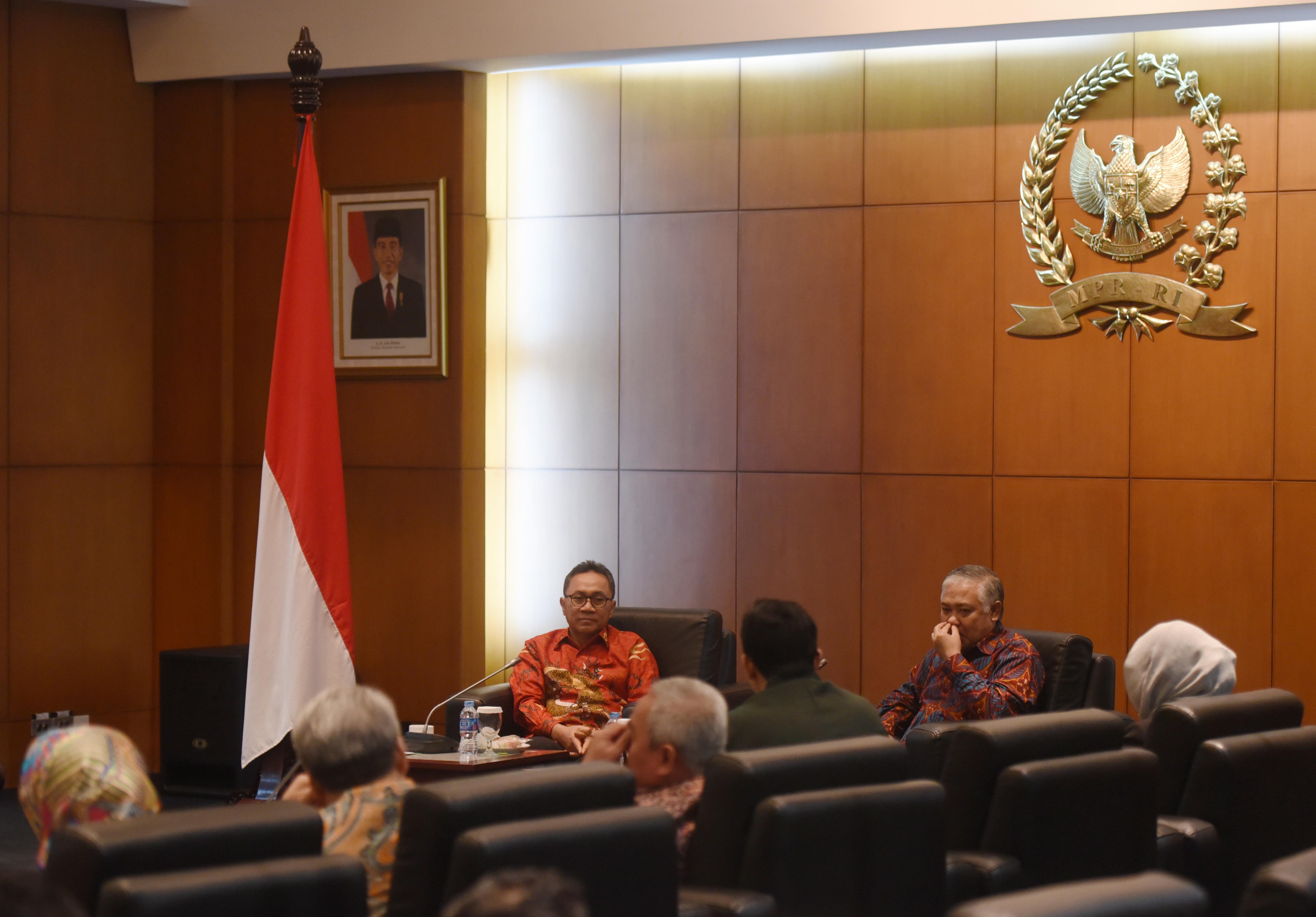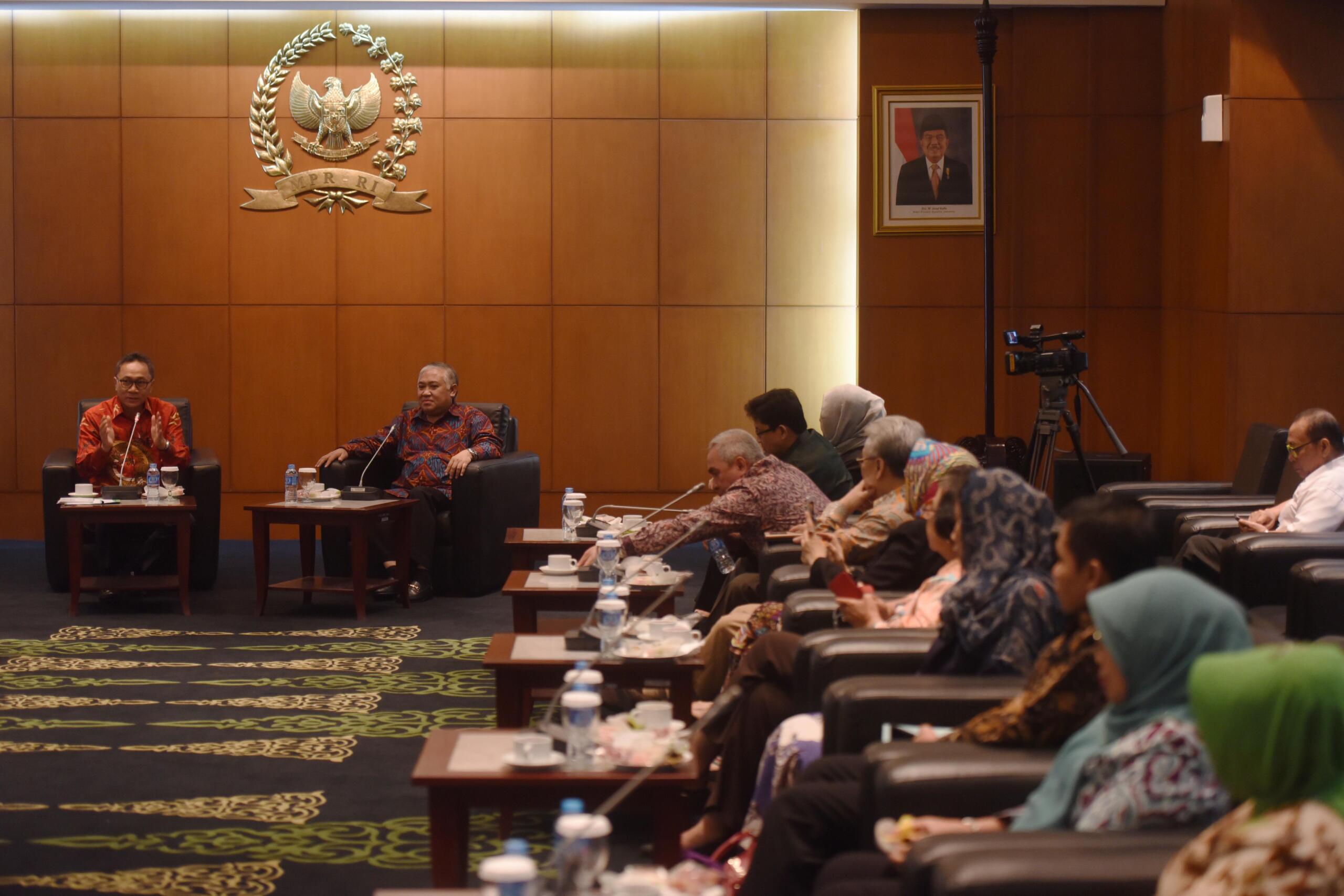 Ketua MPR Zulkifli Hasan (kiri) berbincang dengan Ketua Dewan Nasional Pergerakan Indonesia Maju Din Syamsuddin (kedua kiri) dan jajaran pengurusnya dalam pertemuan di Kompleks Parlemen Senayan, Jakarta, Senin (16/5). Pertemuan itu membahas rencana deklarasi organisasi Pergerakan Indonesia Maju pada 21 Mei 2016. ANTARA FOTO/Akbar Nugroho Gumay/ama/16