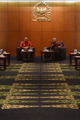 Ketua MPR Zulkifli Hasan (kiri) berbincang dengan Ketua Dewan Nasional Pergerakan Indonesia Maju Din Syamsuddin dalam pertemuan di Kompleks Parlemen Senayan, Jakarta, Senin (16/5). Pertemuan itu membahas rencana deklarasi organisasi Pergerakan Indonesia Maju pada 21 Mei 2016. ANTARA FOTO/Akbar Nugroho Gumay/ama/16