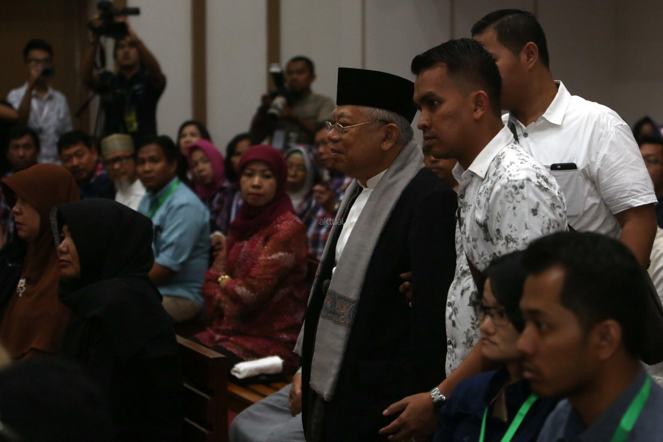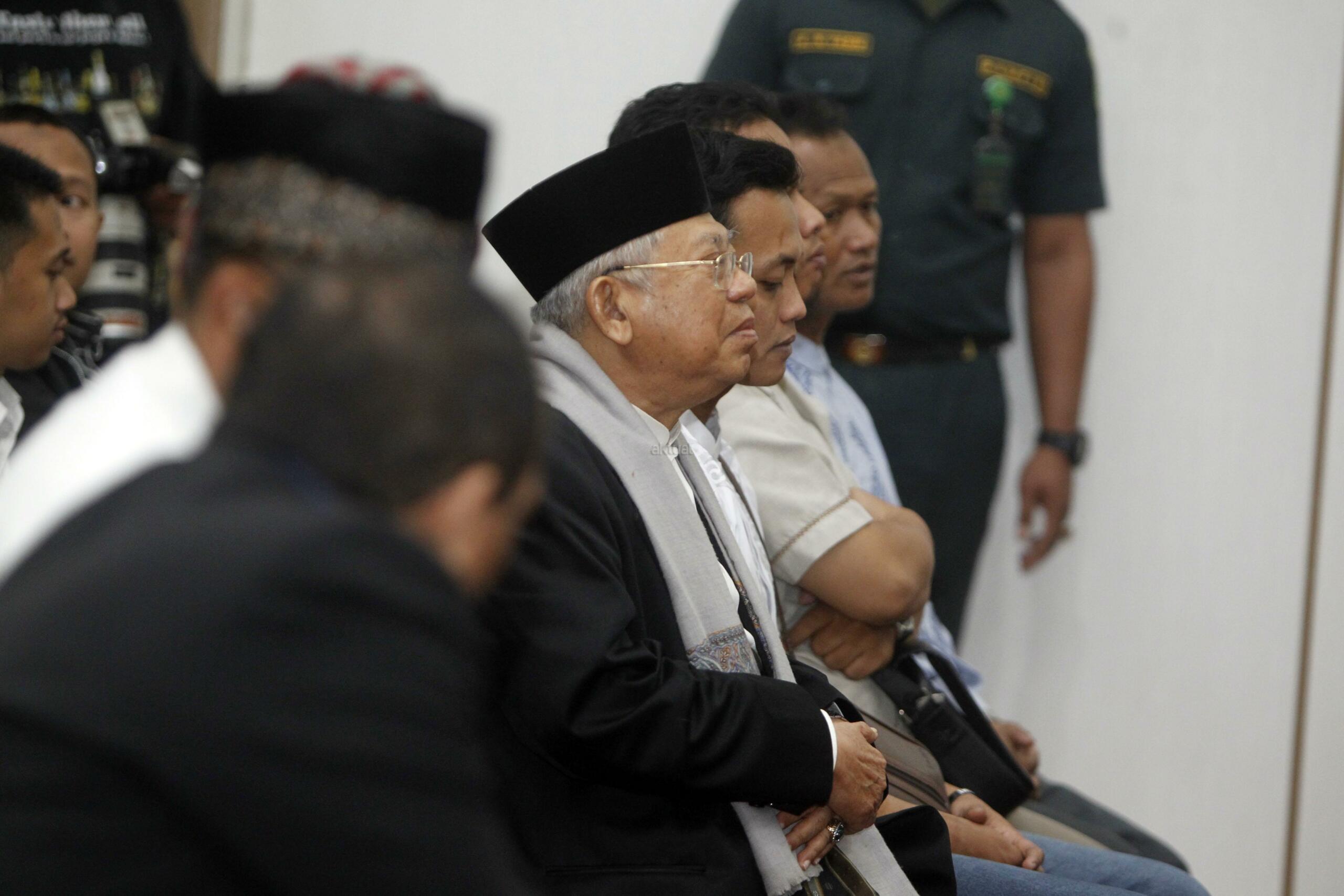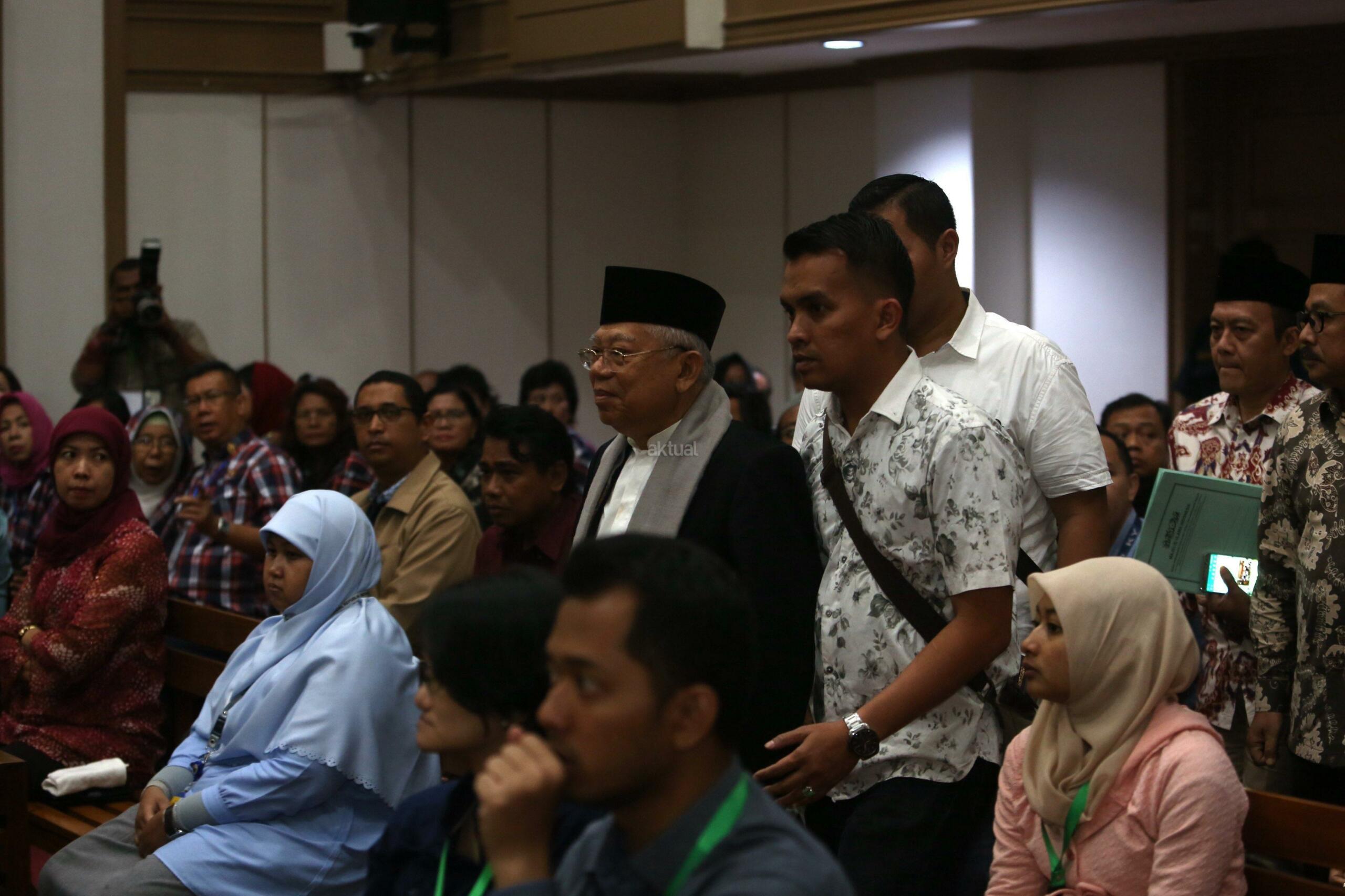 Ketua MUI Ma'aruf Amin hadir untuk bersaksi untuk Gubernur Non Aktif Basuki Tjahaja Purnama Dalam sidang Lanjutan Kasus Dugaan Penistaan Agama di Auditorium Kementrian Pertanian, Jakarta, Selasa, 31 Januari 2016. Sidang lanjutan yang ke delapan ini diagendakan mendengarkan keterangana saksi salah satunya ketua MUI, Ma'aruf Amin dan anggota KPUD DKI Jakarta Dahlia. Pool/Sindo/Irsa Triansyah