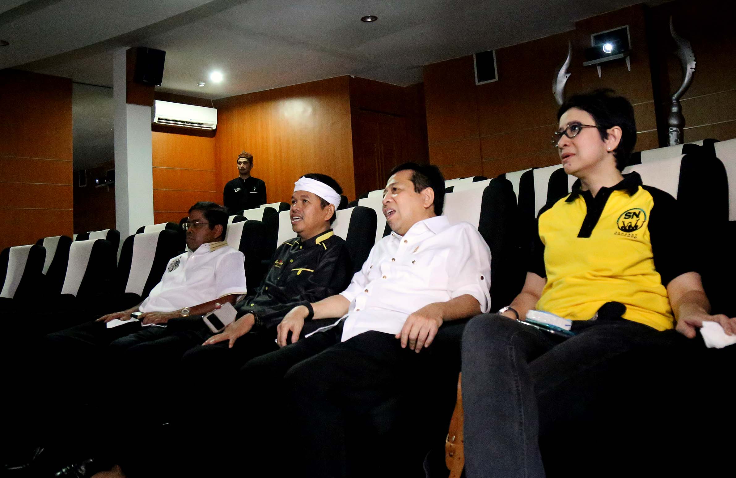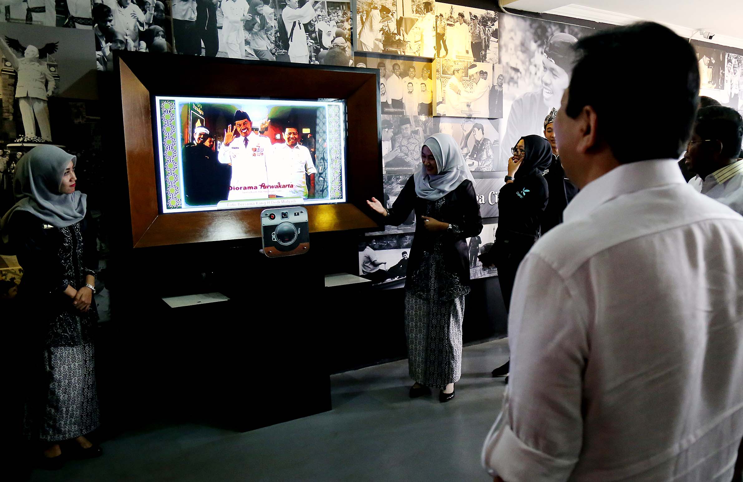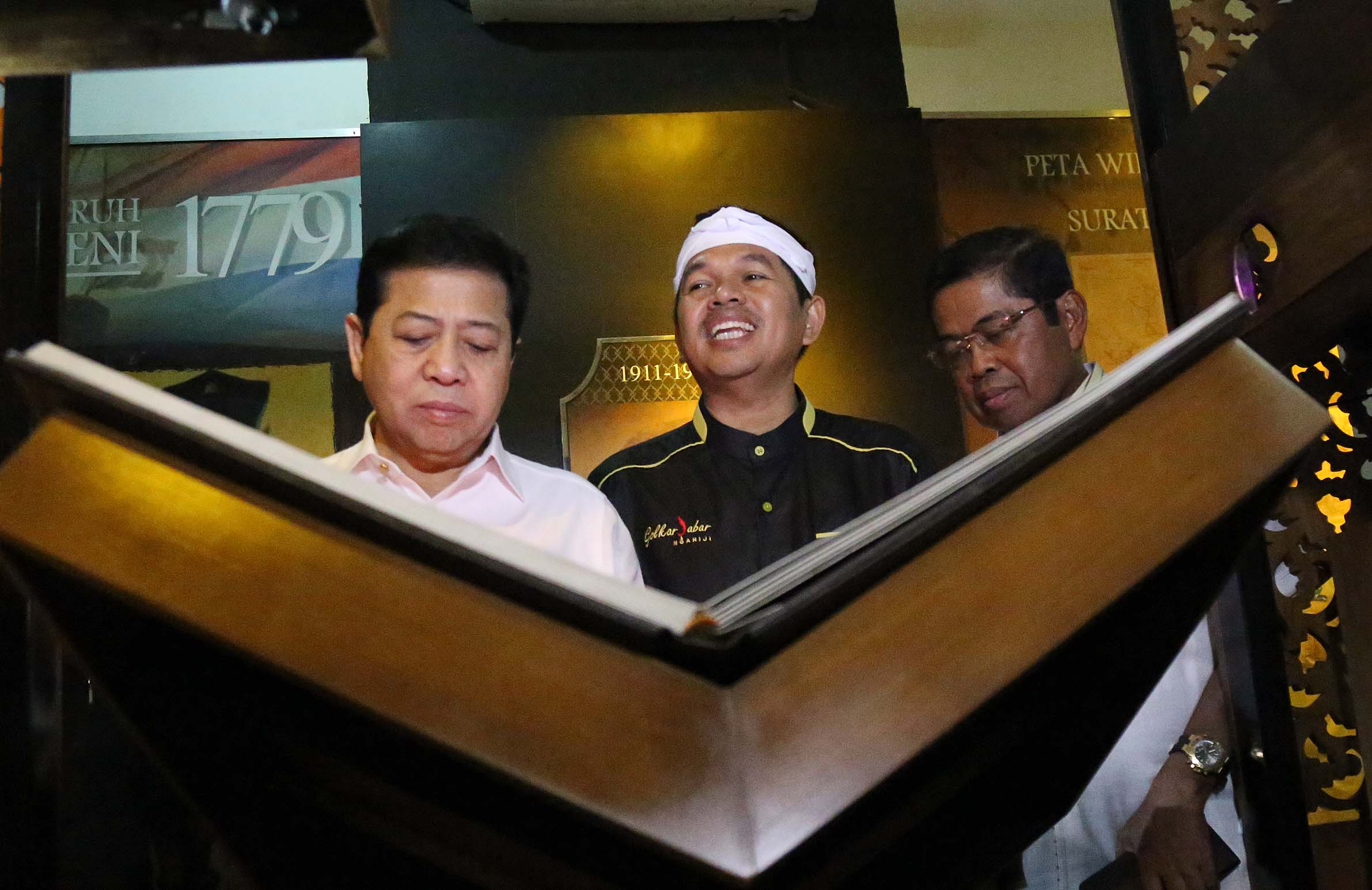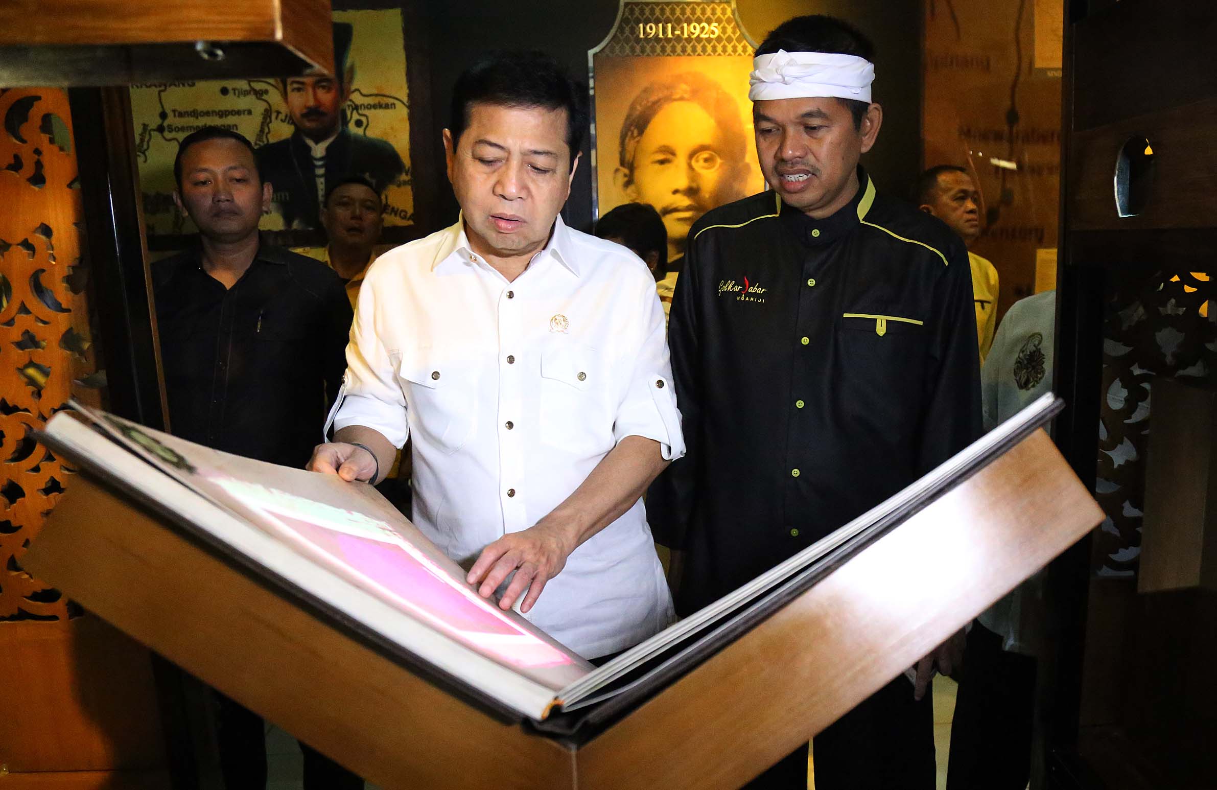 Ketua Umum Partai Golkar Setya Novanto didampingi Bupati Kabupaten Purwakarta Dedi Mulyadi membaca buku sejarah Sunda Museum Bale Panyawangan Diorama Purwakarta yang berada di Gedung Sadewa (Gedung Kembar Purwakarta), Jawa Barat, Kamis (23/6/2016). Setnov sempat mencoba beberapa alat peraga yang berada di dalam museum. Di antaranya adalah buku sejarah Sunda dan Purwakarta, sepeda ontel digital, dan terakhir menonton sejarah dan potensi Kabupaten Purwakarta yang berada di ruangan mini bioskop.