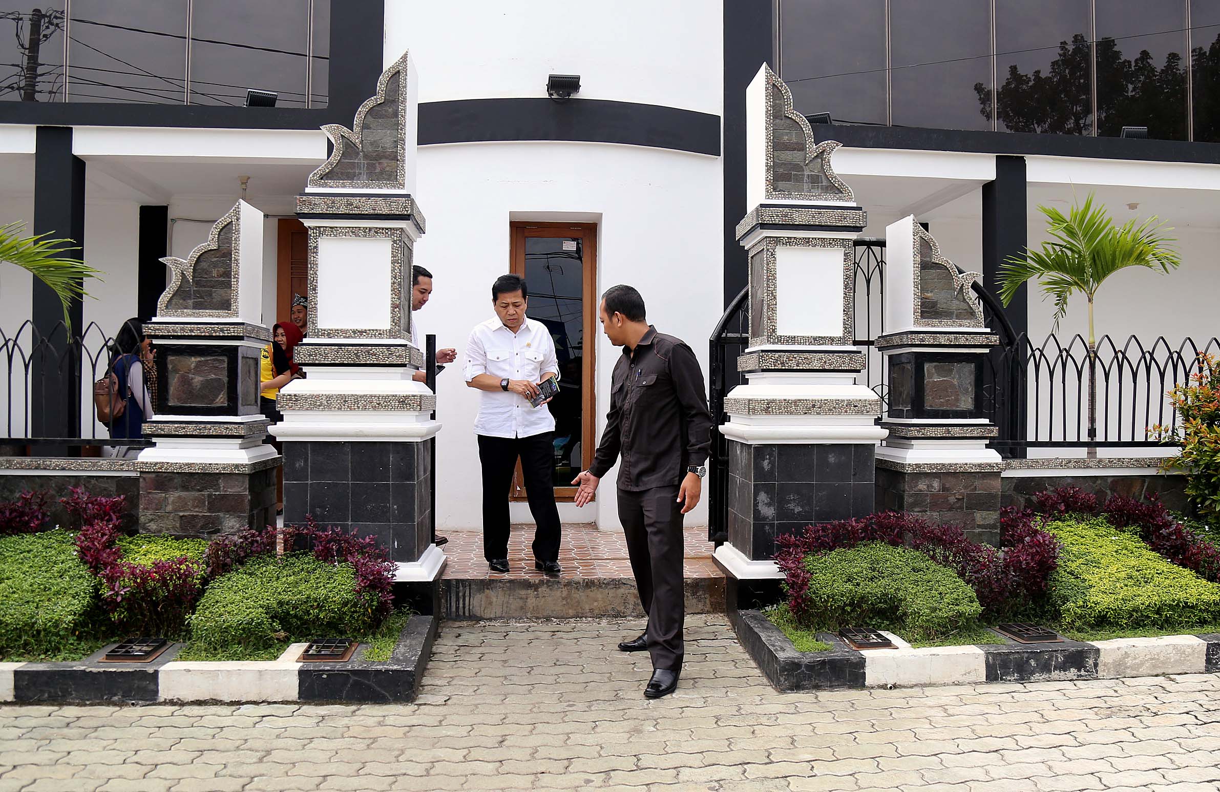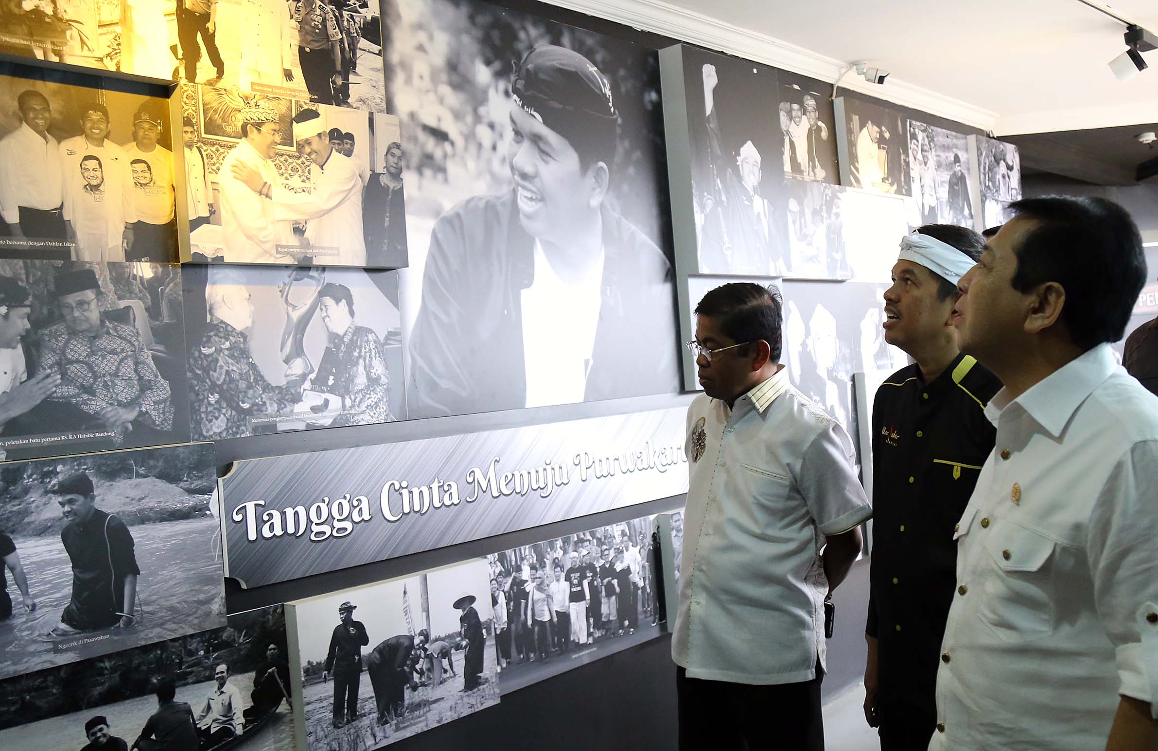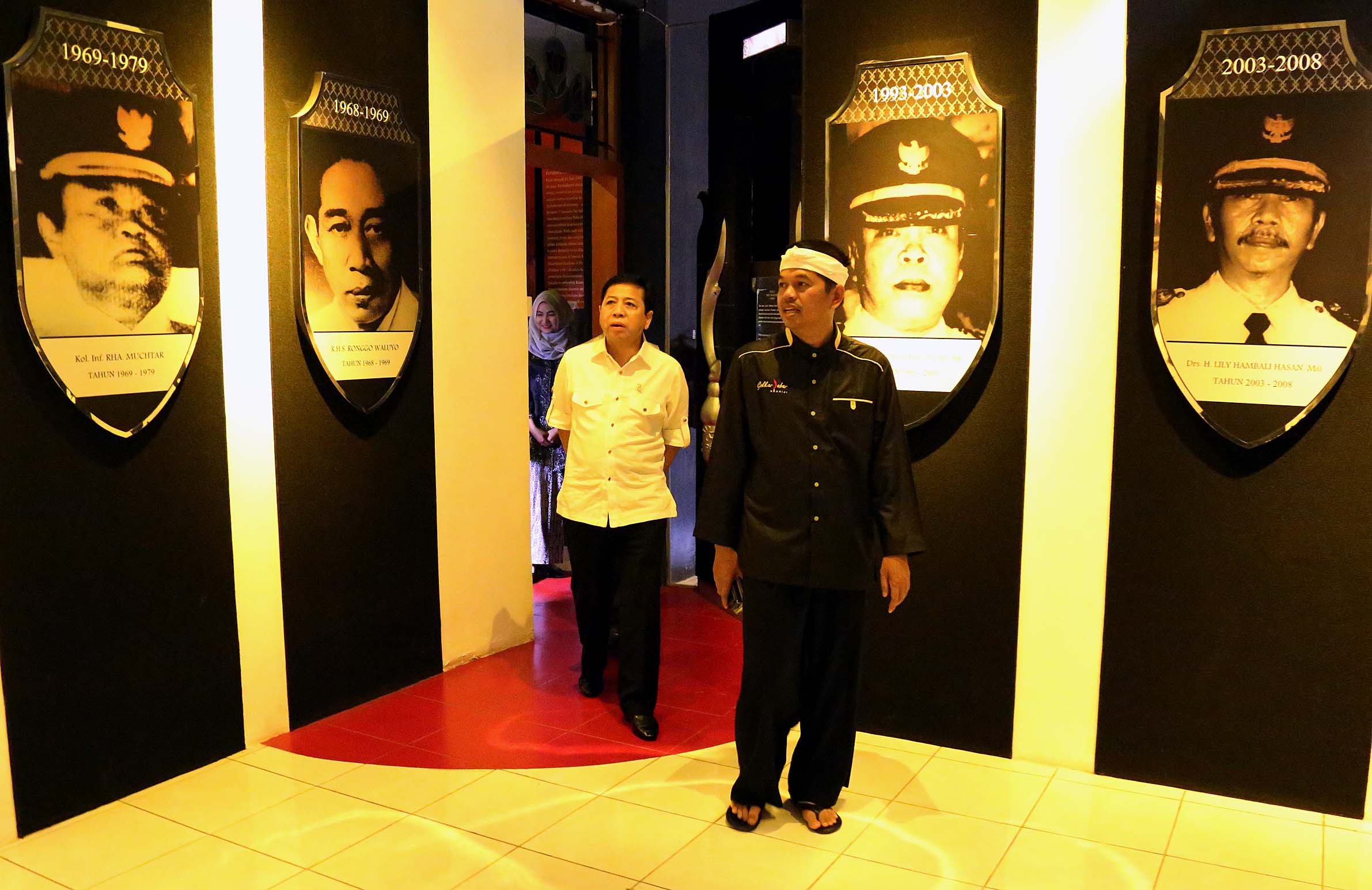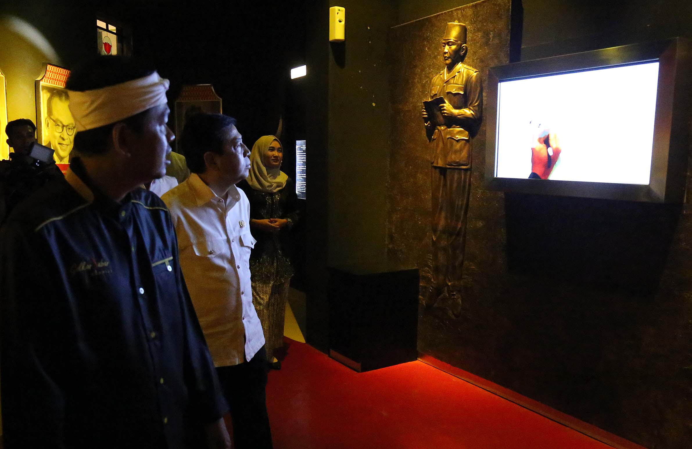 Ketua Umum Partai Golkar Setya Novanto didampingi Bupati Kabupaten Purwakarta Dedi Mulyadi membaca buku sejarah Sunda Museum Bale Panyawangan Diorama Purwakarta yang berada di Gedung Sadewa (Gedung Kembar Purwakarta), Jawa Barat, Kamis (23/6/2016). Setnov sempat mencoba beberapa alat peraga yang berada di dalam museum. Di antaranya adalah buku sejarah Sunda dan Purwakarta, sepeda ontel digital, dan terakhir menonton sejarah dan potensi Kabupaten Purwakarta yang berada di ruangan mini bioskop.