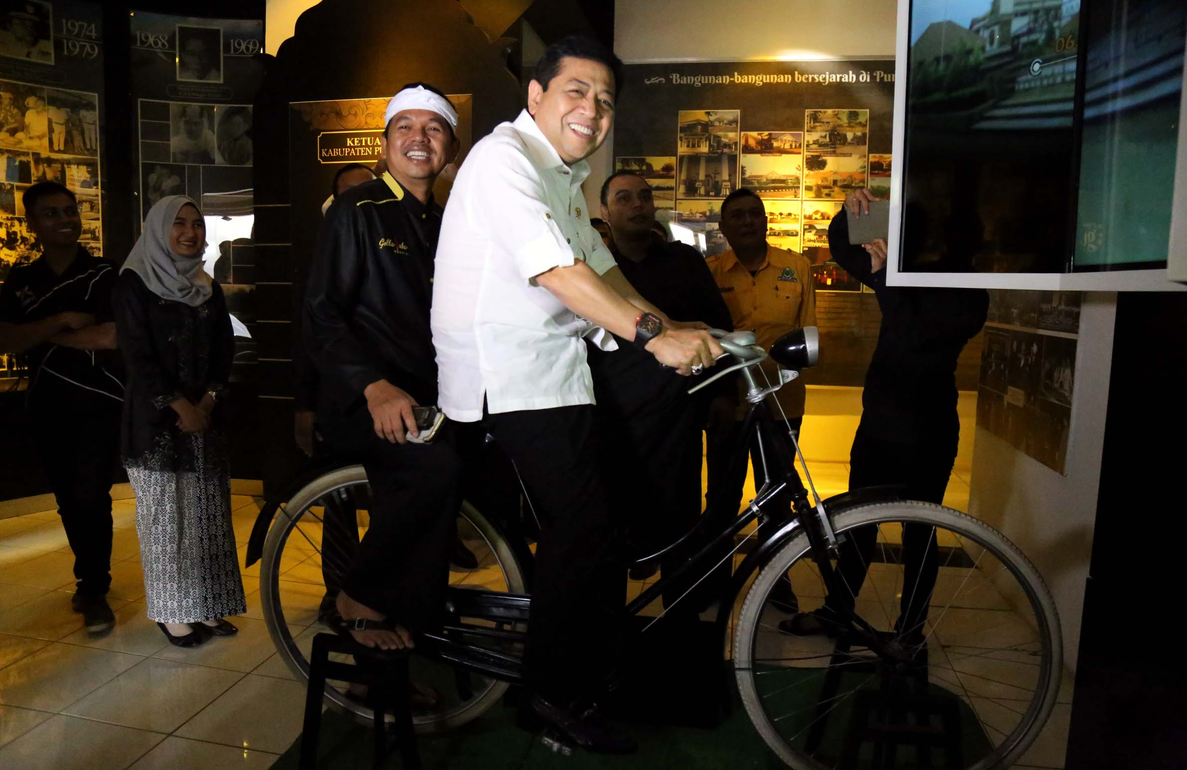 Ketua Umum Partai Golkar Setya Novanto memboncengi Bupati Kabupaten Purwakarta Dedi Mulyadi saat mencoba sepeda ontel digital Museum Bale Panyawangan Diorama Purwakarta yang berada di Gedung Sadewa (Gedung Kembar Purwakarta), Jawa Barat, Kamis (23/6/2016). Setnov sempat mencoba beberapa alat peraga yang berada di dalam museum. Di antaranya adalah buku sejarah Sunda dan Purwakarta, sepeda ontel digital, dan terakhir menonton sejarah dan potensi Kabupaten Purwakarta yang berada di ruangan mini bioskop.