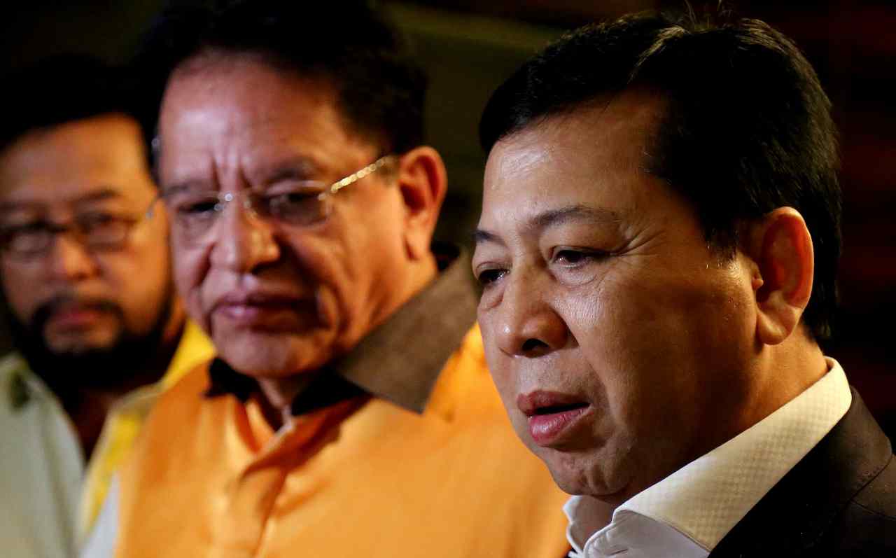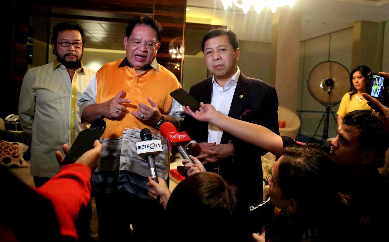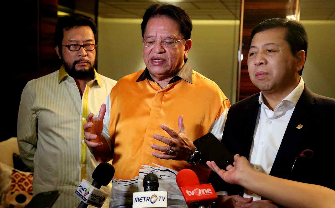 Ketua Umum DPP Partai Gokar Setya Novanto (kanan) Sekjen Partai United Malays National Organisation (UMNO) Datuk Sri Tengku Adnan Bin Tengku Mansor (tengah) saat memberikan keterengan persnya kepada awak media usai melakukan pertemuan di kediaman Ketua Umum Partai Gokar, di Jalan Wijaya XIII, Jakarta Selatan, Sabtu (23/7/2016). Dalam pertemuan tersebut melakukan beberapa kerjasama antara UMNO dan Golkar diantaranya Ketenagakerjaan dan Kemahasiswaan.