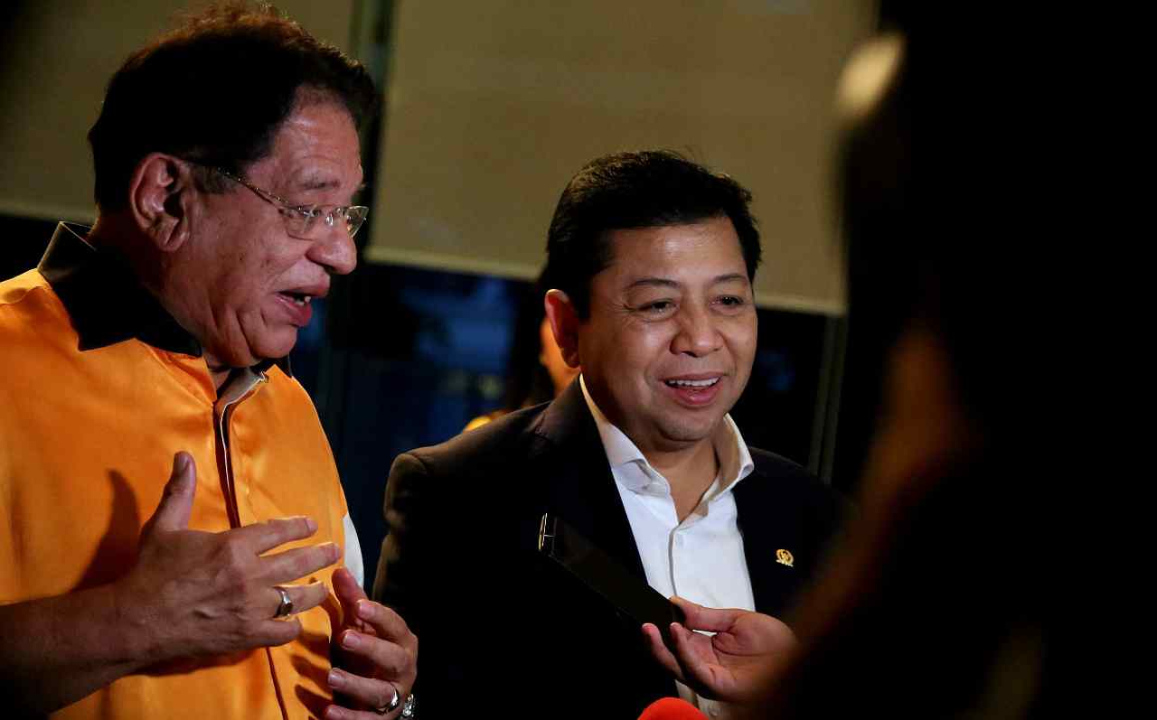 Kiri-kanan; Anggota DPR Komisi I Fraksi Golkar Meutya Hafid, Sekjen Partai United Malays National Organisation (UMNO) Datuk Sri Tengku Adnan Bin Tengku Mansor, Ketua Umum Partai Golkar Setya Novanto, Ketua Koordinator Bidang Politik, Hukum dan Keamanan Yoris Raweyai, usai melakukan pertemuan dengan Sekjen Partai United Malays National Organisation (UMNO) di kediaman Ketua Umum Partai Gokar, di Jalan Wijaya XIII, Jakarta Selatan, Sabtu (23/7/2016). Sekretaris Jenderal (Sekjen) Partai United Malays National Organisation (UMNO) Datuk Sri Tengku Adnan Bin Tengku Mansor bertemu dengan Ketua Umum DPP Partai Golkar Setya Novanto.