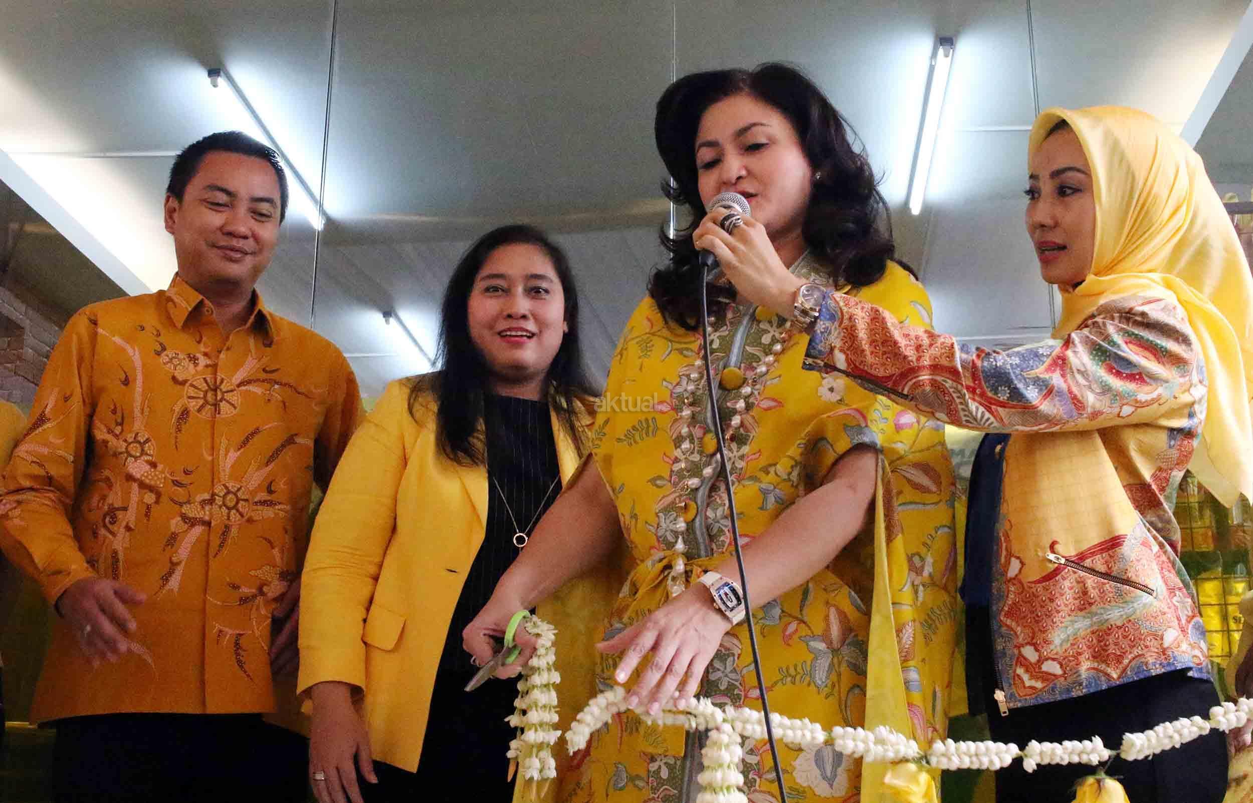 Ketua Umum Ikatan Istri Partai Golkar (IIPG) Deisti Astriani Novanto (tengah) didampingi para pengurus pusat IIPG menggunting pita dan sekaligus meresmikan warung Rumah Pangan Golkar (RPG) di kantor DPD I Partai Golkar DKI Jakarta, Kamis (6/10/2016). Rumah Pangan Golkar (RPG) ini salah satu program IIPG sebagai solusi sembako murah yg dekat dengan rakyat.